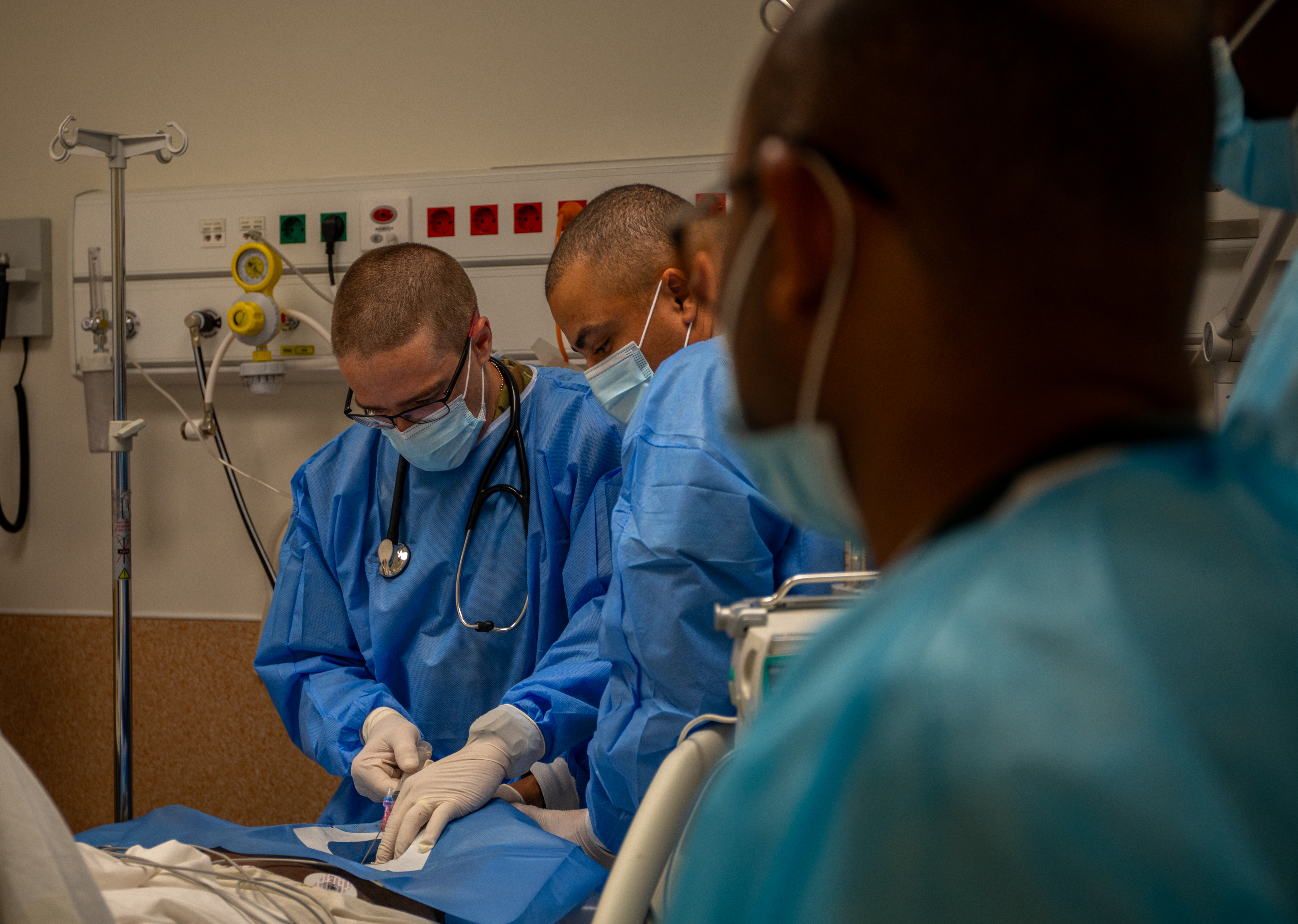 U.S. Army Spc. Joshua Ford, a combat medic (68W), inserts a central line, providing the medical team with direct access to administer medication to the patient. Ford, assigned to the 934th Forward Resuscitative Surgical Detachment, worked alongside Angolan military health professionals in the emergency room during the Medical Readiness Exercise (MEDREX) in Luanda, Angola, July 9, 2024.