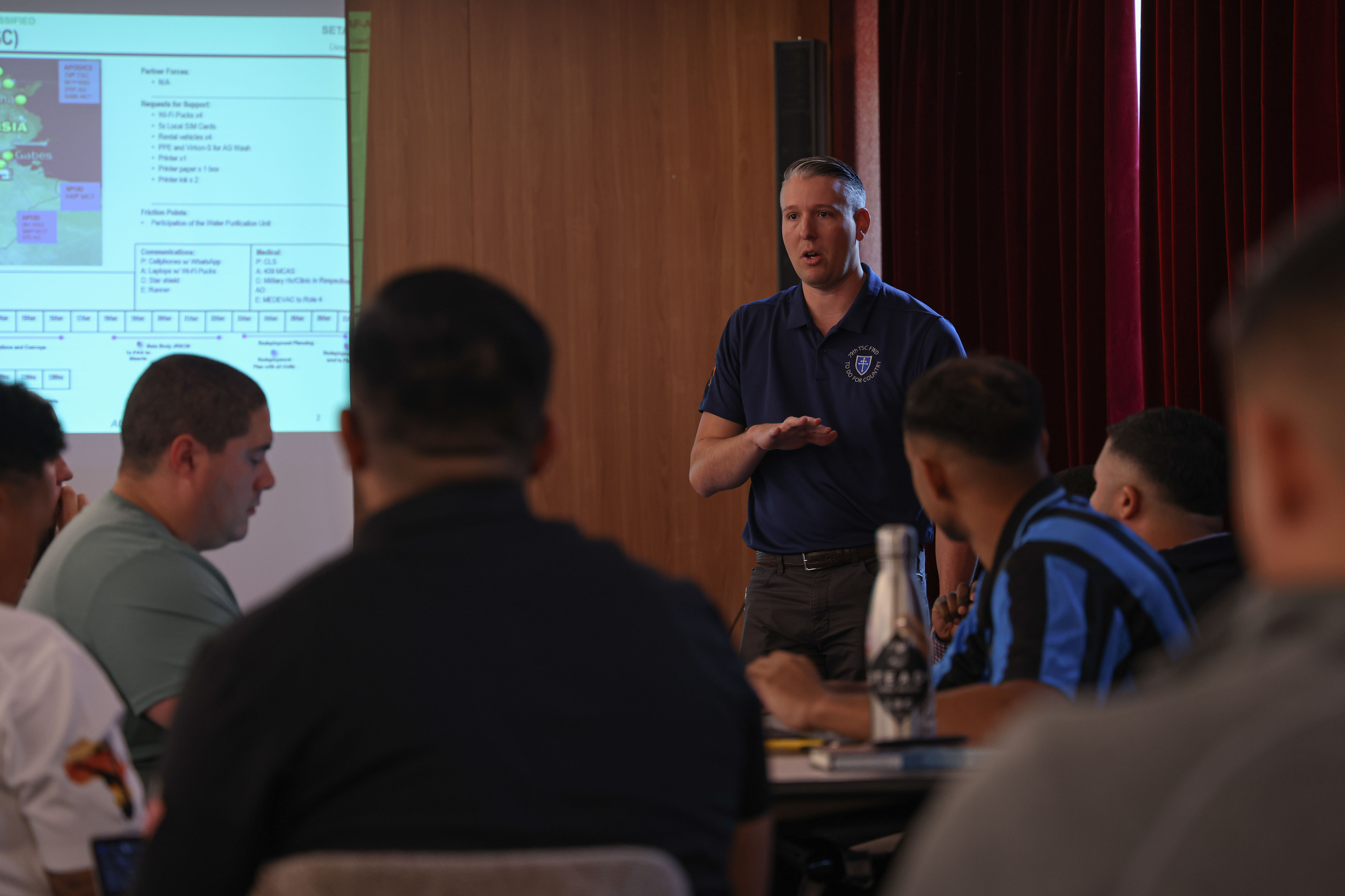 U.S. Army Lt. Col. Travis Michelena, logistics planner, 79th Theater Sustainment Command, speaks during the Tunisian-spoke mid planning event for exercise African Lion 2025 (AL25), at the Alfa Fiera Hotel, Vicenza, Italy, Nov. 13, 2024. AL25 is U.S. Africa Command's largest, premier, joint, combined annual exercise hosted by Morocco, Ghana, Senegal and Tunisia. More than 7,500 participants from 28 nations and NATO train together with a focus on enhancing readiness for U.S. and partner-nation forces. AL25 is a joint all-domain, multi-component, and multinational exercise, employing a full array of mission capabilities with the goal to strengthen interoperability among participants and set the theater for strategic access. (U.S. Army photo by Spc. Ivan Hernandez)