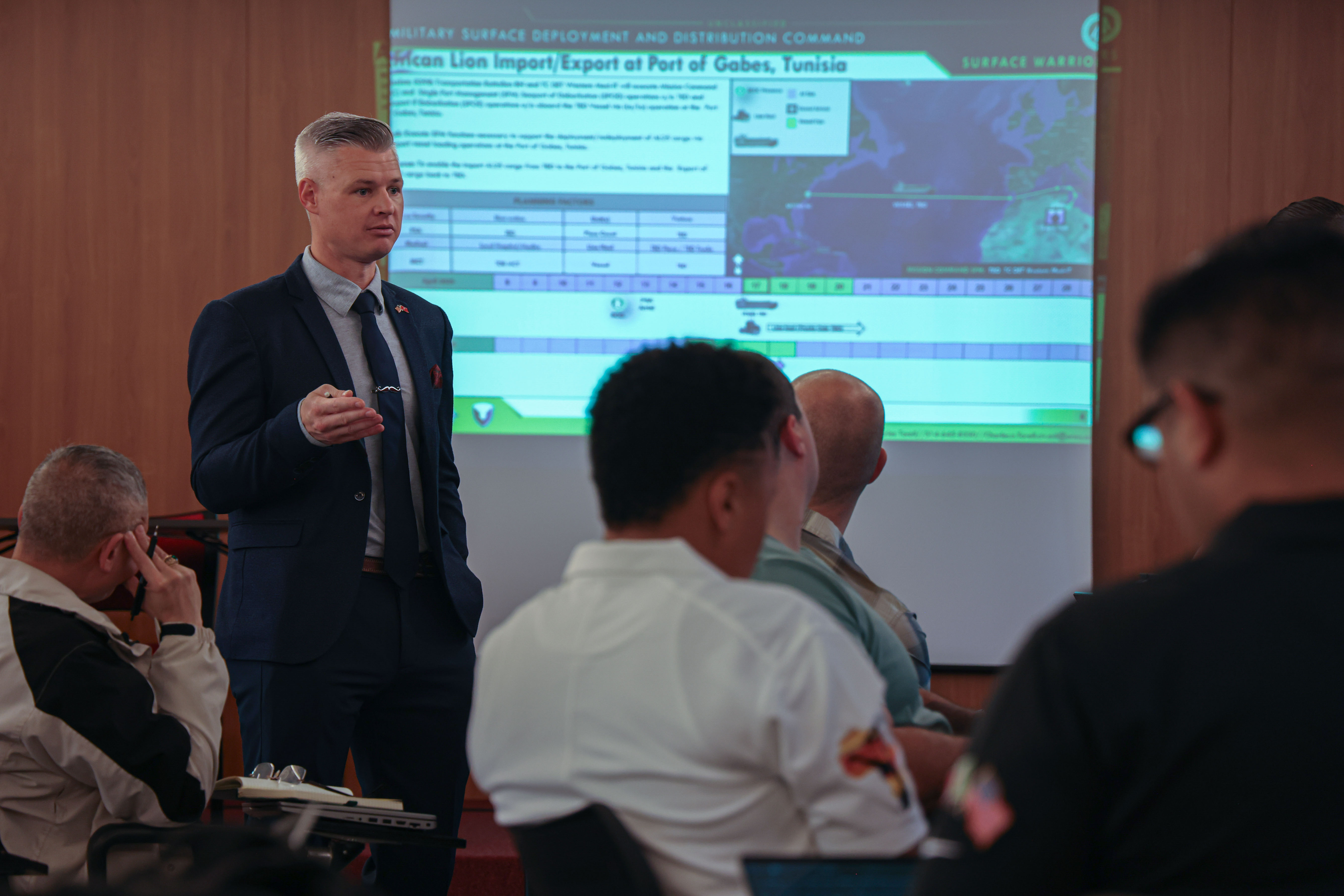 U.S. Army Maj. Joshua Veal, logistics planner, 79th Theater Sustainment Command, speaks during the Tunisian-spoke mid planning event for exercise African Lion 2025 (AL25), at the Alfa Fiera Hotel, Vicenza, Italy, Nov. 13, 2024. AL25 is U.S. Africa Command's largest, premier, joint, combined annual exercise hosted by Morocco, Ghana, Senegal and Tunisia. More than 7,500 participants from 28 nations and NATO train together with a focus on enhancing readiness for U.S. and partner-nation forces. AL25 is a joint all-domain, multi-component, and multinational exercise, employing a full array of mission capabilities with the goal to strengthen interoperability among participants and set the theater for strategic access. (U.S. Army photo by Spc. Ivan Hernandez)