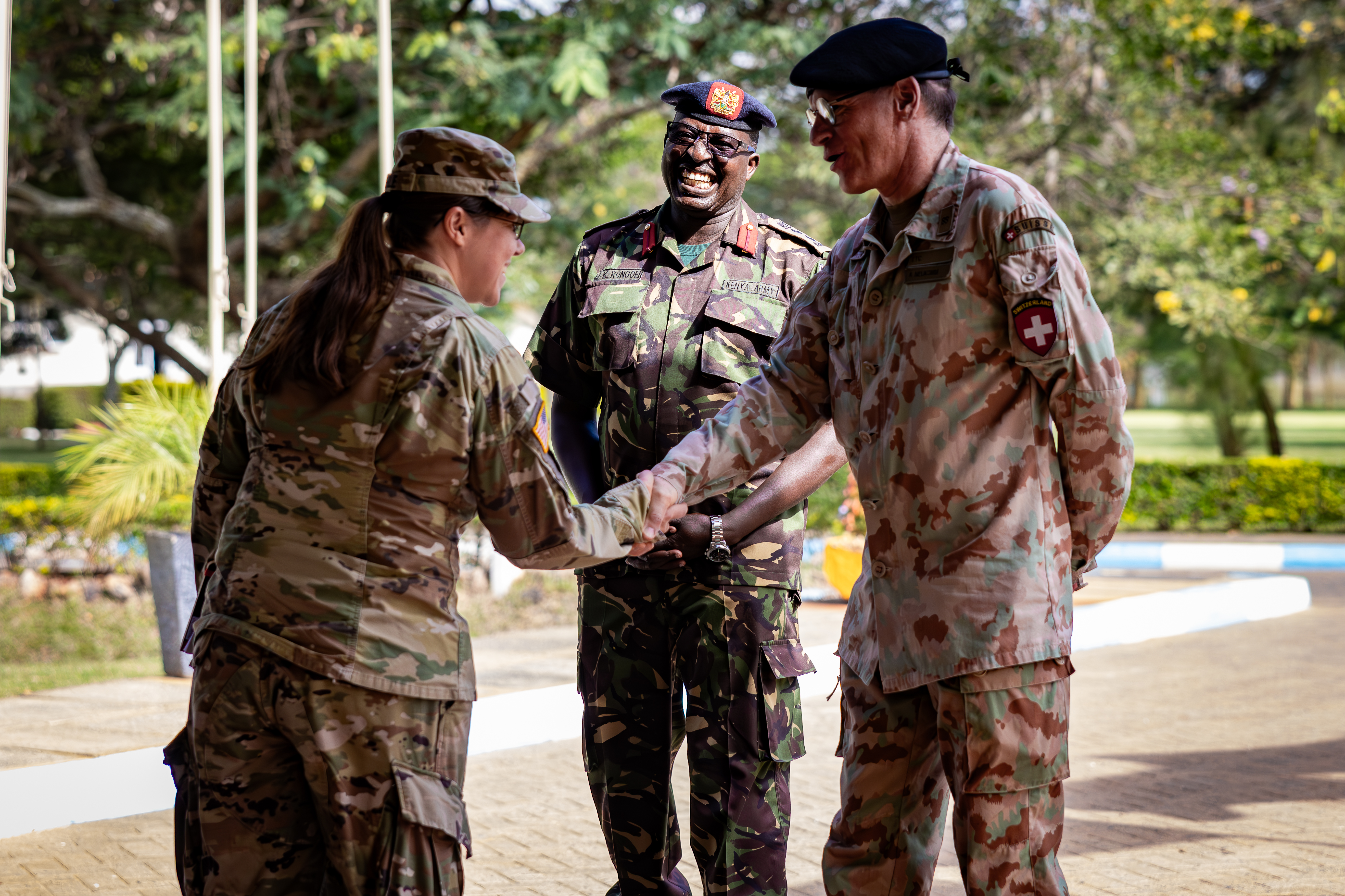 U.S. Army Lt. Col. Trish Basile, Chief of the Kenya United States Liaison Office (KUSLO), and Col. Jonathan Rungwe, Commandant of the Humanitarian Peace Support School (HPSS), welcome a Swiss service member with a handshake during the opening ceremony of Exercise Justified Accord 2025 (JA25) at HPSS in Nairobi, Kenya, Feb. 10, 2025. JA25 is the premier U.S. Africa Command (USAFRICOM) exercise in East Africa, designed to enhance multinational combat readiness, strengthen crisis response capabilities and empower allies and partners in the region. Led by U.S. Army Southern European Task Force, Africa (SETAF-AF) and hosted in Kenya, Djibouti and Tanzania, JA25 integrates high-intensity training scenarios that sharpen warfighting skills, increase operational reach and enhance the ability to execute complex joint and multinational operations. The exercise runs from Feb. 10–21, 2025. (U.S. Army photo Sgt. 1st Class Solomon Navarro)