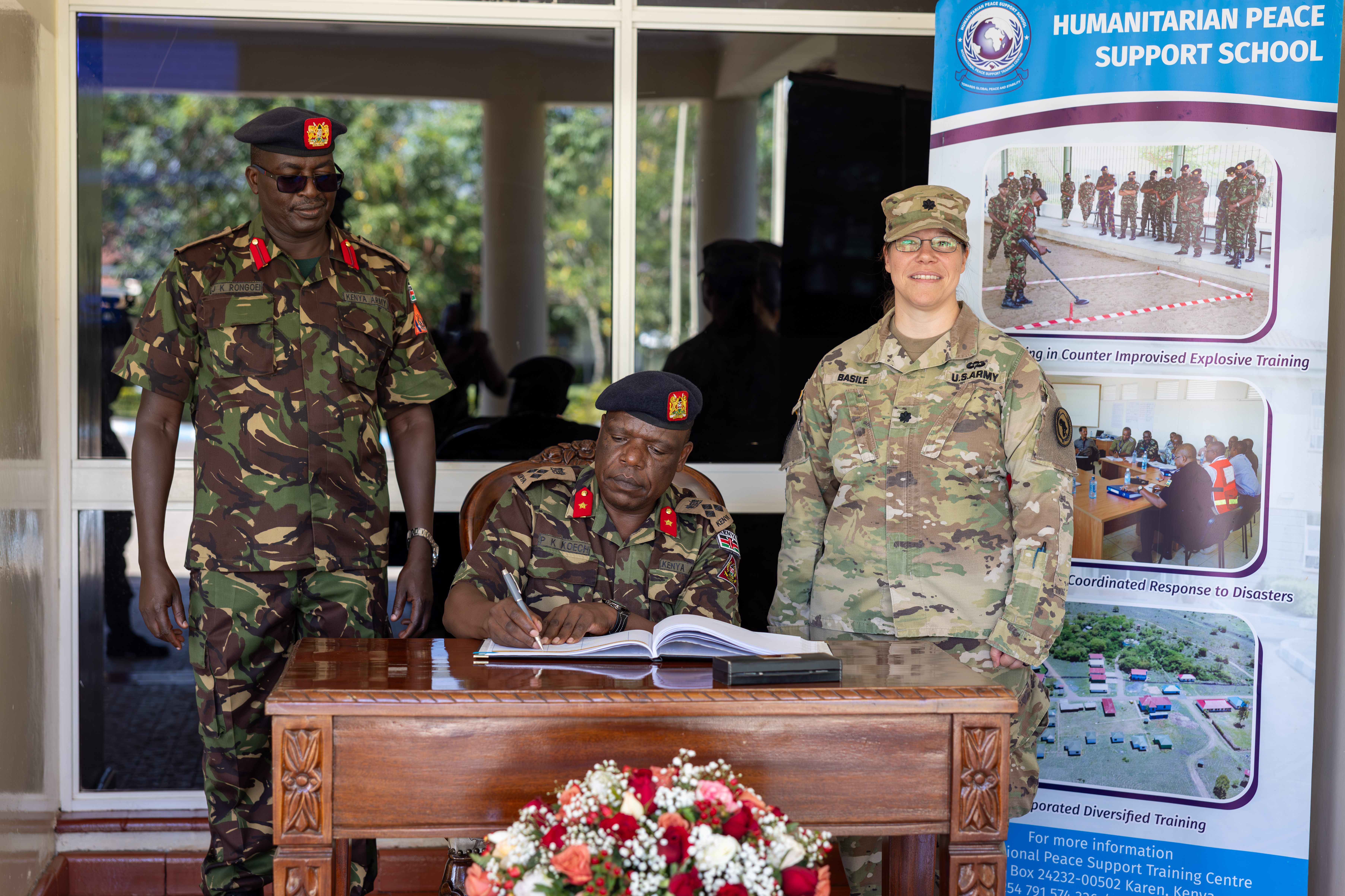 Kenya Defence Forces (KDF) Brigadier Gen. Paul Koech, chief of training at Kenya Defence Headquarters, formally opens exercise Justified Accord 2025 (JA25) by signing a proclamation at the Humanitarian Peace Support School (HPSS) in Nairobi, Kenya, Feb. 10, 2025. U.S. Army Lt. Col. Trish Basile, chief of the Kenya U.S. Liaison Office (KUSLO), and KDF Col. John Rongoei, commandant of HPSS, stand together as witnesses during the signing ceremony at HPSS. JA25 is the premier U.S. Africa Command (USAFRICOM) exercise in East Africa, designed to enhance multinational combat readiness, strengthen crisis response capabilities and empower allies and partners in the region. Led by U.S. Army Southern European Task Force, Africa (SETAF-AF) and hosted in Kenya, Djibouti and Tanzania, JA25 integrates high-intensity training scenarios that sharpen warfighting skills, increase operational reach and enhance the ability to execute complex joint and multinational operations. The exercise runs from Feb. 10–21, 2025. (U.S. Army photo by Sgt. 1st Class Solomon Navarro)