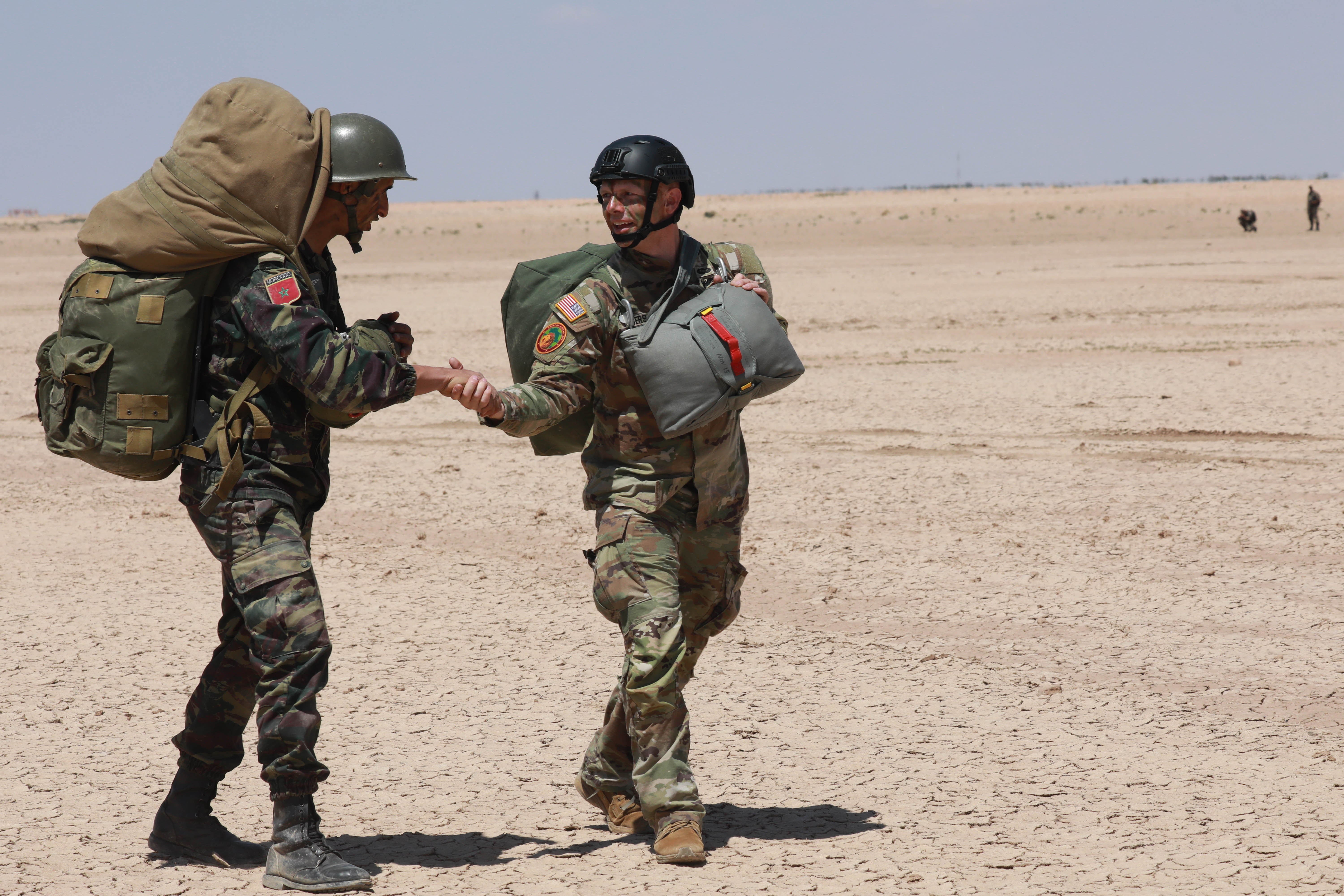 Paratroopers with 19th Special Forces Group (Airborne), 9th Psychological Operations Battalion, Utah National Guard, and 2e Brigade d’infanterie Parachutiste (2e BIP), Moroccan Royal Armed Forces, greet each other in the drop zone near Ben Guerir, Morocco, after a successful combined airborne operation during African Lion 2024 (AL24). AL24 marks the 20th anniversary of U.S. Africa Command’s premier joint exercise led by U.S. Army Southern European Task Force, Africa (SETAF-AF), running from April 19 to May 31 across Ghana, Morocco, Senegal and Tunisia, with over 8,100 participants from 27 nations and NATO contingents. (Image by U.S. Army Staff Sgt. Nathaniel Free)