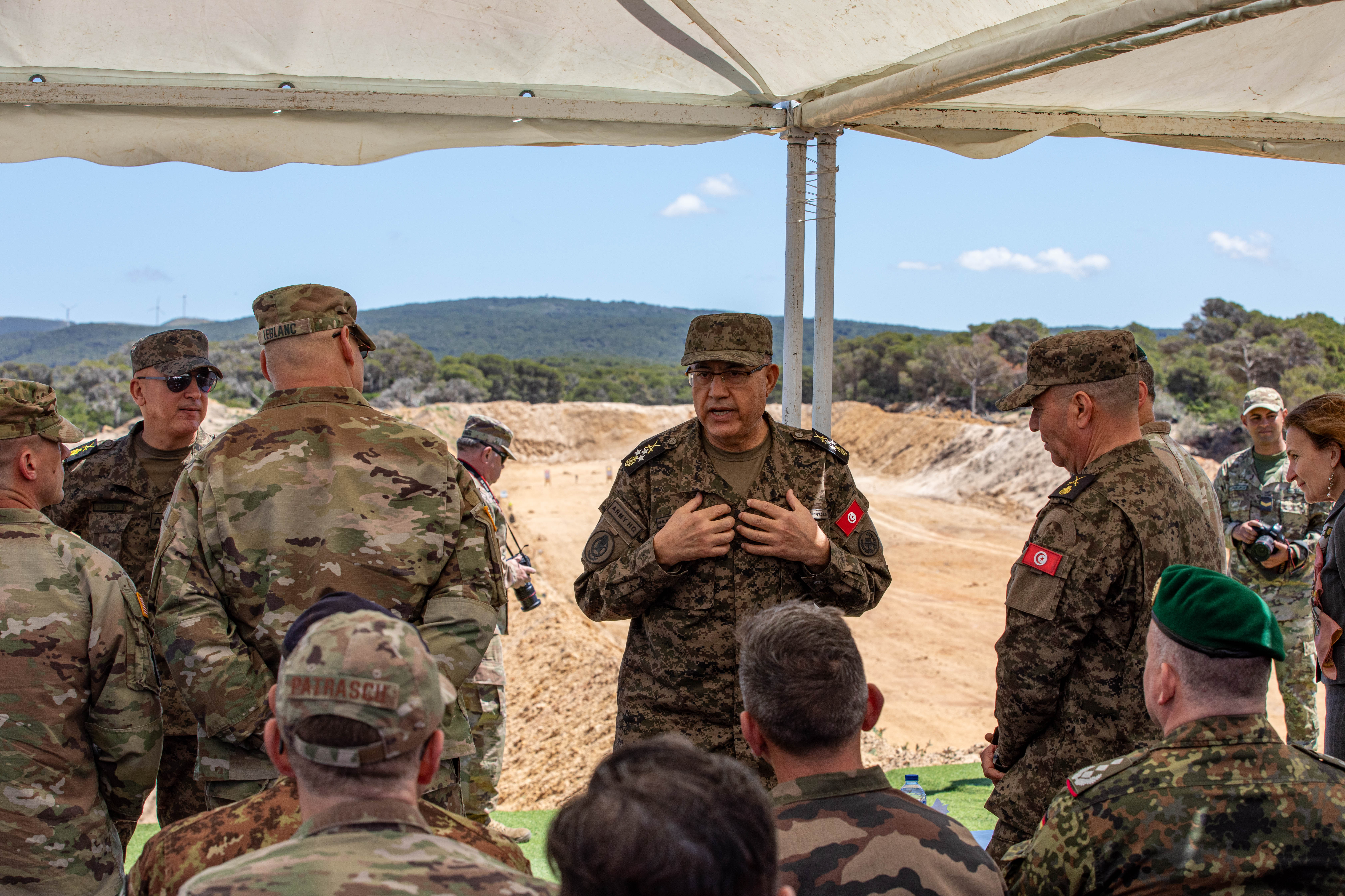 Maj. Gen. Mohamed El Ghoul, Army Chief of Staff, Tunisian Land Forces, addresses distinguished visitors at Camp Rimel, Bizerte, Tunisia, April 29, 2025, during exercise African Lion 2025 (AL25). Tunisian Armed Forces showcase their operational readiness through dynamic demonstrations, highlighting their capabilities in airborne operations; chemical, biological, radiological, and nuclear (CBRN) tactics and objective assaults during the demonstration at the conclusion of AL25 in Tunisia.