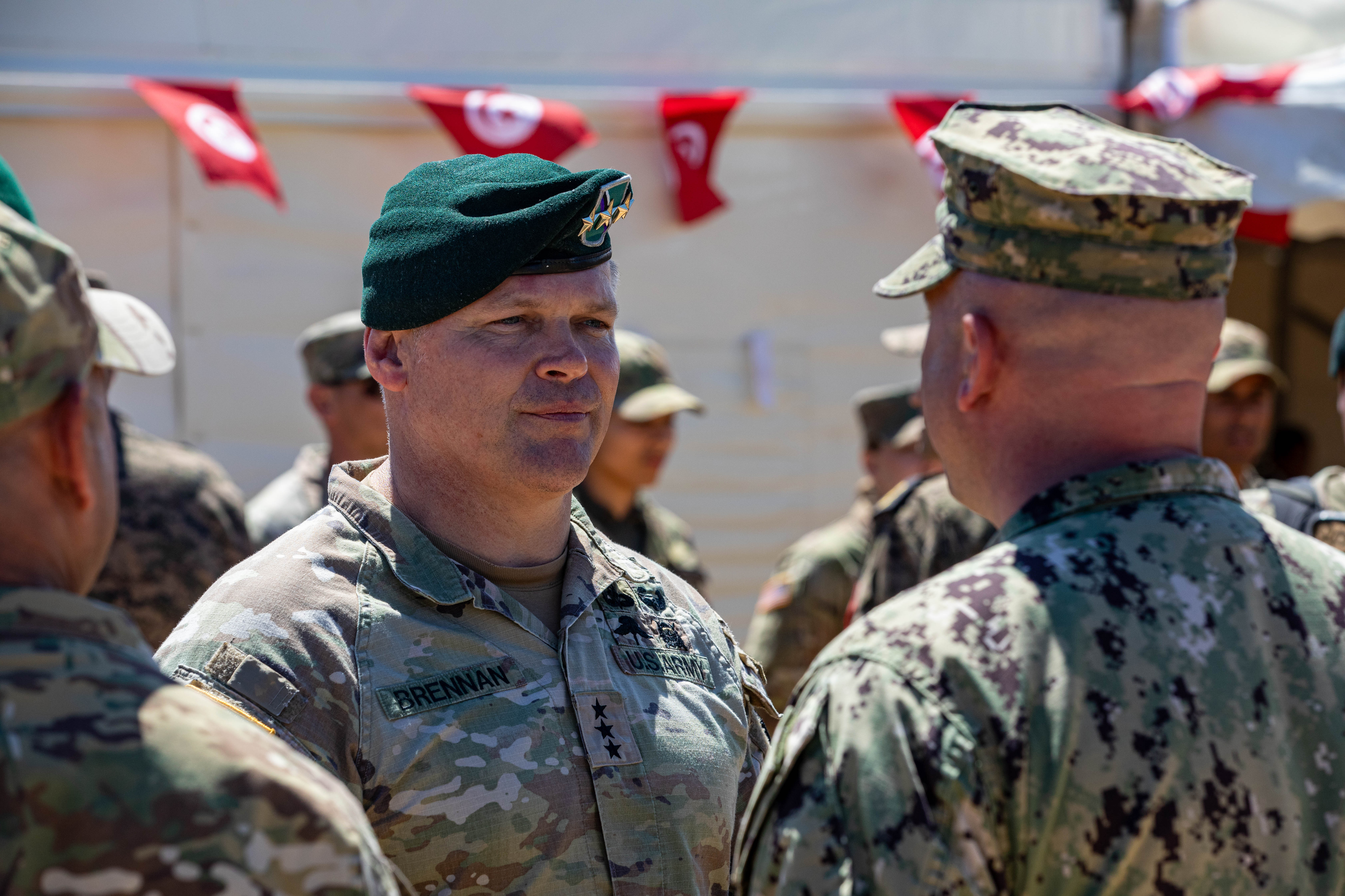 U.S. Army Lt. Gen. John W. Brennan, deputy commanding general of U.S. Africa Command (USAFRICOM) attends demonstration day at Camp Rimel, Bizerte, Tunisia, April 29, 2025, during exercise African Lion 2025, showcasing dynamic demonstrations and multinational cooperation. AL25 is set to be the largest annual military exercise in Africa, bringing together over 40 nations, including seven NATO allies and 10,000 troops to conduct realistic, dynamic and collaborative training in an austere environment that intersects multiple geographic and functional combatant commands. Led by U.S. Army Southern European Task Force, Africa (SETAF-AF) on behalf of the U.S. Africa Command, AL25 takes place from April 14 to May 23, 2025, across Ghana, Morocco, Senegal, and Tunisia. This large-scale exercise will enhance our ability to work together in complex, multi-domain operations—preparing forces to deploy, fight and win. (U.S. Army Reserve photo by 1st Sgt. Jay Townsend)