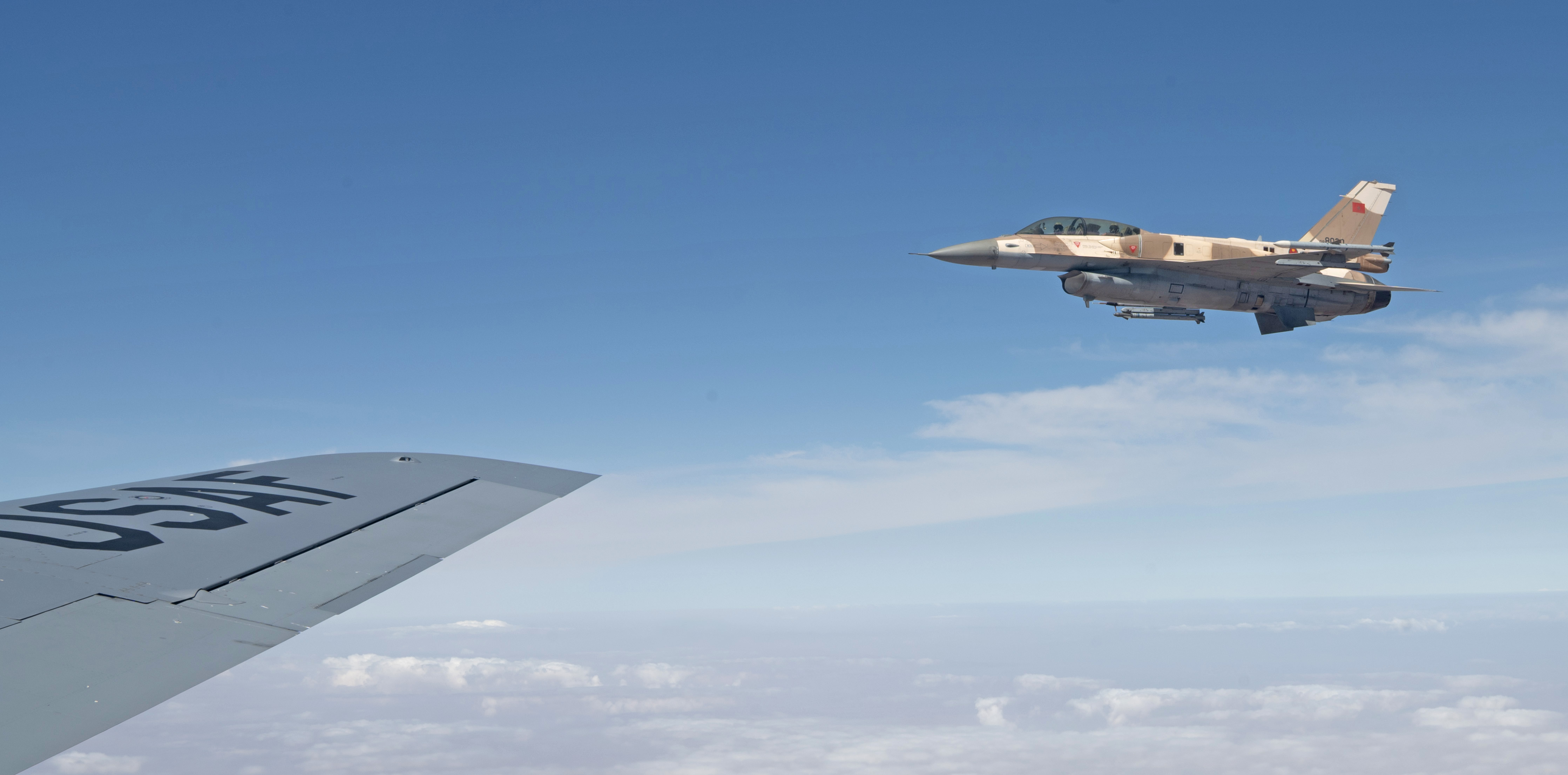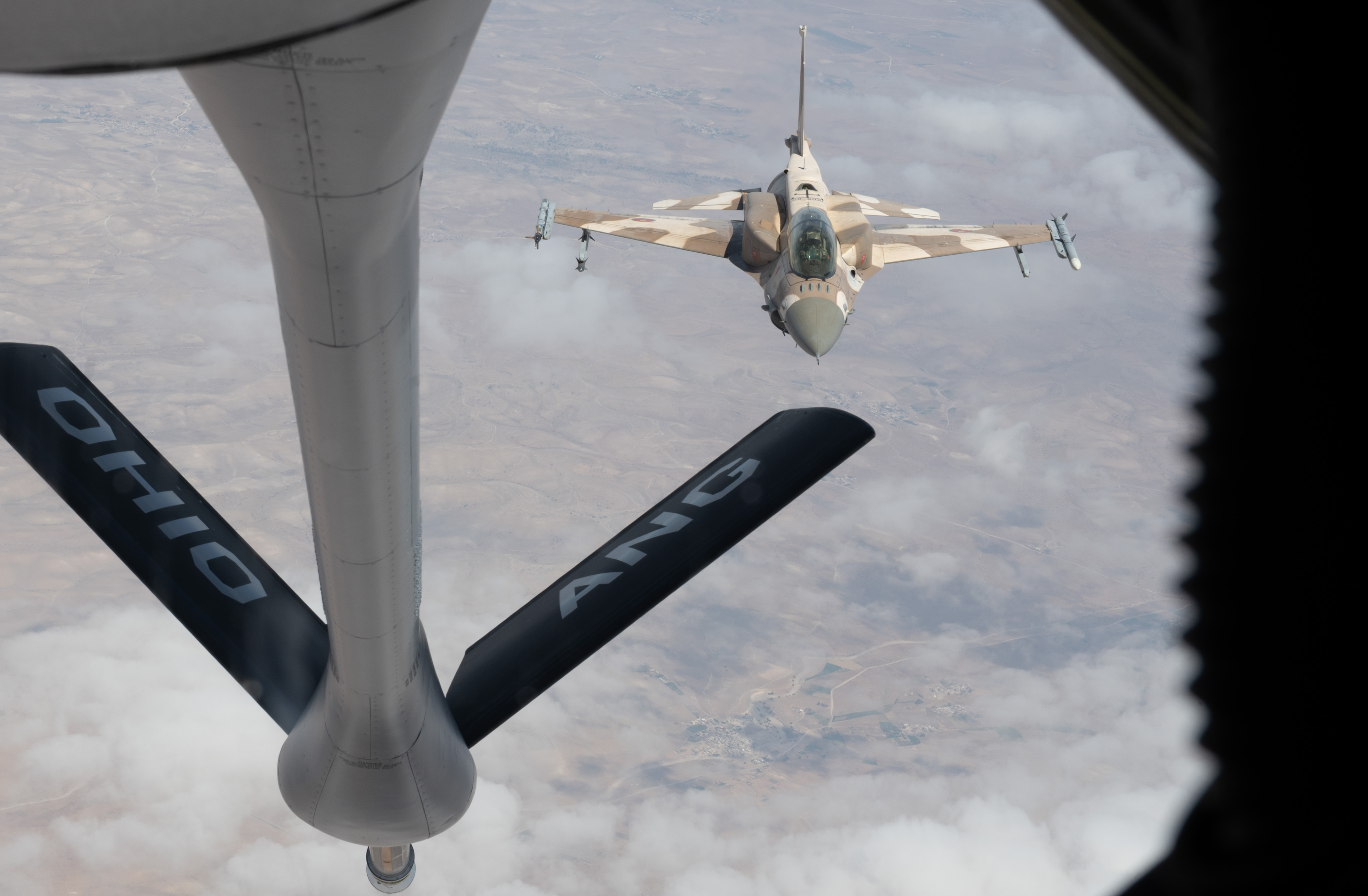 A Royal Moroccan Air Force F-16 Fighting Falcon flies next to a U.S. Air Force KC-135R Stratotanker assigned to the 166th Air Refueling Squadron, 121st Air Refueling Wing, Ohio Air National Guard, based in Rickenbacker Air National Guard, Ohio, as the aircraft waits its turn to simulate air-to-air refueling for currency and qualification during African Lion 2025 (AL25) in Morocco, May 13, 2025. AL25, the largest annual military exercise in Africa, brings together over 50 nations, including seven NATO allies and 10,000 troops to conduct realistic, dynamic and collaborative training in an austere environment that intersects multiple geographic and functional combatant commands. Led by U.S. Army Southern European Task Force, Africa (SETAF-AF,) on behalf of the U.S. Africa Command, AL25 takes place from April 14 to May 23, 2025, across Ghana, Morocco, Senegal, and Tunisia. This large-scale exercise will enhance our ability to work together in complex, multi-domain operations—preparing forces to deploy, fight and win. (U.S. Air Force photo by Tech. Sgt. Alexandra M. Longfellow)