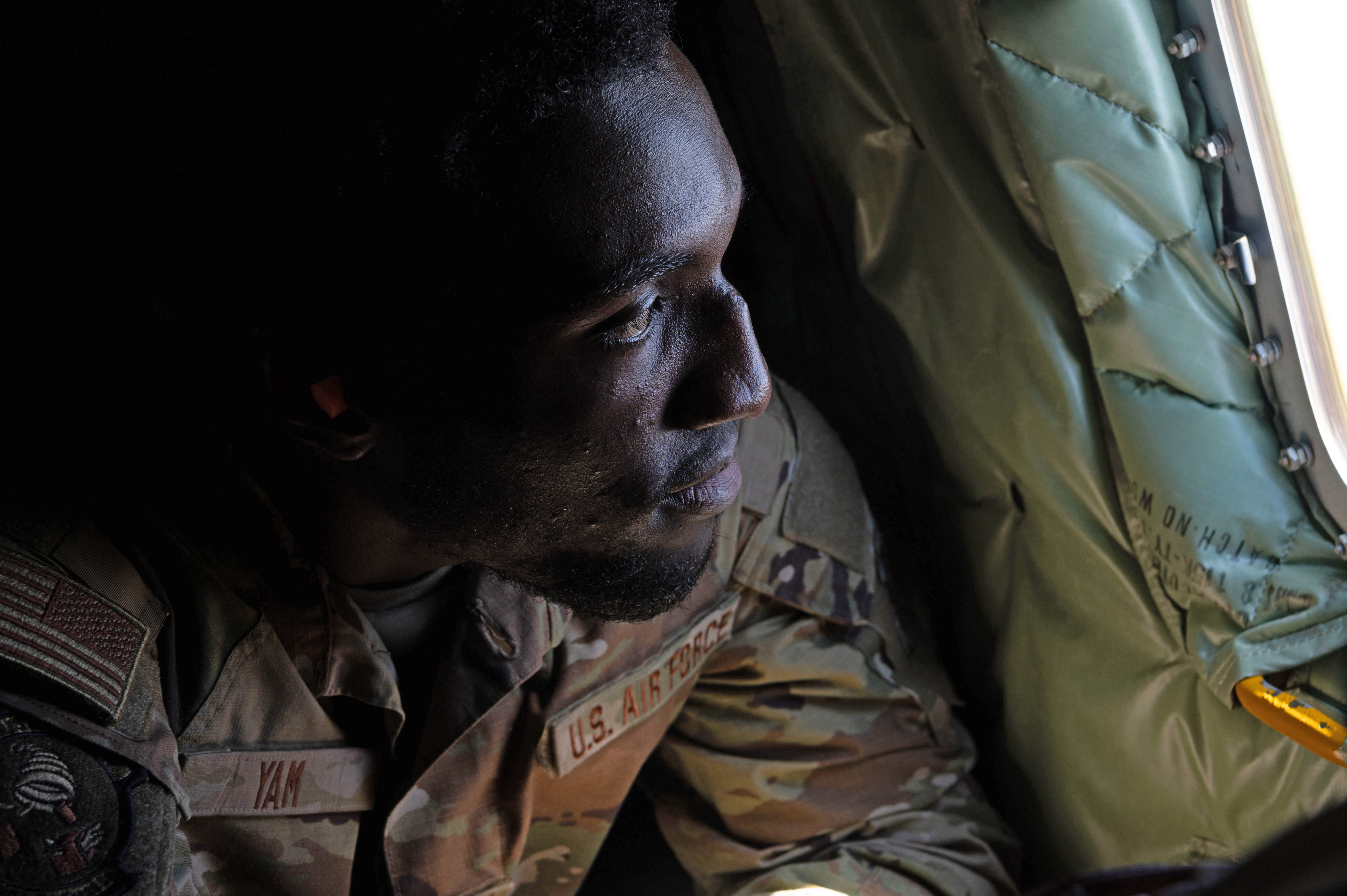 U.S. Air Force Senior Airman Abdoul Yam, a material management craftsman assigned to the 121st Logistics Readiness Squadron, 121st Air Refueling Wing (121st ARW), Ohio Air National Guard, looks out the window of a KC-135R Stratotanker assigned to the 166th Air Refueling Squadron, 121st ARW, based in Rickenbacker Air National Guard Base, Ohio, to watch 16 Royal Moroccan Air Force F-16 Fighting Falcons conduct simulated air-to-air refueling for currency and qualification during African Lion 2025 (AL25) in Morocco, May 13, 2025. AL25, the largest annual military exercise in Africa, brings together over 50 nations, including seven NATO allies and 10,000 troops to conduct realistic, dynamic and collaborative training in an austere environment that intersects multiple geographic and functional combatant commands. Led by U.S. Army Southern European Task Force, Africa (SETAF-AF,) on behalf of the U.S. Africa Command, AL25 takes place from April 14 to May 23, 2025, across Ghana, Morocco, Senegal, and Tunisia. This large-scale exercise will enhance our ability to work together in complex, multi-domain operations—preparing forces to deploy, fight and win. (U.S. Air Force photo by Tech. Sgt. Alexandra M. Longfellow)