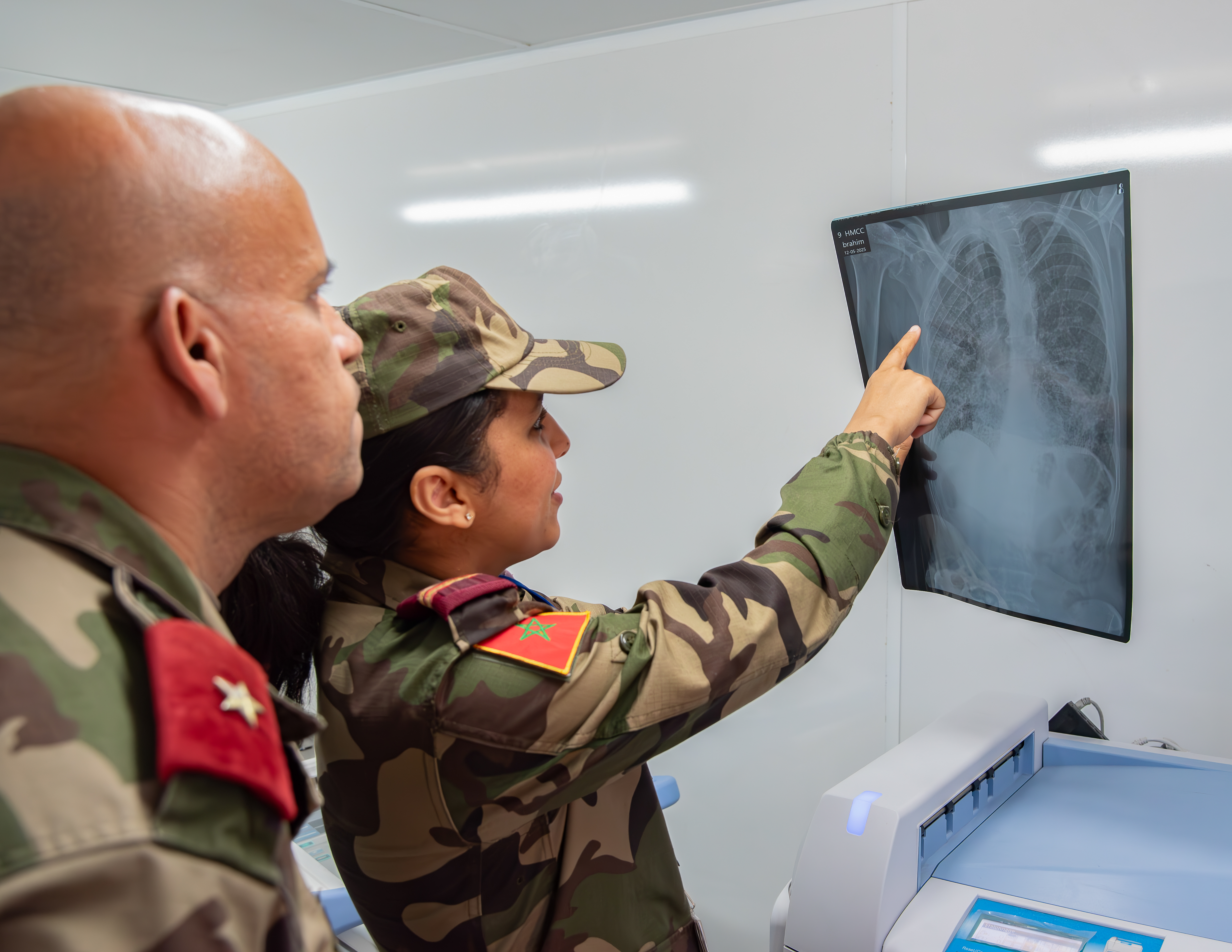 Members of the Royal Moroccan Armed Forces examine an x-ray of a patient's lungs at the Humanitarian Civic Assistance event in Anzi, Morocco, during African Lion 2025 (AL25) May 12, 2025. AL25, the largest annual military exercise in Africa, will take place from April 14 to May 23, 2025. Led by U.S. Africa Command with over 10,000 troops from more than 50 nations, including seven NATO allies, across Ghana, Morocco, Senegal, and Tunisia. The exercise aims to bolster military readiness, enhance lethality, and foster stronger partnerships, ultimately improving joint capabilities in complex multi-domain environments to enable participating forces to deploy, fight, and win. (U.S. Air National Guard photo by: Master Sgt. Nicholas Perez)