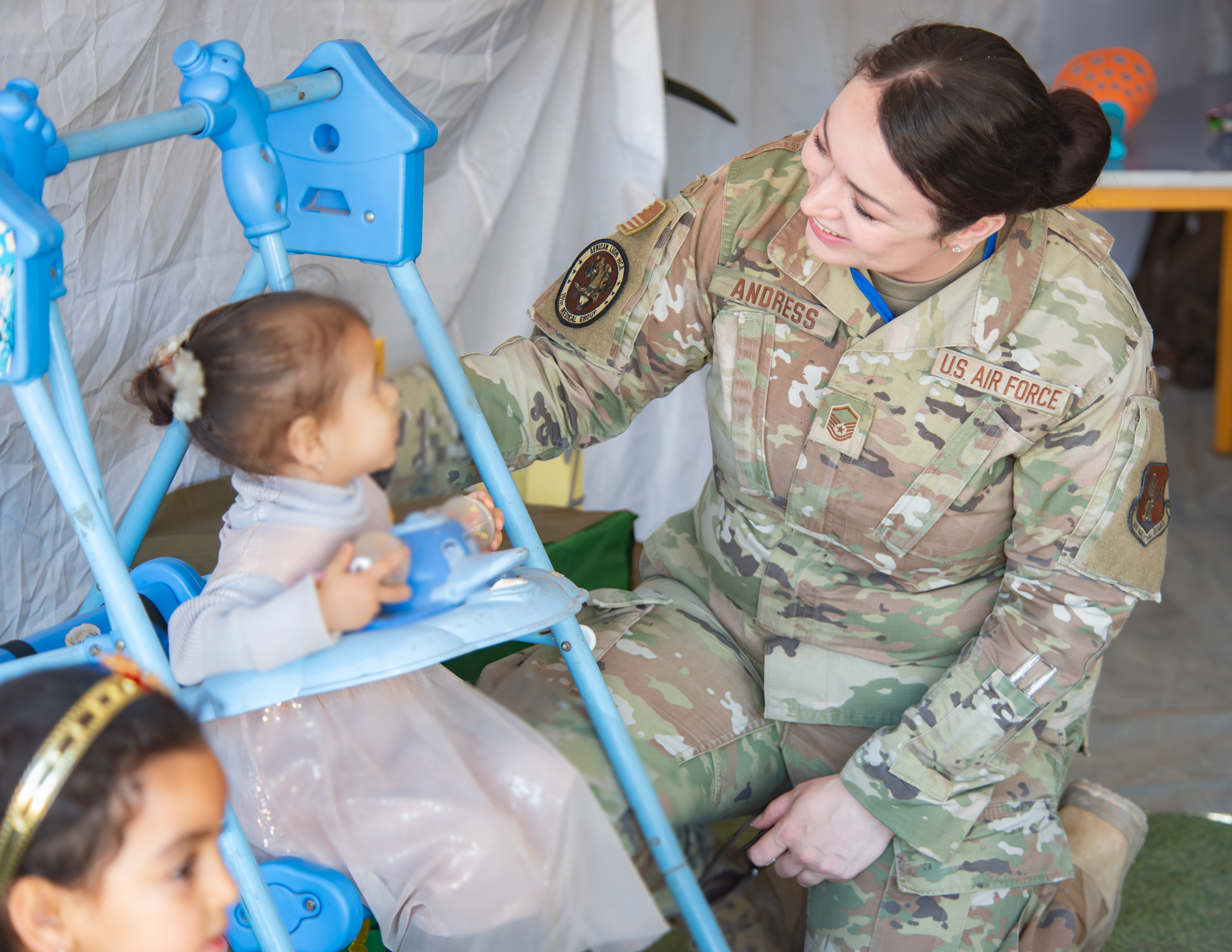U.S. Air Force Master Sgt. Shaundra Andress, 151st Wing, Utah Air National Guard, looks after children in the social tent while their parents are being treated at the Humanitarian Civic Assistance event in Anzi, Morocco, during African Lion 2025 (AL25) May 12, 2025. AL25, the largest annual military exercise in Africa, will take place from April 14 to May 23, 2025. Led by U.S. Africa Command with over 10,000 troops from more than 50 nations, including seven NATO allies, across Ghana, Morocco, Senegal, and Tunisia. The exercise aims to bolster military readiness, enhance lethality, and foster stronger partnerships, ultimately improving joint capabilities in complex multi-domain environments to enable participating forces to deploy, fight, and win. This photo was altered for patient privacy. (U.S. Air National Guard photo by: Master Sgt. Nicholas Perez)