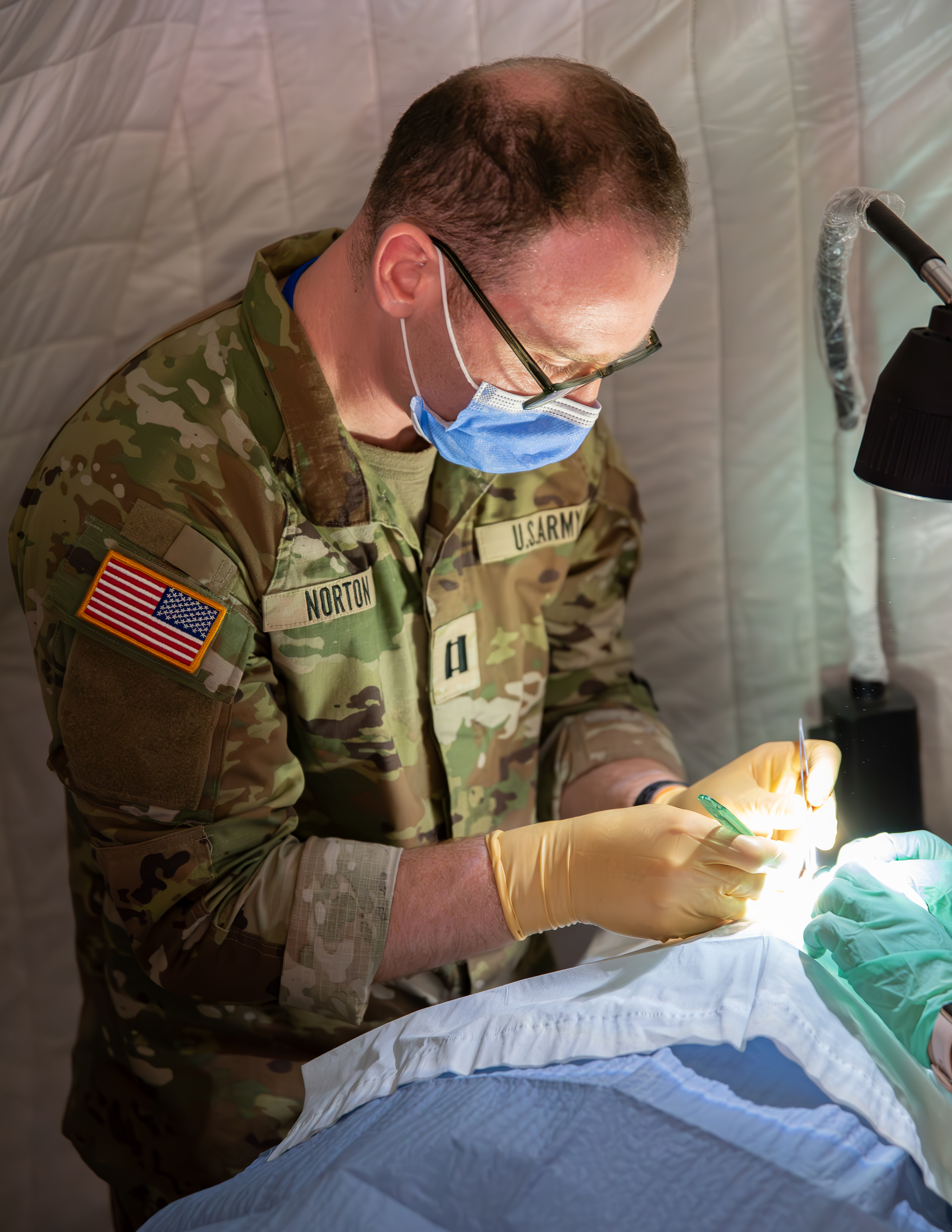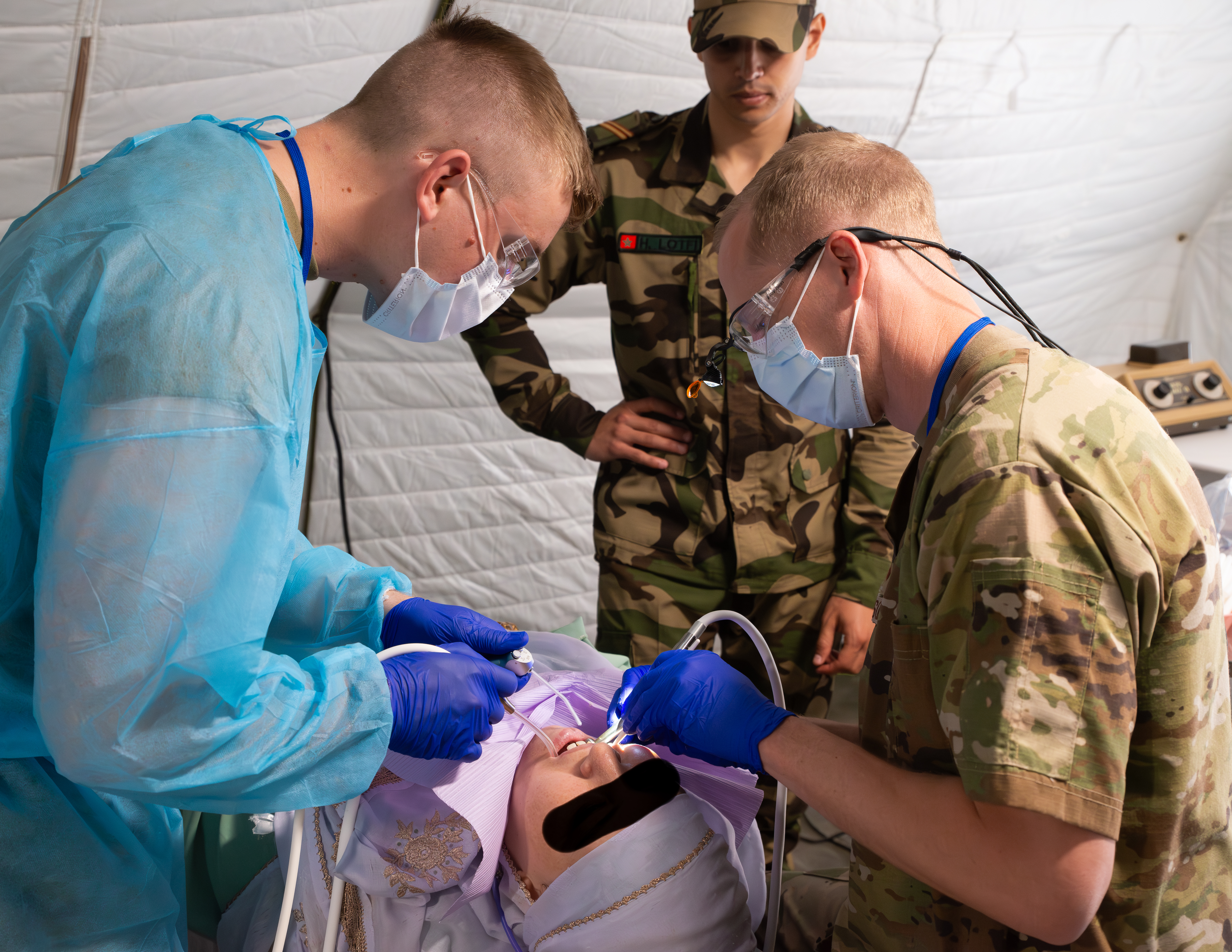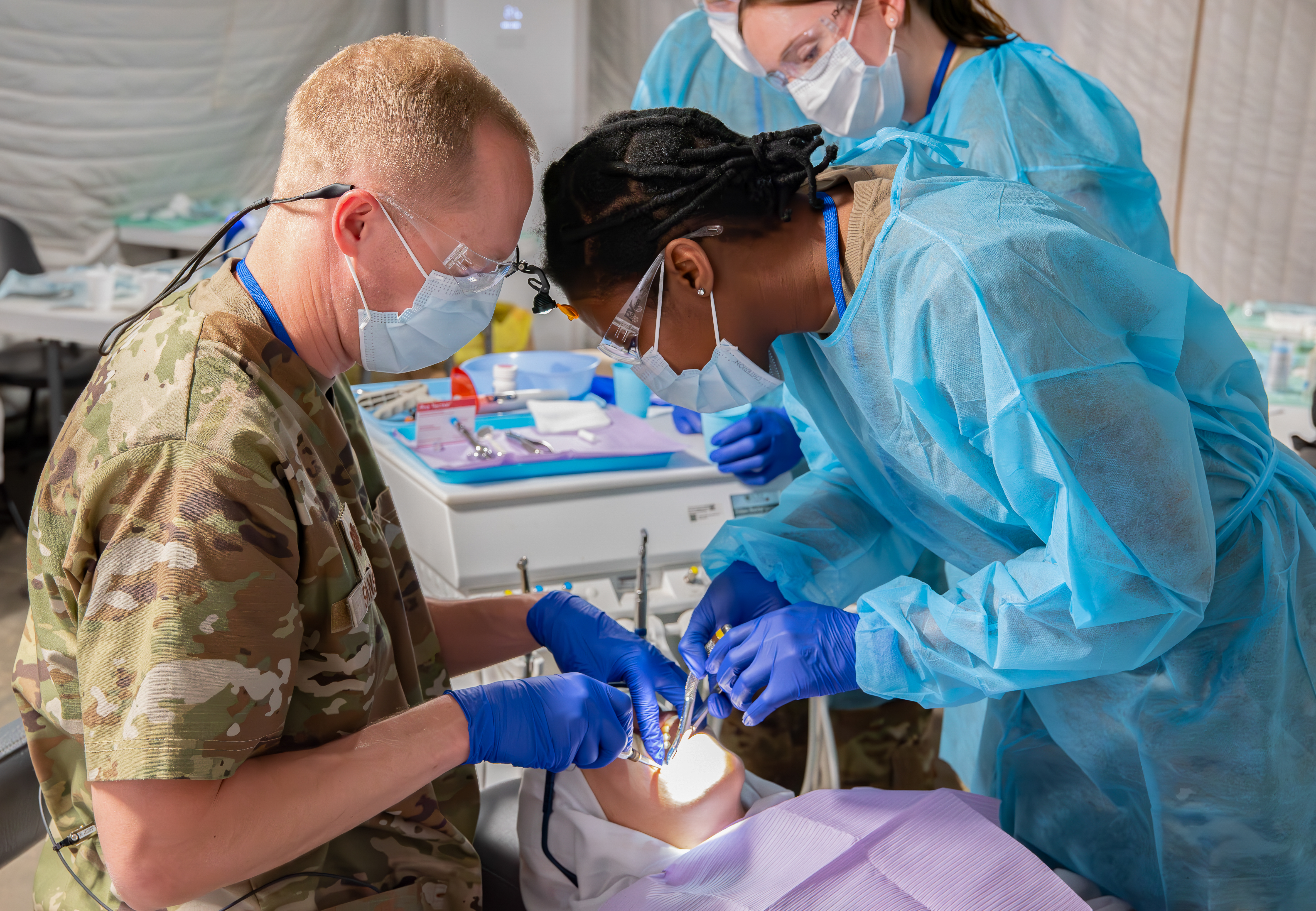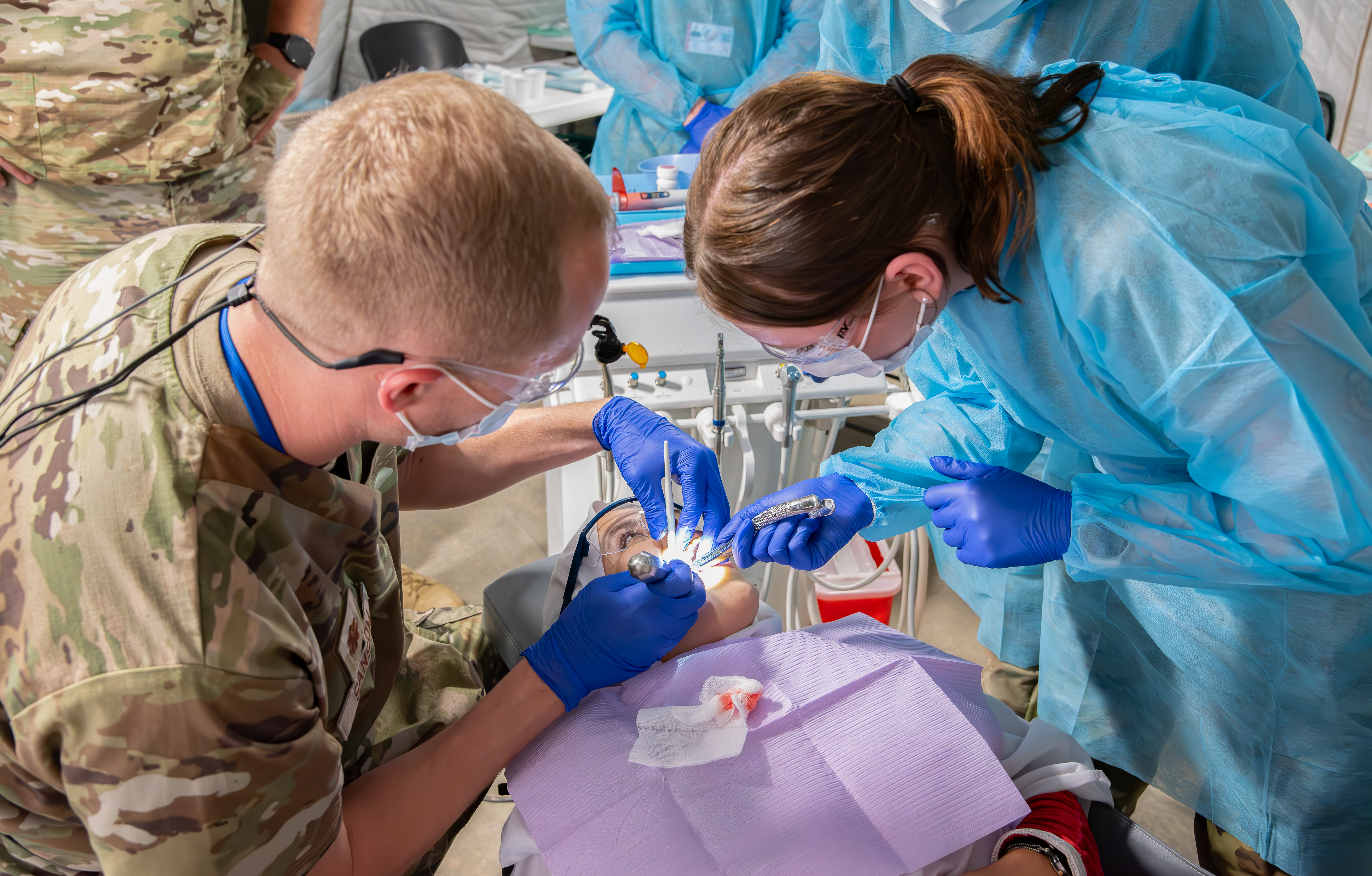 U.S. Air Force Maj. Kyle Sansom, 151st Medical Group (MDG), Utah Air National Guard, and Staff Sgt. Sophia Hunt, 102nd MDG, Massachusetts Air National Guard, perform a tooth extraction on a Moroccan patient at the Humanitarian Civic Assistance event in Anzi, Morocco, during African Lion 2025 (AL25) May 12, 2025. AL25, the largest annual military exercise in Africa, will take place from April 14 to May 23, 2025. Led by U.S. Africa Command with over 10,000 troops from more than 50 nations, including seven NATO allies, across Ghana, Morocco, Senegal, and Tunisia. The exercise aims to bolster military readiness, enhance lethality, and foster stronger partnerships, ultimately improving joint capabilities in complex multi-domain environments to enable participating forces to deploy, fight, and win. (U.S. Air National Guard photo by: Master Sgt. Nicholas Perez)