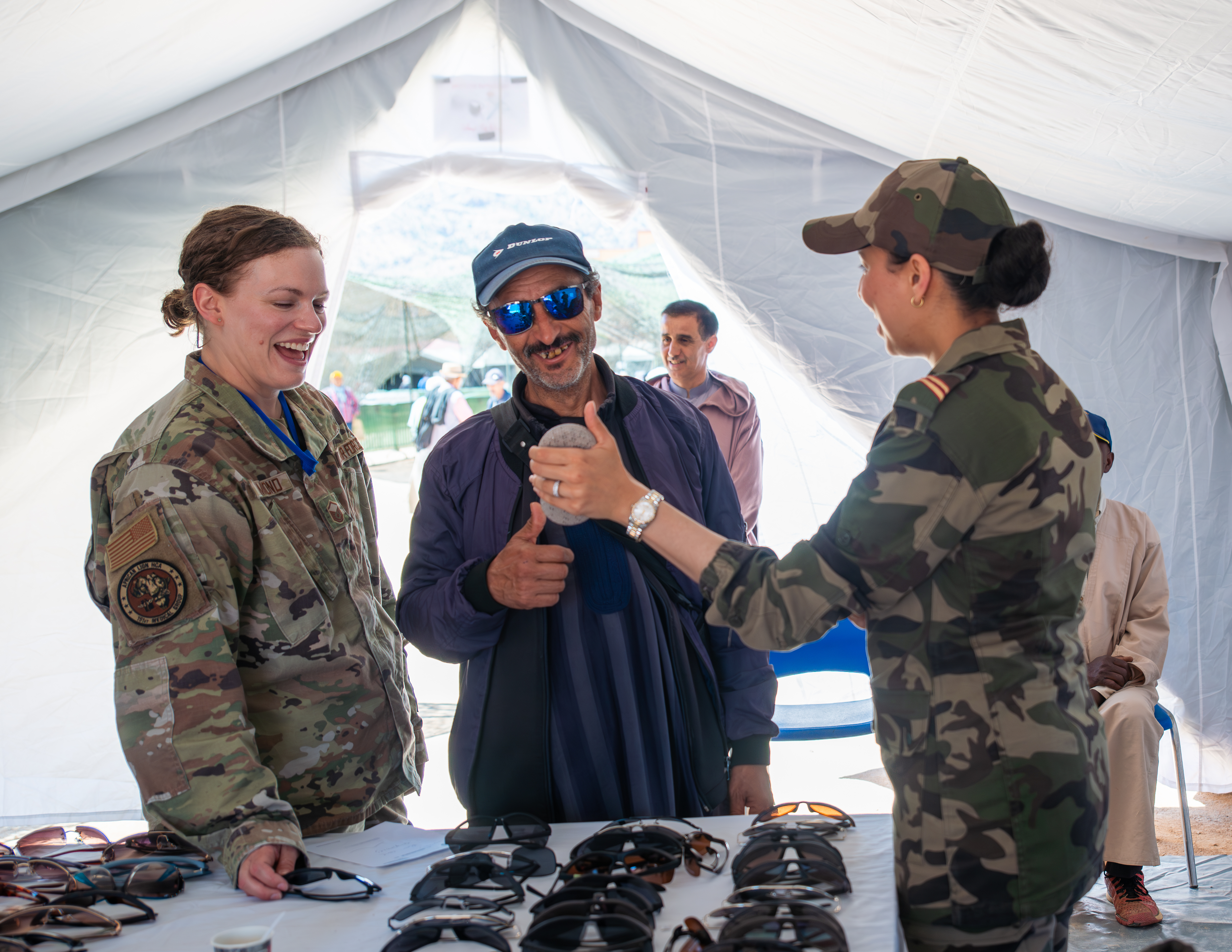 U.S. Air Force Master Sgt. Katherine Hammond, 151st Medical Group, Utah Air National Guard, and a member of the Royal Moroccan Armed Forces hand out sunglasses to optometry patients at the Humanitarian Civic Assistance event in Anzi, Morocco, during African Lion 2025 (AL25) May 12, 2025. AL25, the largest annual military exercise in Africa, will take place from April 14 to May 23, 2025. Led by U.S. Africa Command with over 10,000 troops from more than 50 nations, including seven NATO allies, across Ghana, Morocco, Senegal, and Tunisia. The exercise aims to bolster military readiness, enhance lethality, and foster stronger partnerships, ultimately improving joint capabilities in complex multi-domain environments to enable participating forces to deploy, fight, and win. (U.S. Air National Guard photo by Maj. Marie Denson)