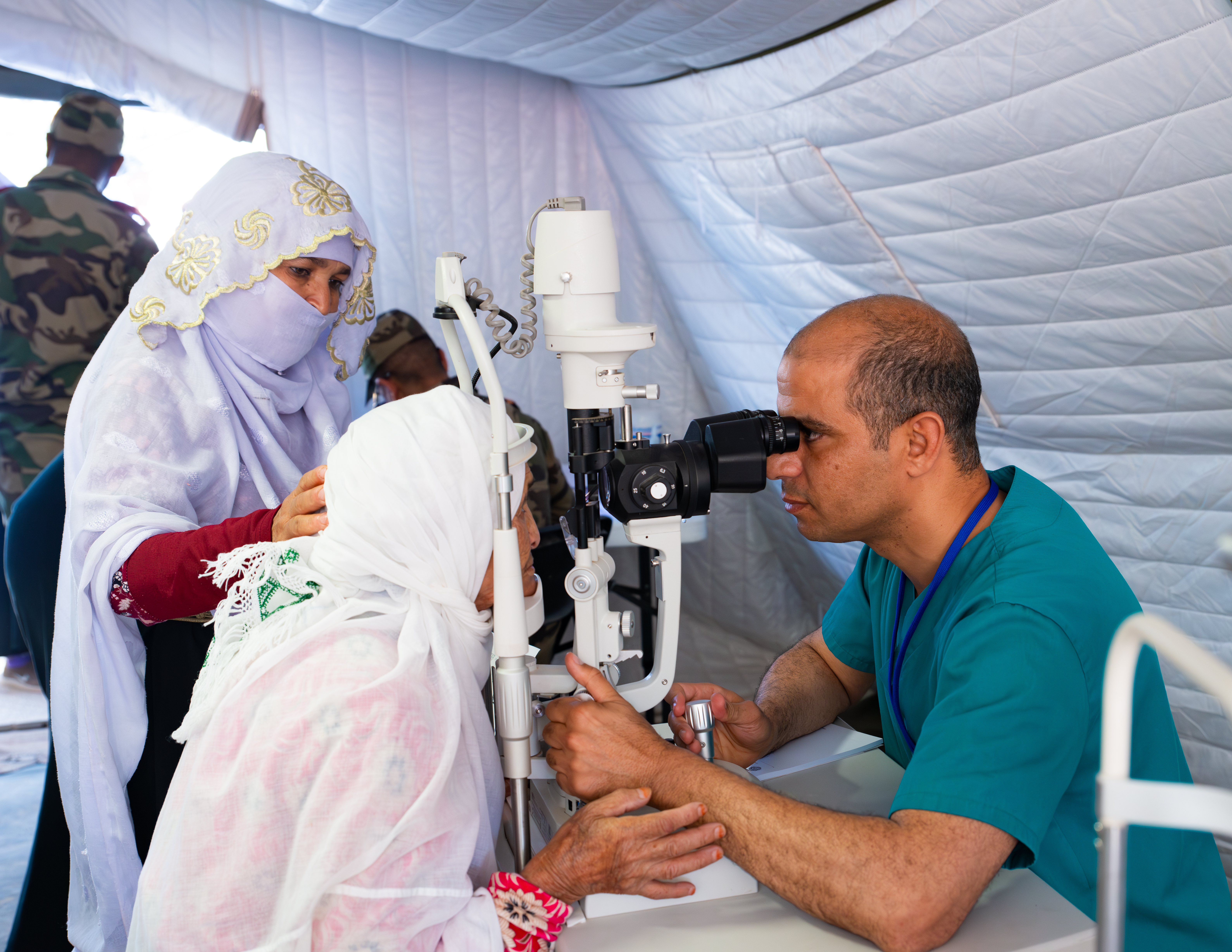 Commandant Salaheddine Bouabbadi with the Royal Moroccan Armed Forces performs an eye exam on a patient at the Humanitarian Civic Assistance event in Anzi, Morocco, during African Lion 2025 (AL25) May 12, 2025. AL25, the largest annual military exercise in Africa, will take place from April 14 to May 23, 2025. Led by U.S. Africa Command with over 10,000 troops from more than 50 nations, including seven NATO allies, across Ghana, Morocco, Senegal, and Tunisia. The exercise aims to bolster military readiness, enhance lethality, and foster stronger partnerships, ultimately improving joint capabilities in complex multi-domain environments to enable participating forces to deploy, fight, and win. (U.S. Air National Guard photo by Maj. Marie Denson)