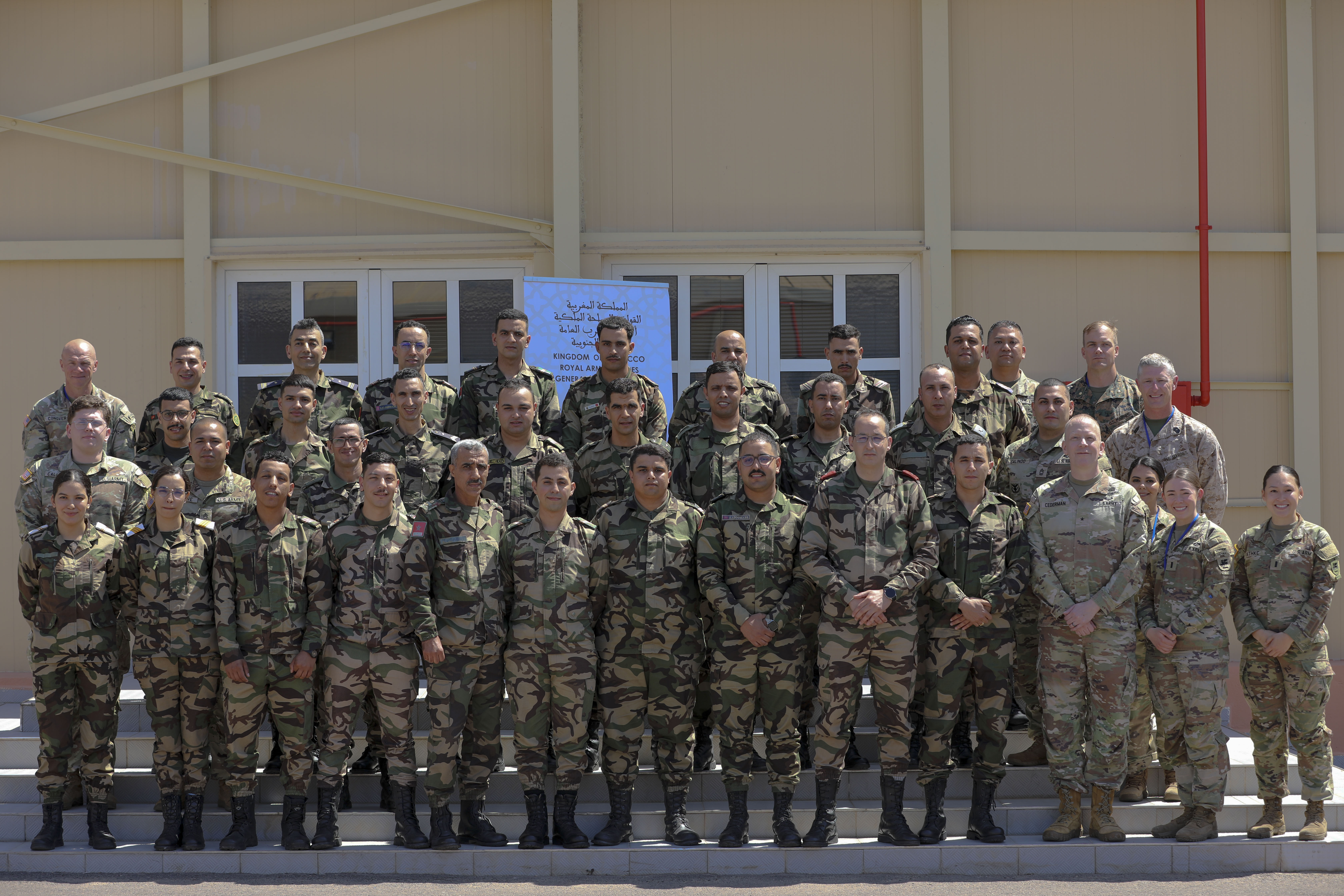 U.S. Army and Royal Moroccan soldiers pose for a photo after a noncommissioned officer (NCO) development workshop during African Lion 2025 (AL25) at Agadir, Morocco, May 12, 2025. NCO development strengthens leadership, decision-making and adaptability, ensuring enlisted leaders are prepared to meet the dynamic challenges of future operations. AL25, the largest annual military exercise in Africa, brings together over 50 nations, including seven NATO allies and 10,000 troops to conduct realistic, dynamic and collaborative training in an austere environment that intersects multiple geographic and functional combatant commands. Led by U.S. Army Southern European Task Force, Africa (SETAF-AF,) on behalf of the U.S. Africa Command, AL25 takes place from April 14 to May 23, 2025, across Ghana, Morocco, Senegal, and Tunisia. This large-scale exercise will enhance our ability to work together in complex, multi-domain operations—preparing forces to deploy, fight and win. (U.S. Army Reserve photo by Sgt. Daniel Alejandro Luna)