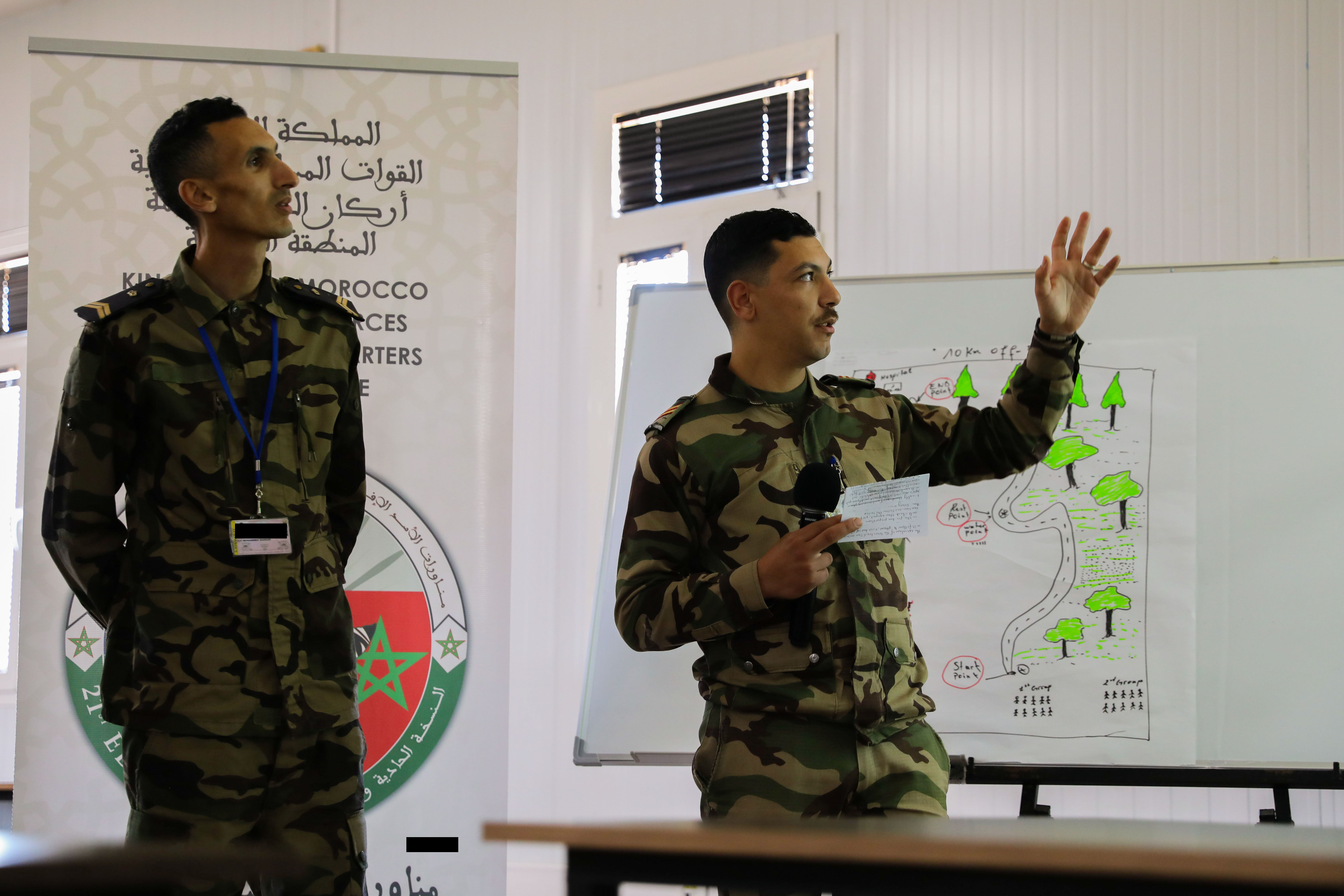A Royal Moroccan soldier gives a brief during a noncommissioned officer (NCO) development workshop at African Lion 2025 (AL25) in Agadir, Morocco, May 12, 2025. NCO development strengthens leadership, decision-making and adaptability, ensuring enlisted leaders are prepared to meet the dynamic challenges of future operations. AL25, the largest annual military exercise in Africa, brings together over 50 nations, including seven NATO allies and 10,000 troops to conduct realistic, dynamic and collaborative training in an austere environment that intersects multiple geographic and functional combatant commands. Led by U.S. Army Southern European Task Force, Africa (SETAF-AF,) on behalf of the U.S. Africa Command, AL25 takes place from April 14 to May 23, 2025, across Ghana, Morocco, Senegal, and Tunisia. This large-scale exercise will enhance our ability to work together in complex, multi-domain operations—preparing forces to deploy, fight and win. (U.S. Army Reserve photo by Sgt. Daniel Alejandro Luna)