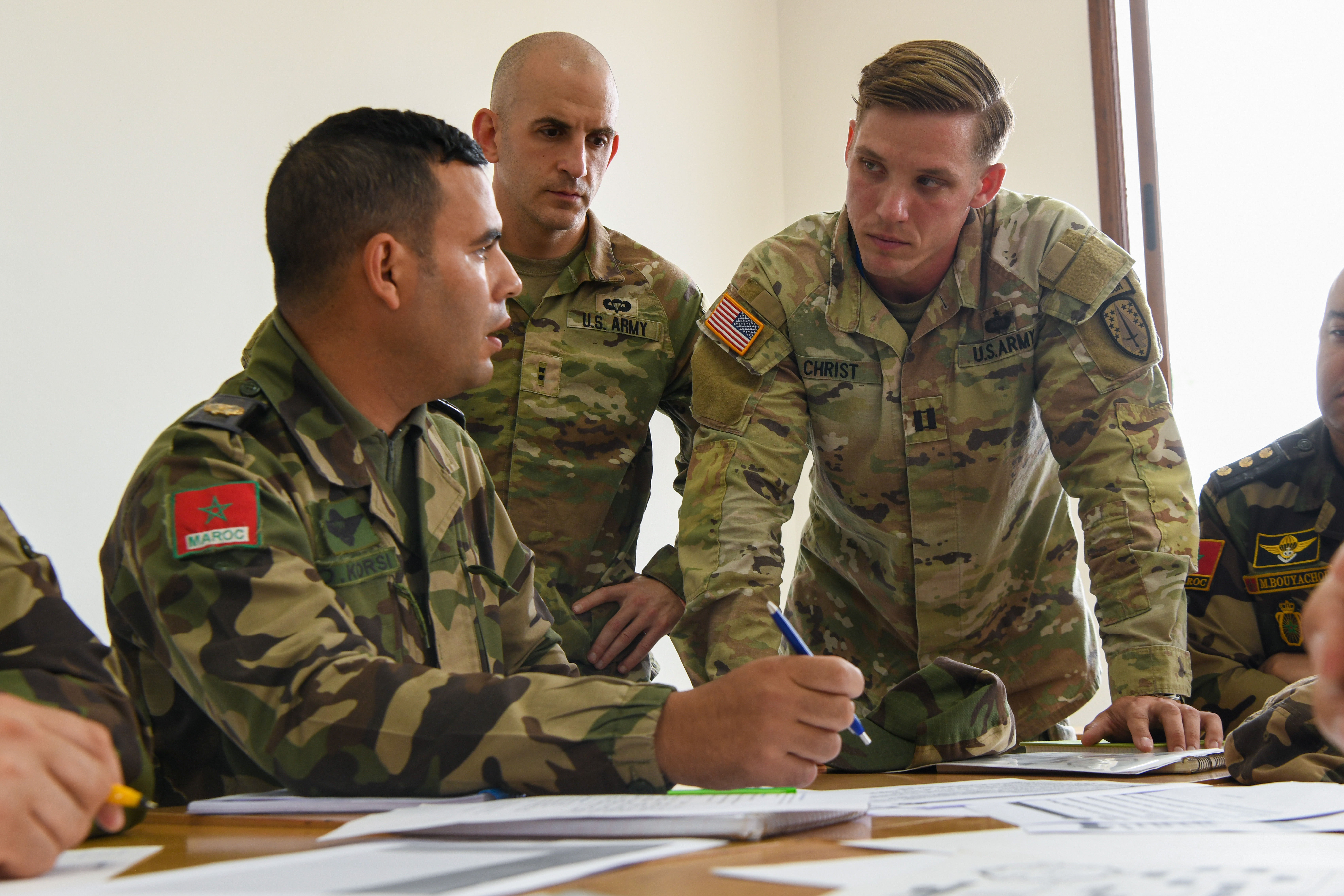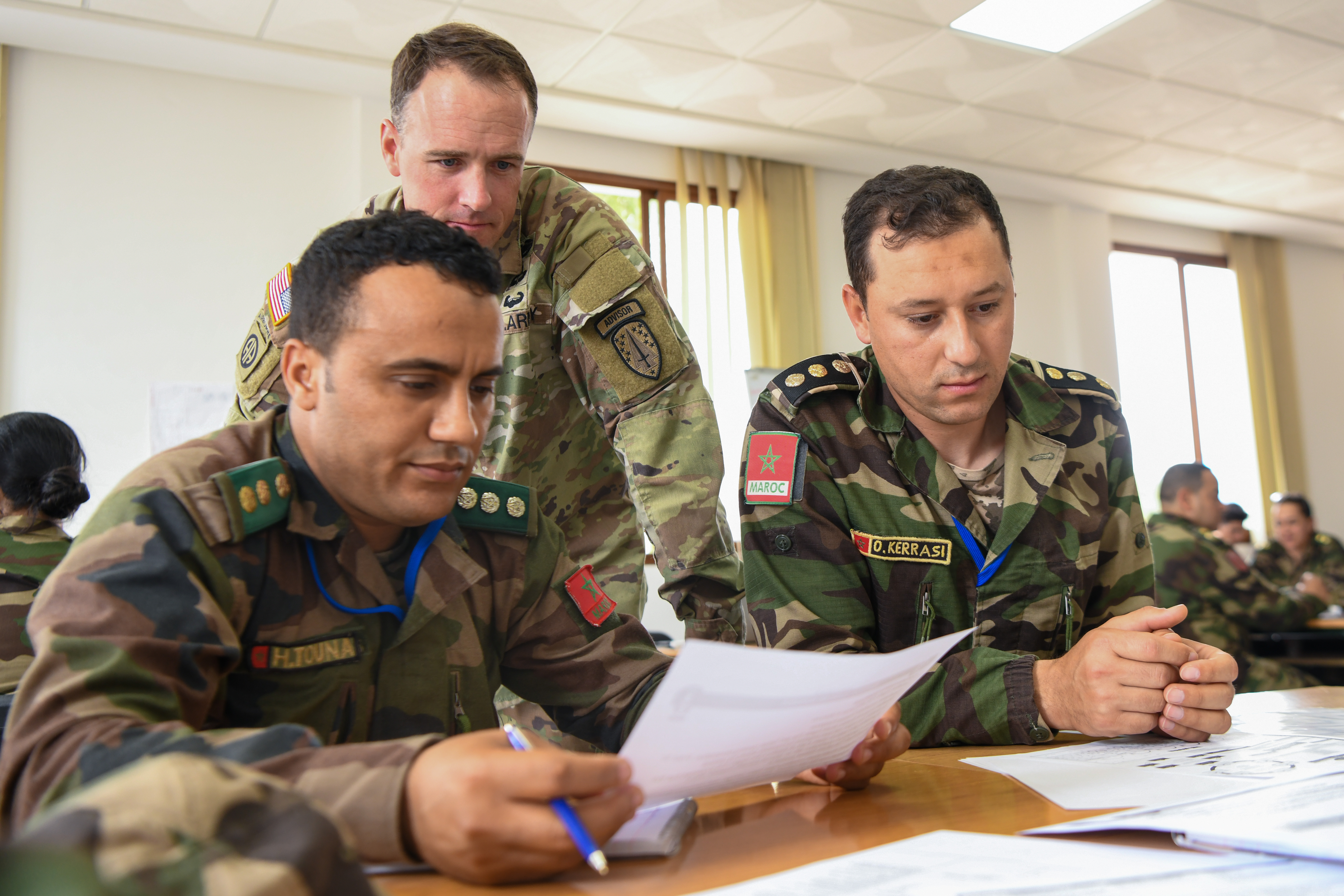 Royal Moroccan Armed Forces soldiers brief during the noncommissioned officer (NCO) development workshop during African Lion 2025 (AL25,) in Agadir, Morocco, May 12, 2025. NCO development strengthens leadership, decision-making and adaptability, ensuring enlisted leaders are prepared to meet the dynamic challenges of future operations. AL25, the largest annual military exercise in Africa, brings together over 50 nations, including seven NATO allies and 10,000 troops to conduct realistic, dynamic and collaborative training in an austere environment that intersects multiple geographic and functional combatant commands. Led by U.S. Army Southern European Task Force, Africa (SETAF-AF,) on behalf of the U.S. Africa Command, AL25 takes place from April 14 to May 23, 2025, across Ghana, Morocco, Senegal, and Tunisia. This large-scale exercise will enhance our ability to work together in complex, multi-domain operations—preparing forces to deploy, fight and win. Altered for security purposes. (U.S. Army Reserve photo by Sgt. Daniel Alejandro Luna)
