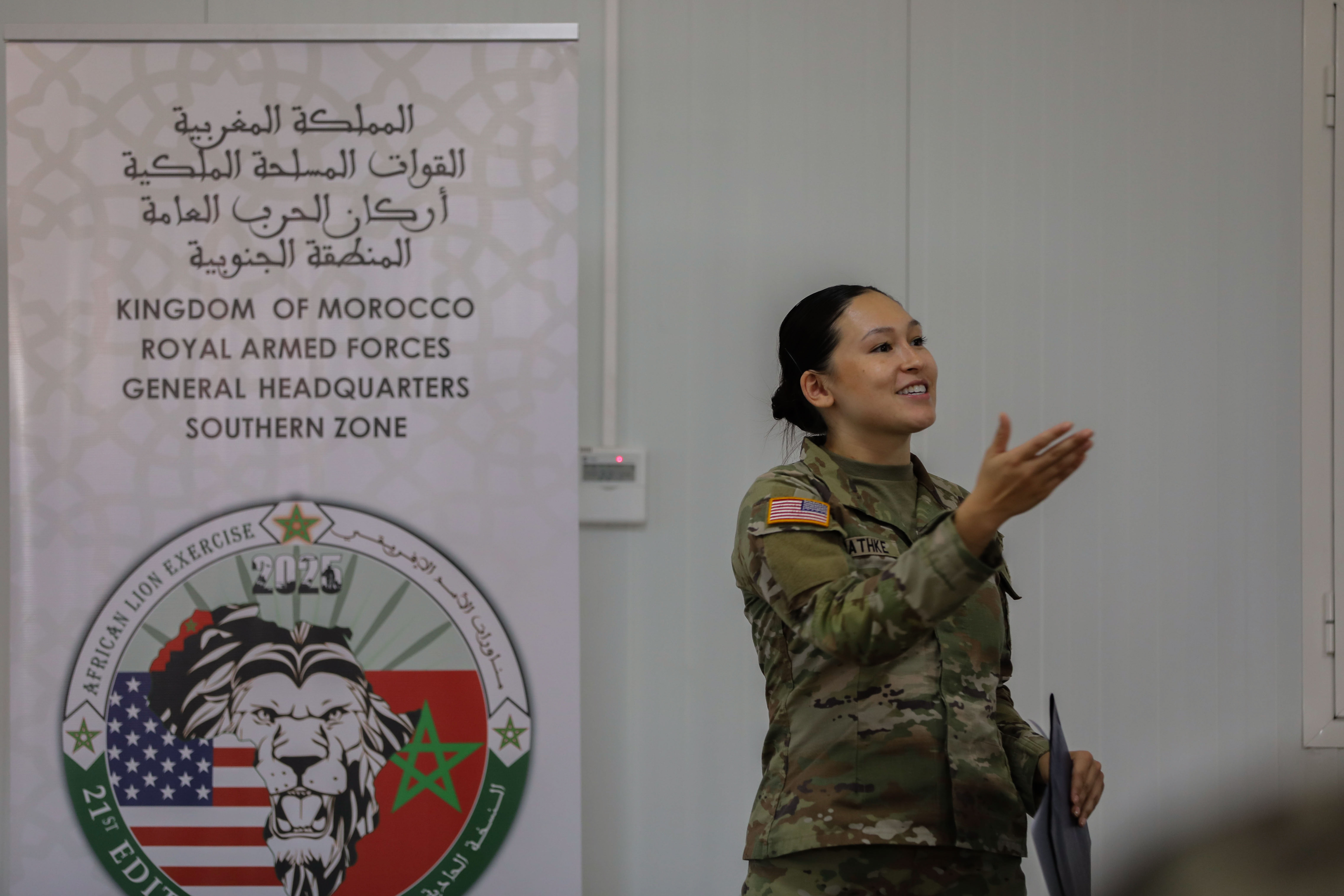 U.S. Army Cpt. Saira Sumbal, a civil affairs planner assigned to the 412th Civil Affairs Battalion, 352nd Civil Affairs Command, provides instruction during the academics portion of African Lion 2025 (AL25) at Agadir, Morocco, May 9, 2025. AL25, the largest annual military exercise in Africa, will take place from April 14 to May 23, 2025. Led by U.S. Africa Command with over 10,000 troops from more than 50 nations, including seven NATO allies, across Ghana, Morocco, Senegal, and Tunisia. The exercise aims to bolster military readiness, enhance lethality, and foster stronger partnerships, ultimately improving joint capabilities in complex multi-domain environments to enable participating forces to deploy, fight, and win. (U.S. Army Photo by Staff Sgt. Aaliyah Craven)