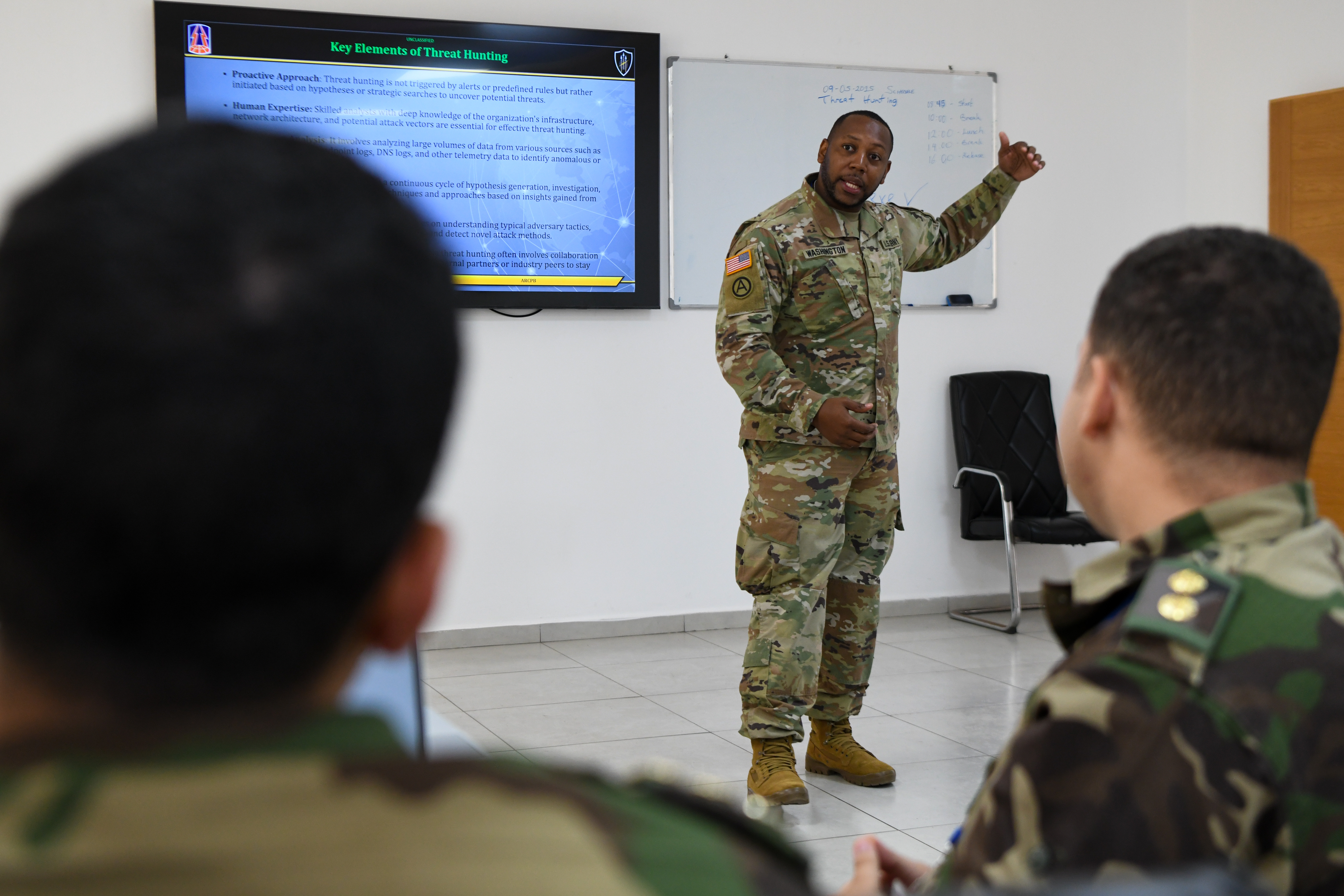 U.S. Army Warrant Officer Washington Dustin, a network operation technician assigned to the Army Reserve Cyber Protection Brigade, leads a defensive cyber operations classroom discussion during African Lion 2025 (AL25) in Agadir, Morocco, May 9, 2025. This defensive cyber operations course equips personnel with the skills to detect, counter and mitigate cyber threats, ensuring operational security and resilience in future missions. AL25, the largest annual military exercise in Africa, will take place from April 14 to May 23, 2025. Led by U.S. Africa Command with over 10,000 troops from more than 50 nations, including seven NATO allies, across Ghana, Morocco, Senegal, and Tunisia. The exercise aims to bolster military readiness, enhance lethality, and foster stronger partnerships, ultimately improving joint capabilities in complex multi-domain environments to enable participating forces to deploy, fight, and win. (U.S. Army photo by Staff Sgt. Aaliyah Craven)