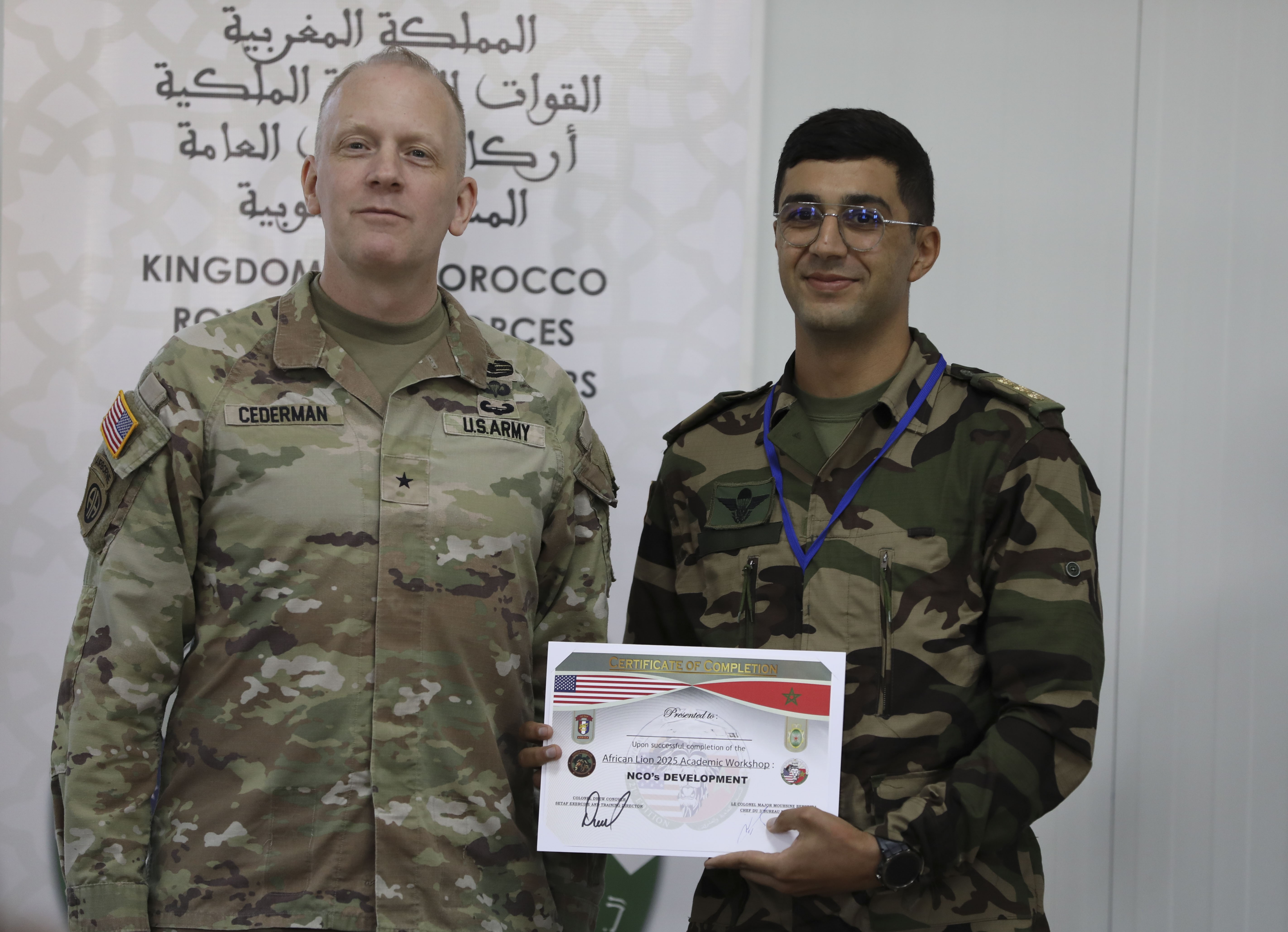 U.S. Army Brig. Gen. Daniel Cederman, deputy commanding general, U.S. Army Southern European Task Force, Africa (SETAF-AF), presents a certificate of completion to a Royal Moroccan Armed Forces soldier at a noncommissioned officer (NCO) development workshop during African Lion 2025 (AL25) in Agadir, Morocco, May 12, 2025. NCO development strengthens leadership, decision-making and adaptability, ensuring enlisted leaders are prepared to meet the dynamic challenges of future operations. AL25, the largest annual military exercise in Africa, brings together over 50 nations, including seven NATO allies and 10,000 troops to conduct realistic, dynamic and collaborative training in an austere environment that intersects multiple geographic and functional combatant commands. Led by U.S. Army Southern European Task Force, Africa (SETAF-AF,) on behalf of the U.S. Africa Command, AL25 takes place from April 14 to May 23, 2025, across Ghana, Morocco, Senegal, and Tunisia. This large-scale exercise will enhance our ability to work together in complex, multi-domain operations—preparing forces to deploy, fight and win. Altered for security purposes. (U.S. Army Reserve photo by Sgt. Daniel Alejandro Luna)