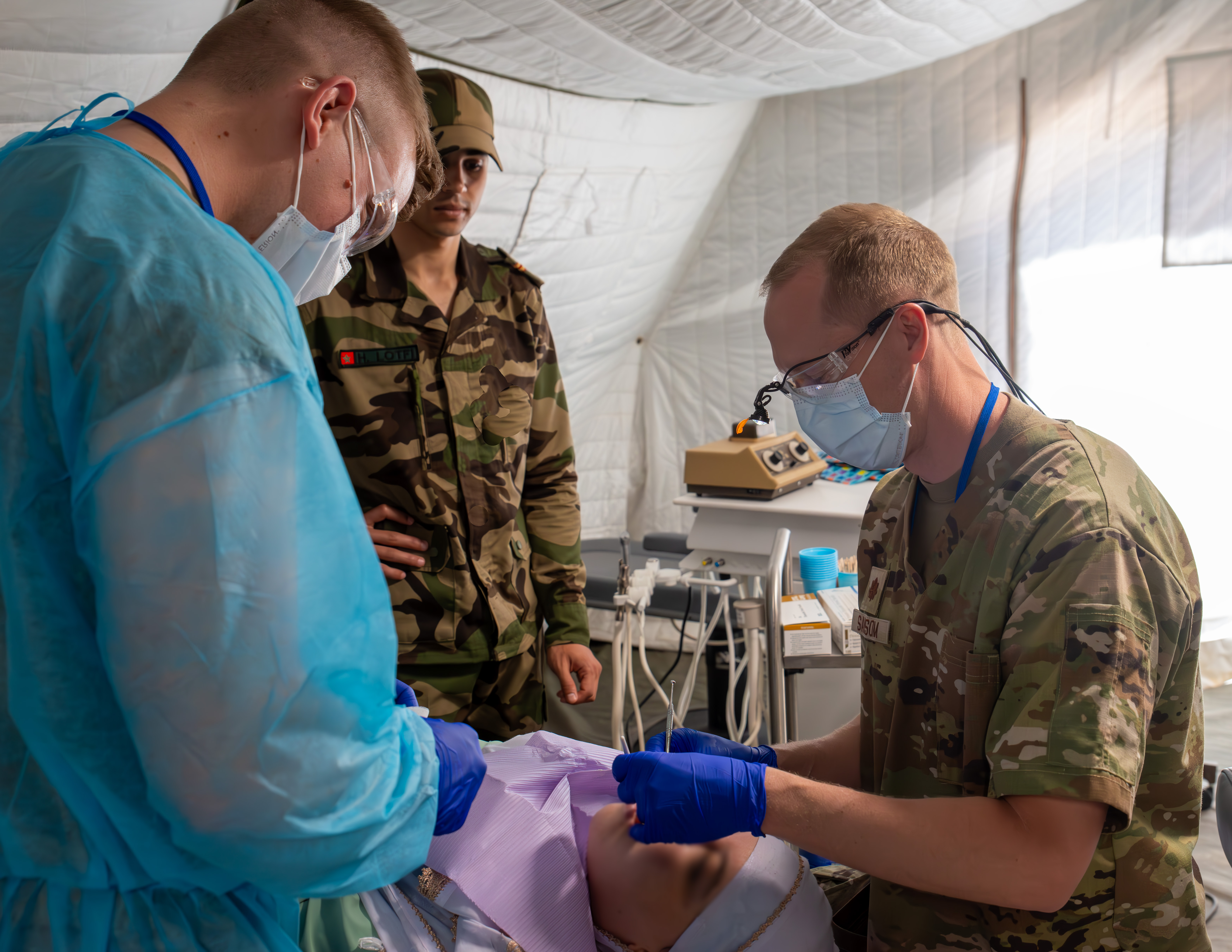 U.S. Air Force Maj. Kyle Sansom and Staff Sgt. Joel Farmer, both assigned to the 151st Medical Group, Utah Air National Guard, perform a dental exam on a Moroccan patient at the humanitarian civic assistance event during African Lion 2025 (AL25) in Anzi, Morocco, May 11, 2025. AL25, the largest annual military exercise in Africa, takes place from April 14 to May 23, 2025. Led by U.S. Africa Command with over 10,000 troops from more than 50 nations, including seven NATO allies, across Ghana, Morocco, Senegal, and Tunisia. The exercise aims to bolster military readiness, enhance lethality, and foster stronger partnerships, ultimately improving joint capabilities in complex multi-domain environments to enable participating forces to deploy, fight, and win. (U.S. Air National Guard photo by: Maj. Marie Denson)