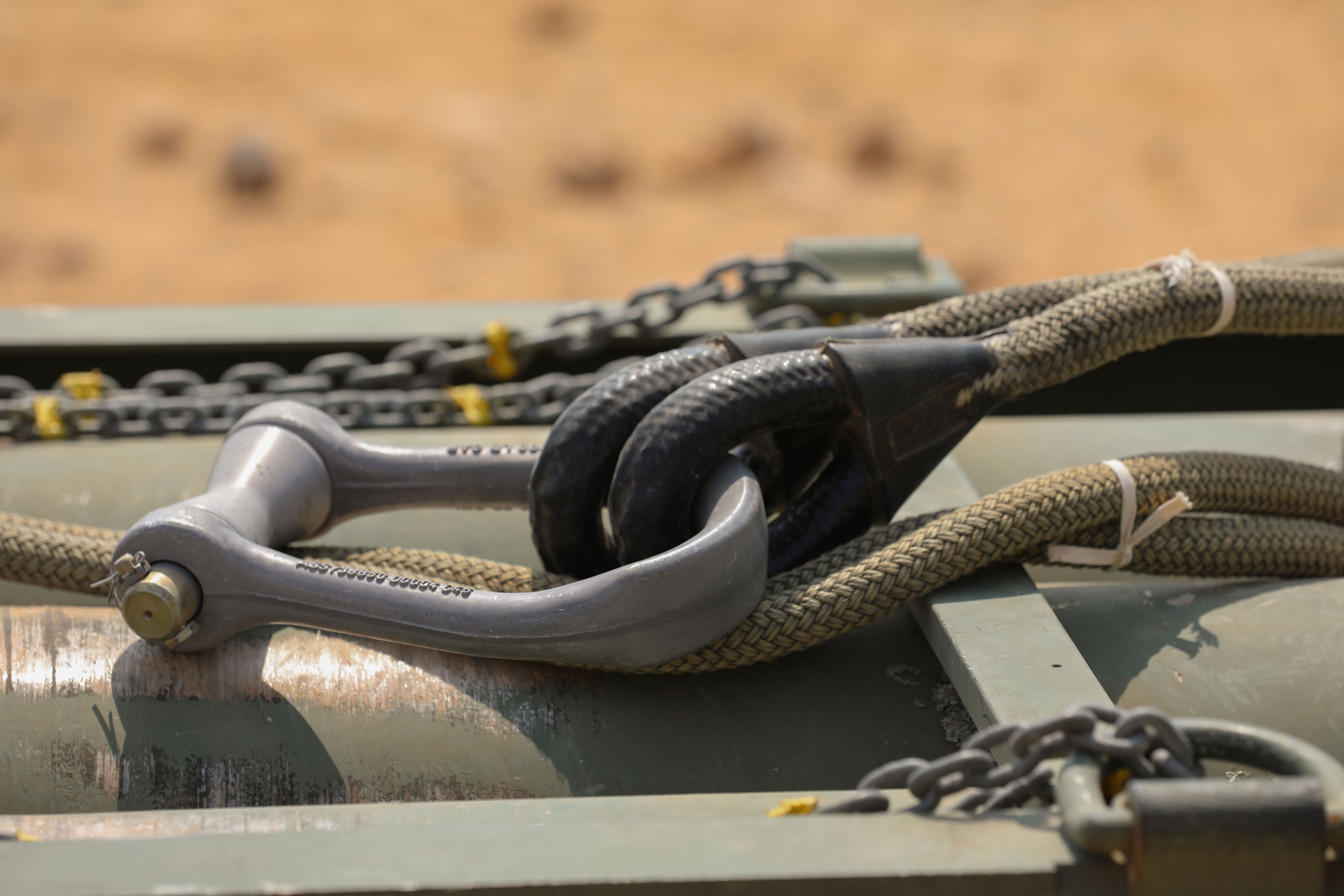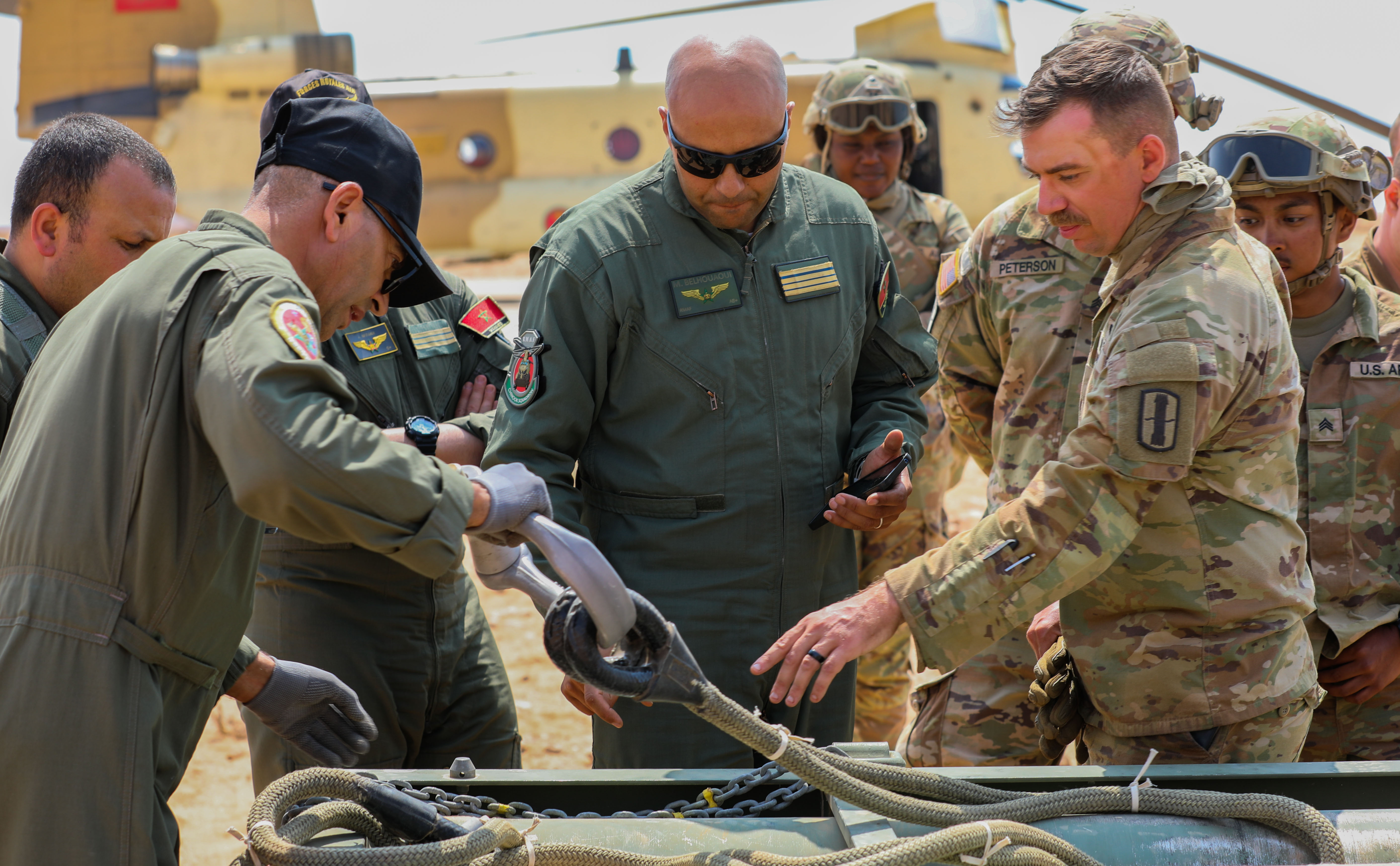 U.S. Soldiers assigned to 3rd Battalion, 197th Field Artillery Regiment, New Hampshire Army National Guard, stage the sling legs and apex ahead of a multinational sling load operation alongside a CH-47 Chinook crew with the Royal Moroccan Armed Forces at Cap Draa, Tantan, Morocco, May 17, 2025, during African Lion 2025 (AL25). AL25, the largest annual military exercise in Africa, brings together over 50 nations, including seven NATO allies and 10,000 troops to conduct realistic, dynamic and collaborative training in an austere environment that intersects multiple geographic and functional combatant commands. Led by U.S. Army Southern European Task Force, Africa (SETAF-AF,) on behalf of the U.S. Africa Command, AL25 takes place from April 14 to May 23, 2025, across Ghana, Morocco, Senegal, and Tunisia This large-scale exercise will enhance our ability to work together in complex, multi-domain operations - preparing forces to deploy, fight, and win. (U.S. Army Reserve photo by Sgt. 1st Class Jessica Forester)