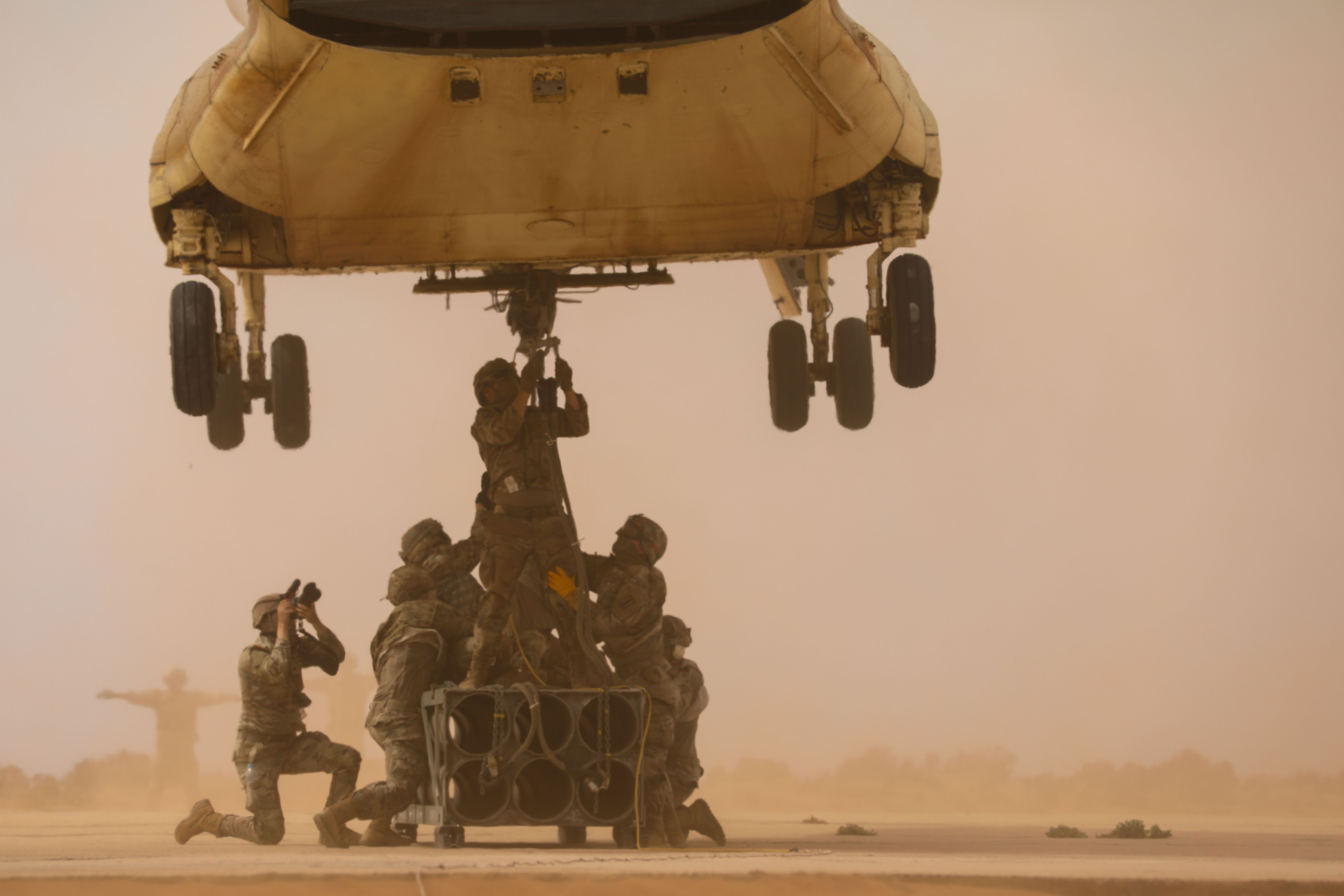 A member of a CH-47 Chinook crew with the Royal Moroccan Armed Forces guides a reduced range practice rocket during a multinational sling load exercise alongside U.S. Soldiers assigned to 3rd Battalion, 197th Field Artillery Regiment, New Hampshire Army National Guard at Cap Draa, Tantan, Morocco, May 17, 2025, during African Lion 2025 (AL25). AL25, the largest annual military exercise in Africa, brings together over 50 nations, including seven NATO allies and 10,000 troops to conduct realistic, dynamic and collaborative training in an austere environment that intersects multiple geographic and functional combatant commands. Led by U.S. Army Southern European Task Force, Africa (SETAF-AF,) on behalf of the U.S. Africa Command, AL25 takes place from April 14 to May 23, 2025, across Ghana, Morocco, Senegal, and Tunisia This large-scale exercise will enhance our ability to work together in complex, multi-domain operations - preparing forces to deploy, fight, and win. (U.S. Army Reserve photo by Sgt. 1st Class Jessica Forester)