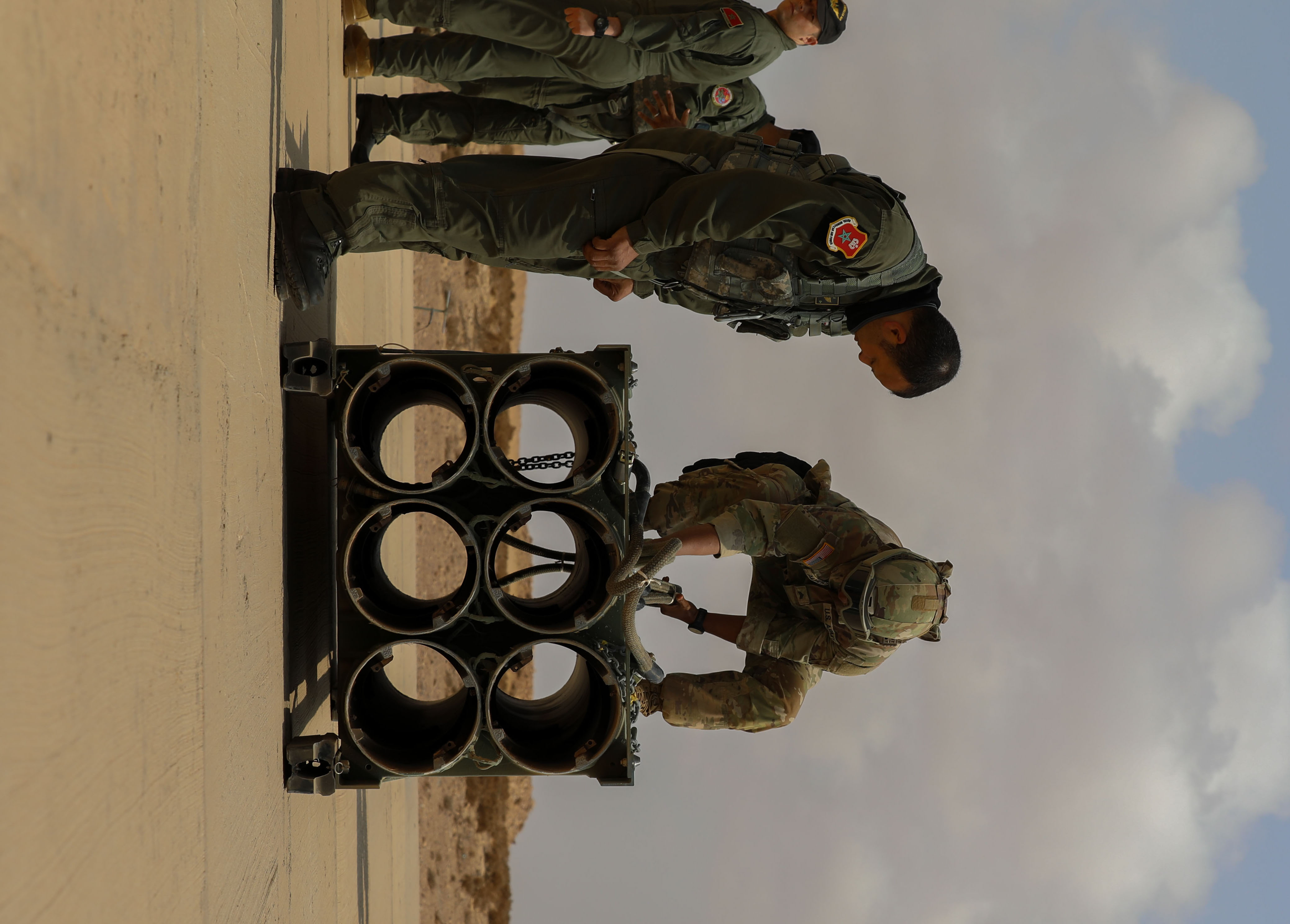 U.S. Soldiers assigned to 3rd Battalion, 197th Field Artillery Regiment, New Hampshire Army National Guard, inspect a reduced range practice rocket, alongside a CH-47 Chinook crew with the Royal Moroccan Armed Forces, ahead of a multinational sling load exercise at Cap Draa, Tantan, Morocco, May 17, 2025, during African Lion 2025 (AL25). The exercise demonstrated the capability of aircraft to retrieve and deliver munitions. AL25, the largest annual military exercise in Africa, brings together over 50 nations, including seven NATO allies and 10,000 troops to conduct realistic, dynamic and collaborative training in an austere environment that intersects multiple geographic and functional combatant commands. Led by U.S. Army Southern European Task Force, Africa (SETAF-AF,) on behalf of the U.S. Africa Command, AL25 takes place from April 14 to May 23, 2025, across Ghana Morocco, Senegal, and Tunisia This large-scale exercise will enhance our ability to work together in complex, multi-domain operations - preparing forces to deploy, fight, and win. (U.S. Army Reserve photo by Sgt. 1st Class Jessica Forester)