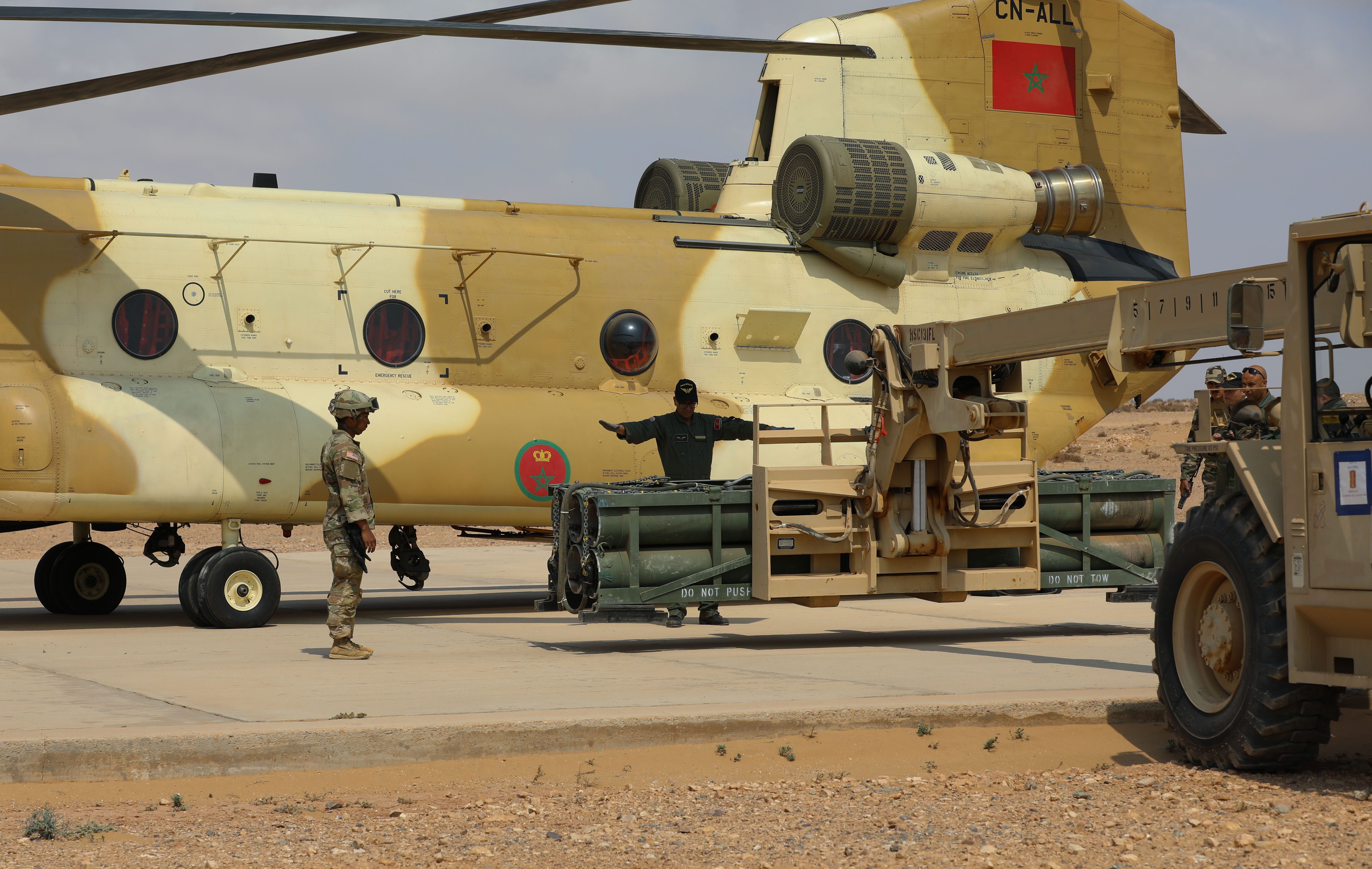 U.S. Soldiers assigned to 3rd Battalion, 197th Field Artillery Regiment, New Hampshire Army National Guard, sling load a reduced range practice rocket to a Moroccan CH-47 Chinook during a multinational sling load operation at African Lion 2025 (AL25), May 17, 2025, in Tan Tan, Morocco. AL25, the largest annual military exercise in Africa, brings together over 50 nations, including seven NATO allies and 10,000 troops to conduct realistic, dynamic and collaborative training in an austere environment that intersects multiple geographic and functional combatant commands. Led by U.S. Army Southern European Task Force, Africa (SETAF-AF,) on behalf of the U.S. Africa Command, AL25 takes place from April 14 to May 23, 2025, across Ghana, Morocco, Senegal, and Tunisia This large-scale exercise will enhance our ability to work together in complex, multi-domain operations - preparing forces to deploy, fight, and win. (U.S. Army Reserve photo by Sgt. 1st Class Jessica Forester)