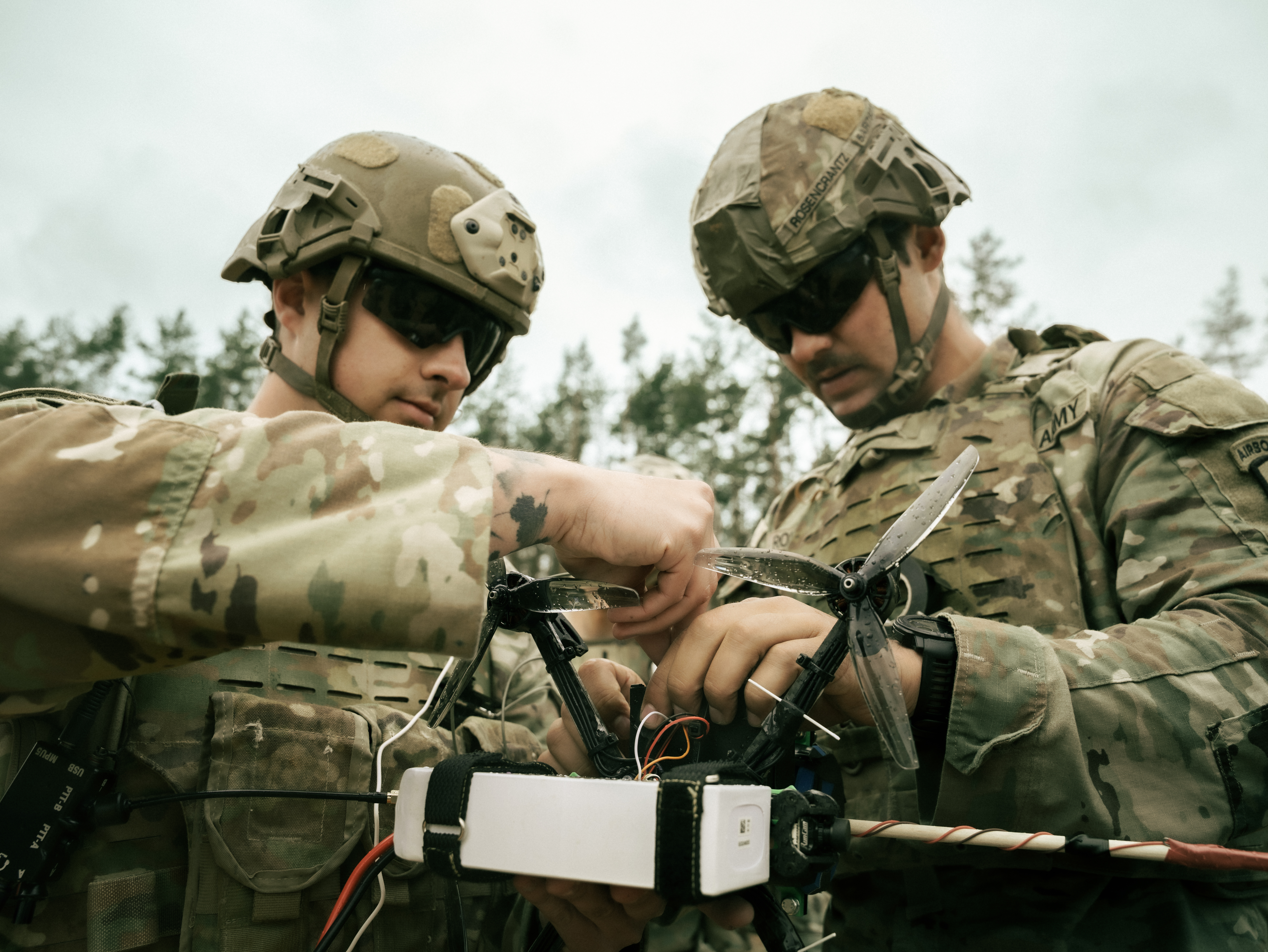U.S. Army paratroopers assigned to the 173rd Airborne Brigade prepare to operate and detonate a live First Person View (FPV) drone at Pabradė Training Area, Lithuania, during a joint forcible entry operation as part of Swift Response 2025, May 18, 2025.