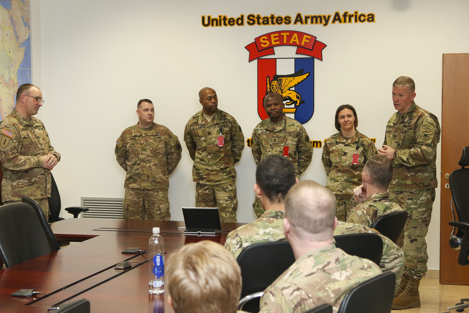 U.S. Army Africa Commanding General, Maj. Gen. Joseph Harrington, recognizes a team of Soldiers, led by Lt. Col. Dennis Bowers from the 13th Sustainment Command (Expeditionary), for their support in numerous exercises and activities in Africa, Monday at the USARAF Headquarters building on Caserma Ederle. (U.S. Army Africa photo by Staff Sgt. Lance Pounds)