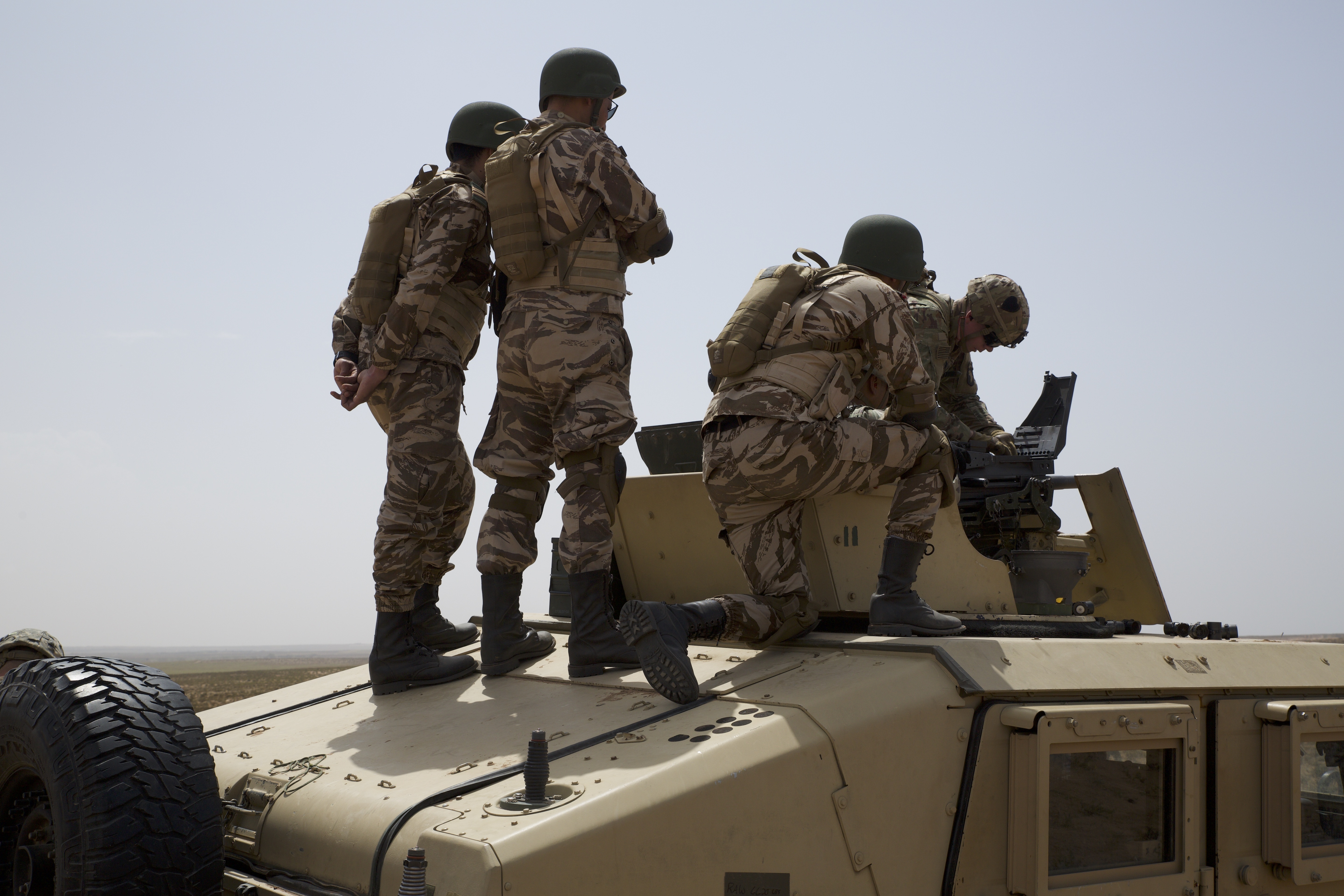 A U.S. Soldier with 1st Squadron, 75th Cavalry Regiment, 2nd Brigade Combat Team, 101st Airborne Division, trains with members of the Moroccan special operations forces’ 2nd Airborne Brigade on the Mark 19 40 mm grenade machine gun during a live-fire portion of the field training exercise during exercise African Lion 2019, in Tifnit, Morocco, March 26, 2019. African Lion 2019 is an annual, combined multilateral exercise designed to improve interoperability and mutual understanding of each nation’s tactics, techniques, and procedures while demonstrating the strong bond between the nations’ militaries. (U.S. Marine Corps photo by Lance Cpl. Joseph Atiyeh)