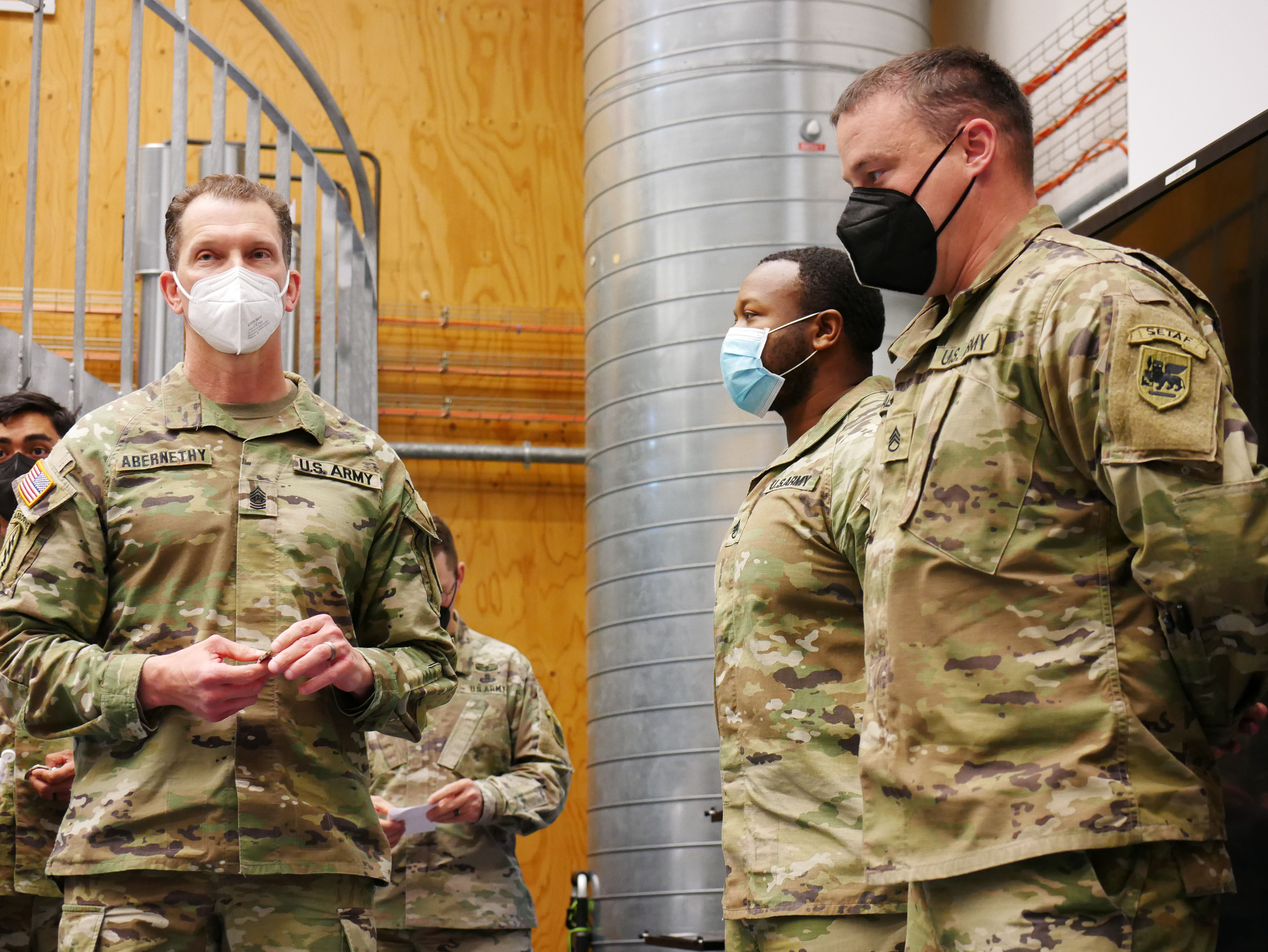 Command Sgt. Maj. Robert Abernethy, the U.S. Army Europe and Africa command sergeant major, presents the first U.S. Army Europe and Africa coins of excellence to Soldiers who participated in the U.S. Army Southern European Task Force, Africa Command Post Exercise at the Grafenwoehr Training Area in Grafenwöhr, Germany, April 15, 2021. The command post exercise, April 9-16, tested SETAF-AF's ability to integrate maritime, air and land components and execute its mission as an expeditionary joint task force prior to the execution of the African Lion 21 multinational exercise that will be conducted in Morocco, Tunisia and Senegal in June. (U.S. Army photo by Maj. Devon Thomas, SETAF-Africa Public Affairs)