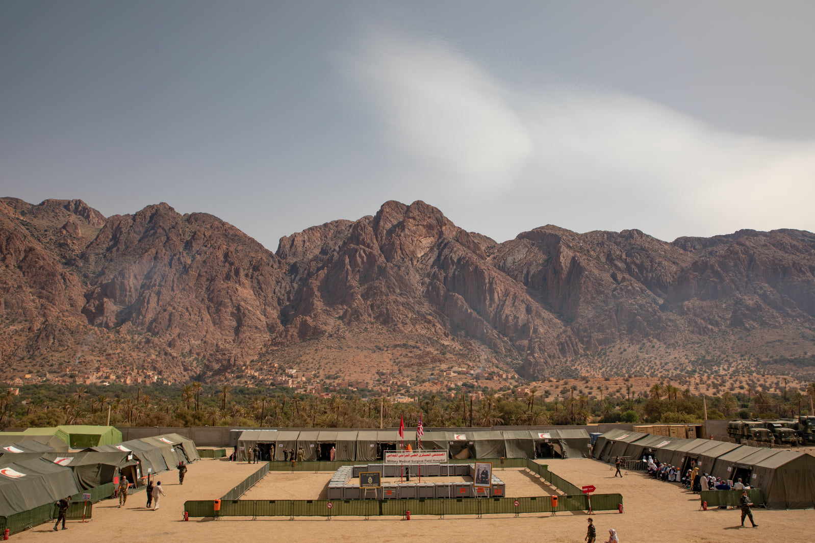 U.S. and Moroccan service members provide medical care to Moroccan citizens at the Military Medical Surgical Field Hospital in Tafraoute, Morocco, during the humanitarian civic assistance portion of African Lion21.