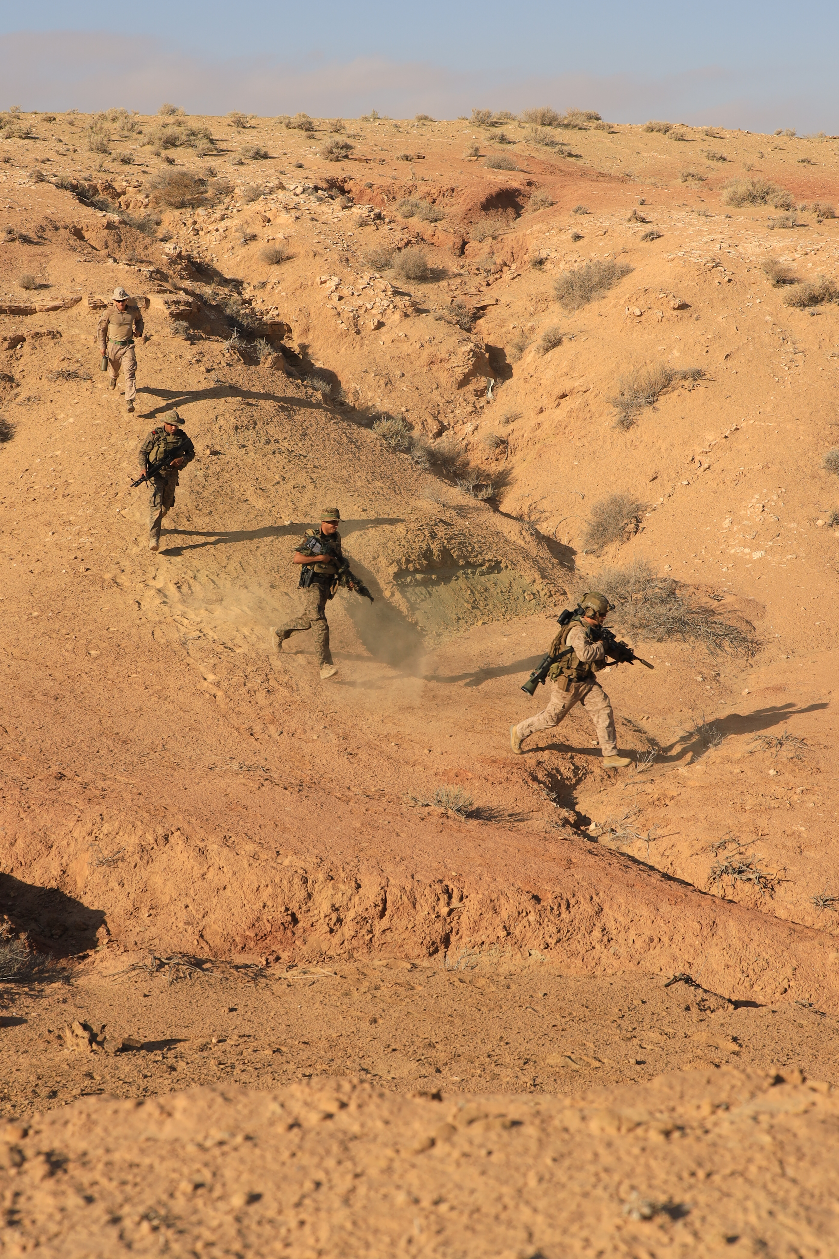 U.S. Marine Sgt. Anthony Ruiz, an infantry squad leader assigned to Echo Company, Battalion Landing Team 2/6, 22nd Marine Expeditionary Unit, works with Tunisian armed forces to move towards an objective as part of an integrated training event during African Lion 2022, Camp Ben Ghilouf, Tunisia, June 21, 2022. African Lion 22 is a multinational- scale exercise focused on increasing training and interoperability between the U.S., partners and allies in Africa to work towards increased security and stability within the region. (U.S. Marine Corps photo by Staff Sgt. Marcela Diazdeleon)