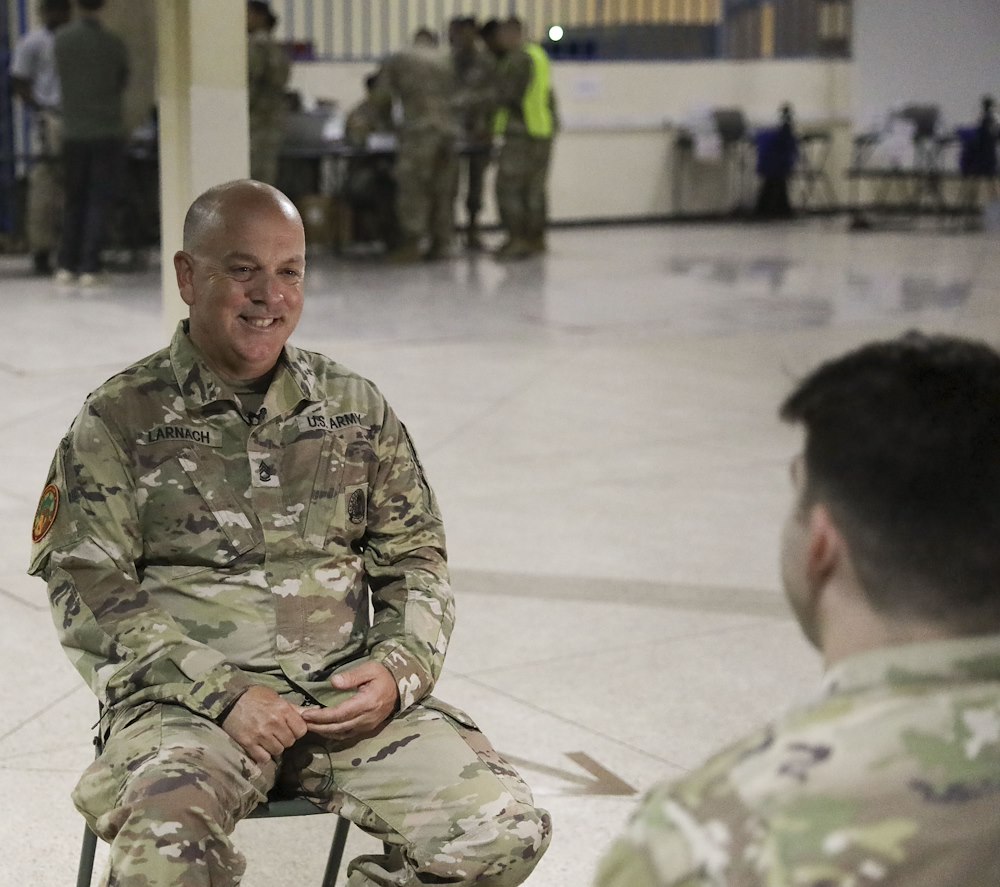 U.S. Army Sgt. 1st Class Shawn Larnach, an Active Guard Reservist serving as a Truck Master at the 129th Transportation Co., answers questions during an interview from Staff Sgt. David Graves with the 318th Theater Public Affairs Support Element during Exercise African Lion 2023. (U.S. Army photo by Sgt. 1st Class Thomas Vega)