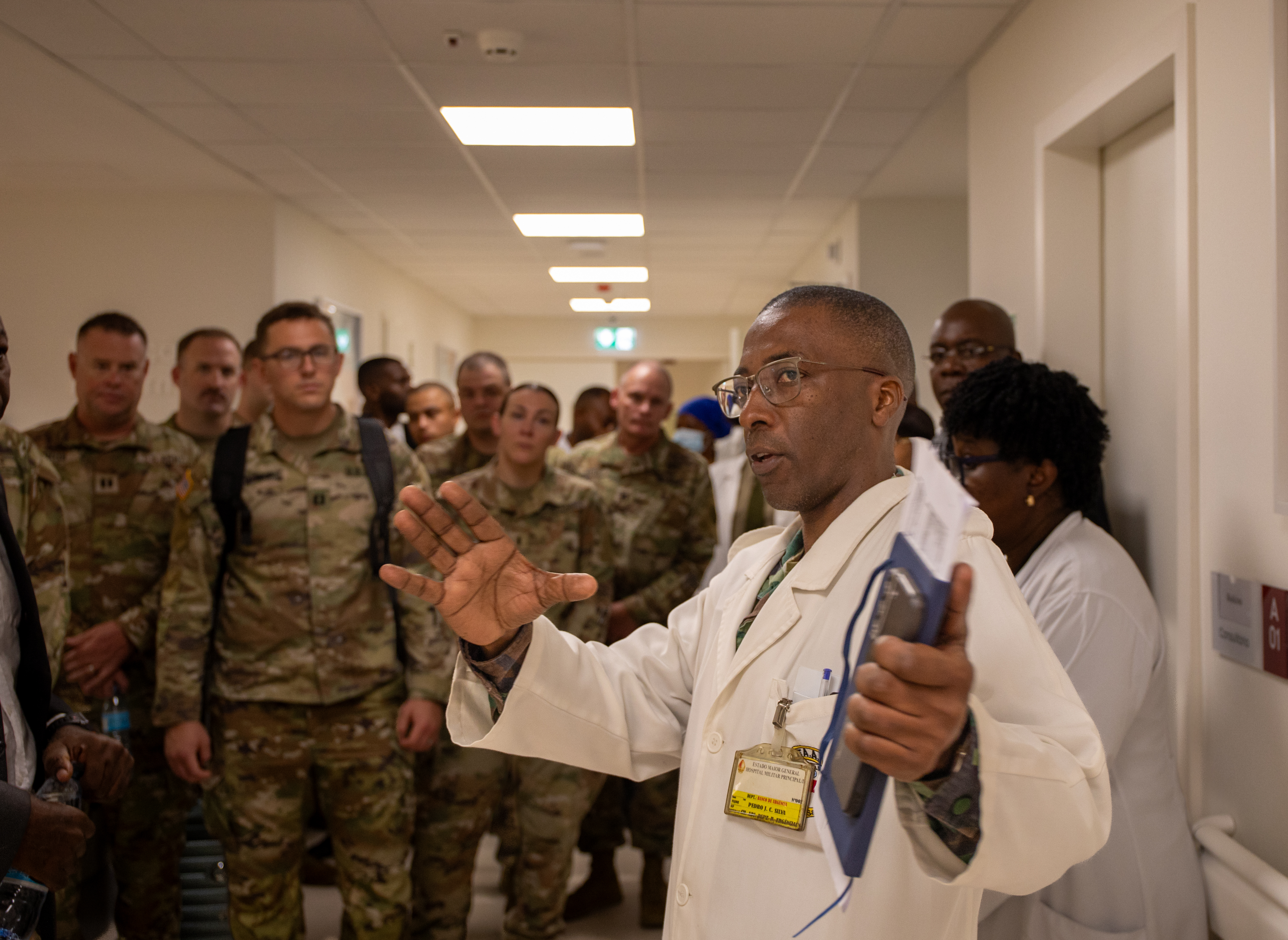 Angolan Army doctor Pedro Silva explains the operations of a hospital wing to U.S. Army Reserve Soldiers assigned to the 934th Forward Resuscitative Surgical Detachment following the opening ceremony of the Medical Readiness Exercise (MEDREX) in Luanda, Angola, July 8, 2024. MEDREX is a medical readiness exercise program, planned and executed by U.S. Army Southern European Task Force, Africa (SETAF-AF), that allows military health professionals from the U.S. and their African partners to exchange medical practices, procedures and techniques that build and strengthen treatment capabilities, resulting in lasting relationships between the partners.(U.S. Army photo by 1st Lt. Katherine Sibilla)