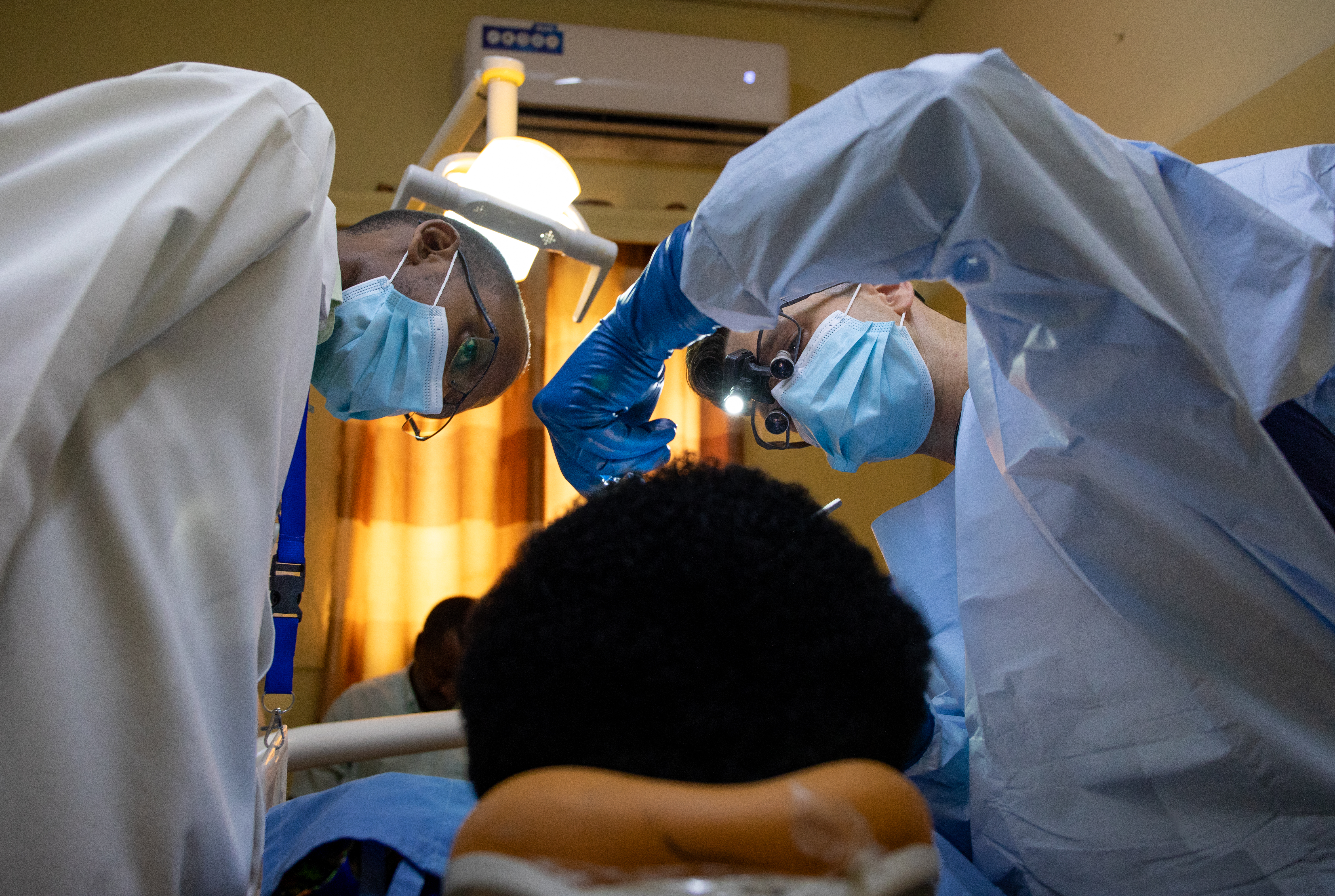 Burundian dentist Guy Ntamagara, left, and U.S. Army Maj. Frederick Dawson, a comprehensive dentist (63B) assigned to the 30th Medical Brigade, left, examines a Burundian patient’s teeth during the medical readiness exercise (MEDREX) in Bujumbura, Burundi, July 22, 2024. MEDREX is a medical readiness exercise, planned and executed by U.S. Army Southern European Task Force, Africa (SETAF-AF), enabling military health professionals from the U.S. and their African partners to exchange medical practices, procedures and techniques that enhance treatment capabilities and result in lasting relationships between the participants. (U.S. Army photo by 1st Lt. Katherine Sibilla)