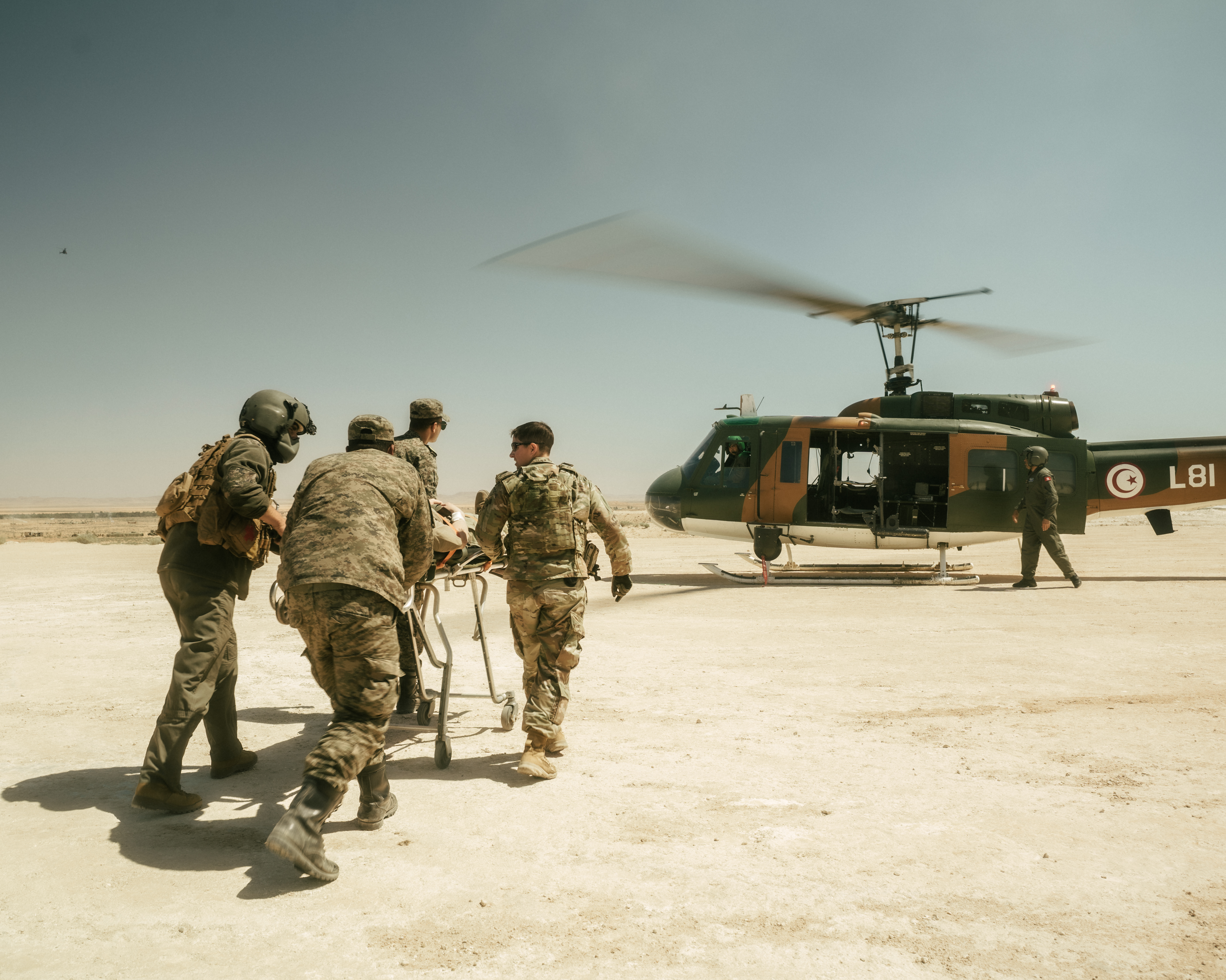 U.S. Army Soldiers assigned to the the U.S. Army Reserve’s 933rd Forward Resuscitative Surgical Company, 5th Medical Brigade, 3rd Medical Command (Deployment Support), successfully executed a medical evacuation (MEDEVAC) evaluation alongside Tunisian medical personnel as part of the multi-national exercise African Lion 2025 (AL25) at Ben Ghilouf Training Area, Tunisia, April 24, 2025. This critical evaluation aimed to ensure that MEDEVAC procedures are effectively in place for rapid care in the event of injured service members during live-fire exercises. AL25 is set to be the largest annual military exercise in Africa, bringing together over 40 nations, including seven NATO allies and 10,000 troops to conduct realistic, dynamic and collaborative training in an austere environment that intersects multiple geographic and functional combatant commands. Led by U.S. Army Southern European Task Force, Africa (SETAF-AF) on behalf of the U.S. Africa Command, AL25 takes place from April 14 to May 23, 2025, across Ghana, Morocco, Senegal and Tunisia. This large-scale exercise will enhance our ability to work together in complex, multi-domain operations—preparing forces to deploy, fight and win. (U.S. Army photo by Sgt. Jose Lora)