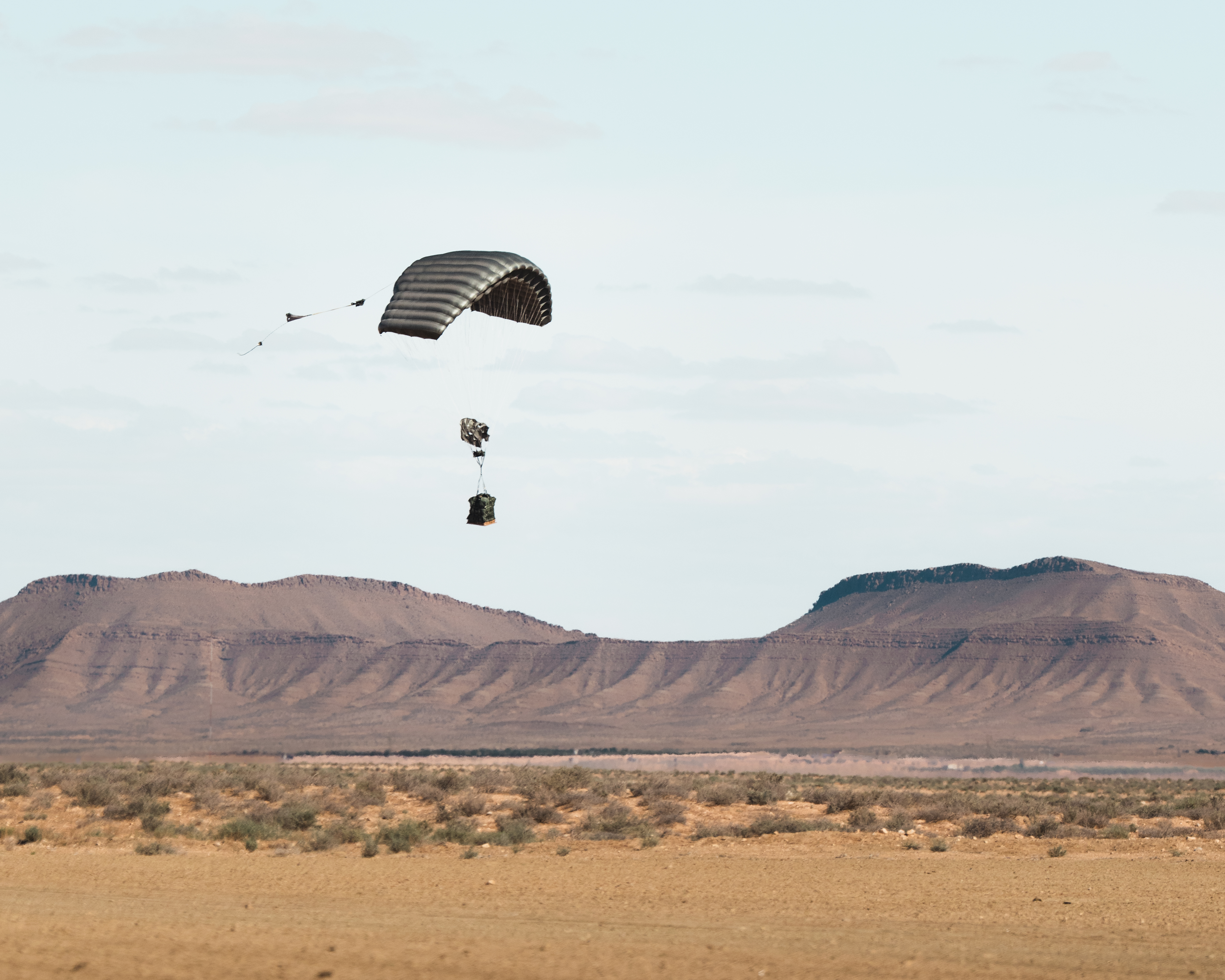 A joint precision airdrop system (JPADS) descends from the sky while carrying Class I (CL I) supplies during an airborne operation as part of exercise African Lion 2025 (AL25), Ben Ghilouf Training Area, Tunisia, April 22, 2025. The airdrop mission conducted by Kilo Company, 173rd Brigade Support Battalion (Airborne), 173rd Airborne Brigade, involved the precise delivery of five container delivery systems (CDS), including two JPADS carrying essential CL I supplies, marking a significant milestone for the unit. AL25 is set to be the largest annual military exercise in Africa, bringing together over 40 nations, including seven NATO allies and 10,000 troops to conduct realistic, dynamic and collaborative training in an austere environment that intersects multiple geographic and functional combatant commands. Led by U.S. Army Southern European Task Force, Africa (SETAF-AF) on behalf of the U.S. Africa Command, AL25 takes place from April 14 to May 23, 2025, across Ghana, Morocco, Senegal, and Tunisia. This large-scale exercise will enhance our ability to work together in complex, multi-domain operations—preparing forces to deploy, fight and win. (U.S. Army photo by Sgt. Mariah Y. Gonzalez)