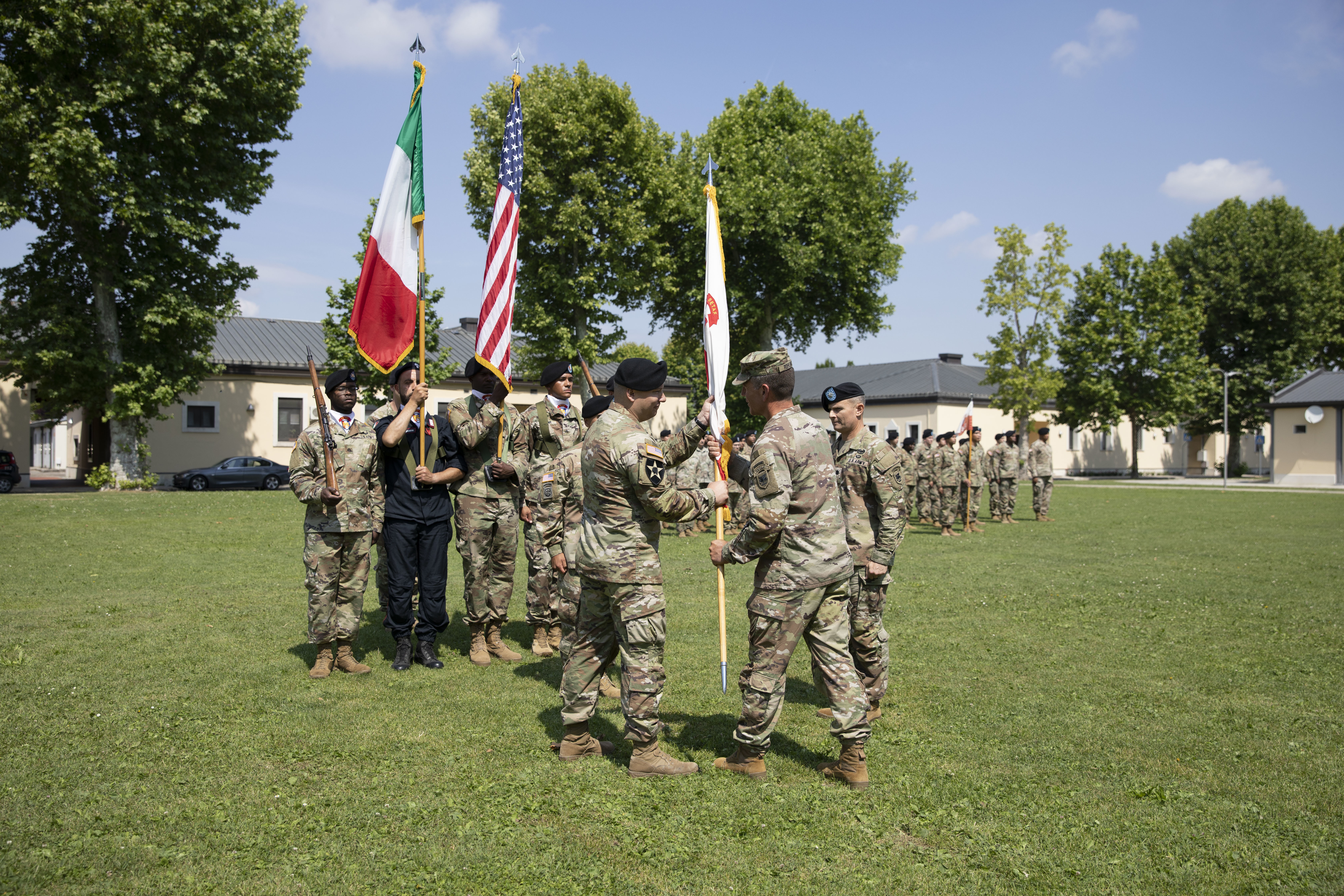 Members of Headquarters Support Company and Intelligence and Sustainment Company stand in formation at the start of the Headquarters and Headquarters Battalion Change of Command ceremony May 31, 2022 in Vicenza, Italy. The Change of Command ceremony is a military tradition that represents a transfer of authority and responsibility for a unit or command.