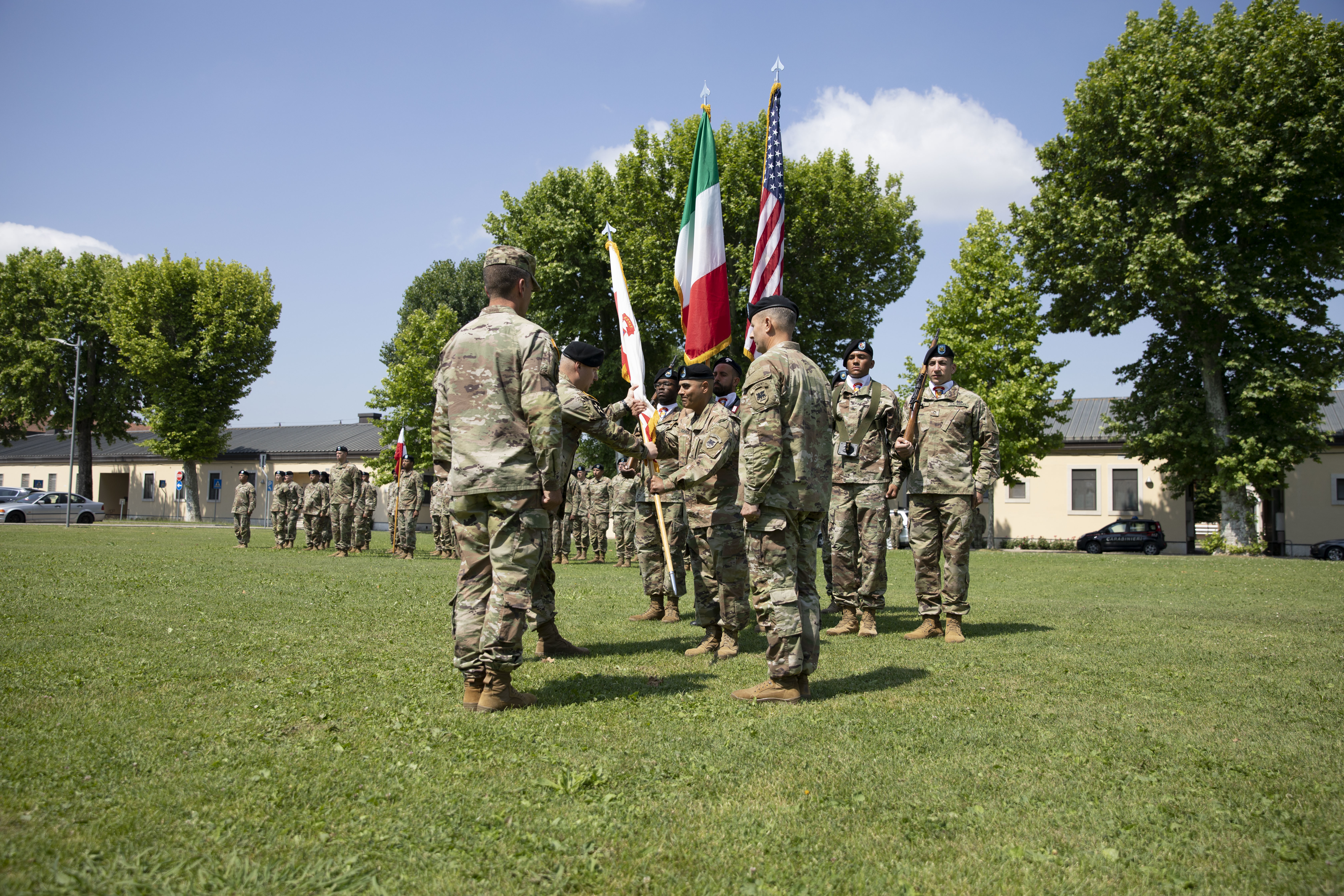 Lt. Col. Corbett Baxter, incoming commander of Headquarters and Headquarters Battalion passes the colors back to Command Sgt. Maj. Salvador Garcia Garcia, Headquarters and Headquarters Battalion Command Sergeant Major during the Change of Command Ceremony May 31, 2022 in Vicenza, Italy. The Change of Command ceremony is a military tradition that represents a transfer of authority and responsibility for a unit or command.