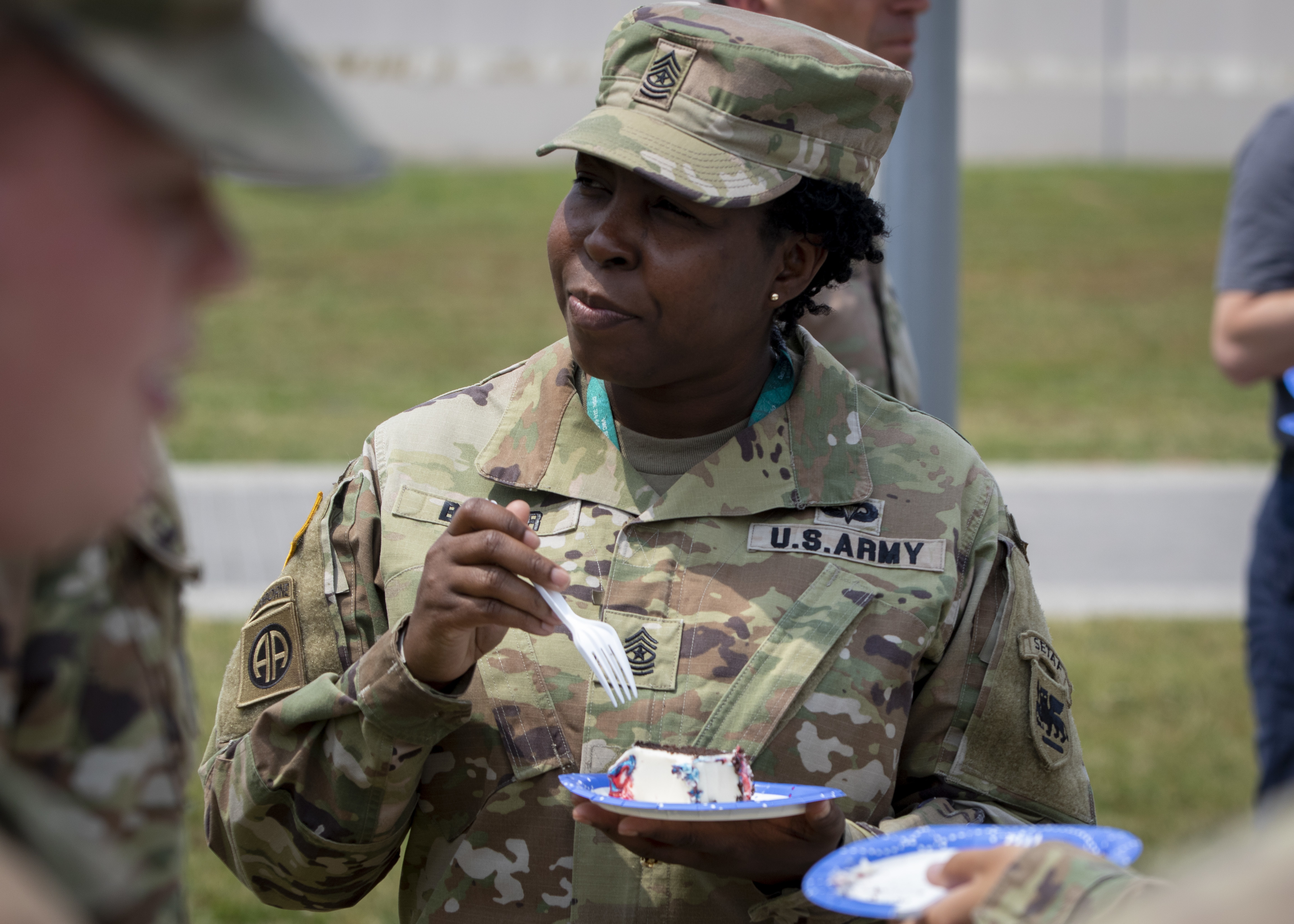 U.S. Army Southern European Task Force, Africa (SETAF-AF) Sergeant Major Sue-Ellyn Baker enjoys a slice of cake during the U.S. Army Southern European Task Force, Africa (SETAF-AF) U.S. Army Heritage Month and Birthday Commemoration held on Caserme Del Din, Vicenza, Italy on June 2, 2022. The Army Heritage Month commemorates all who have answered the call to service sine the Army's founding in 1775. (U.S. Army photo by Chris House)