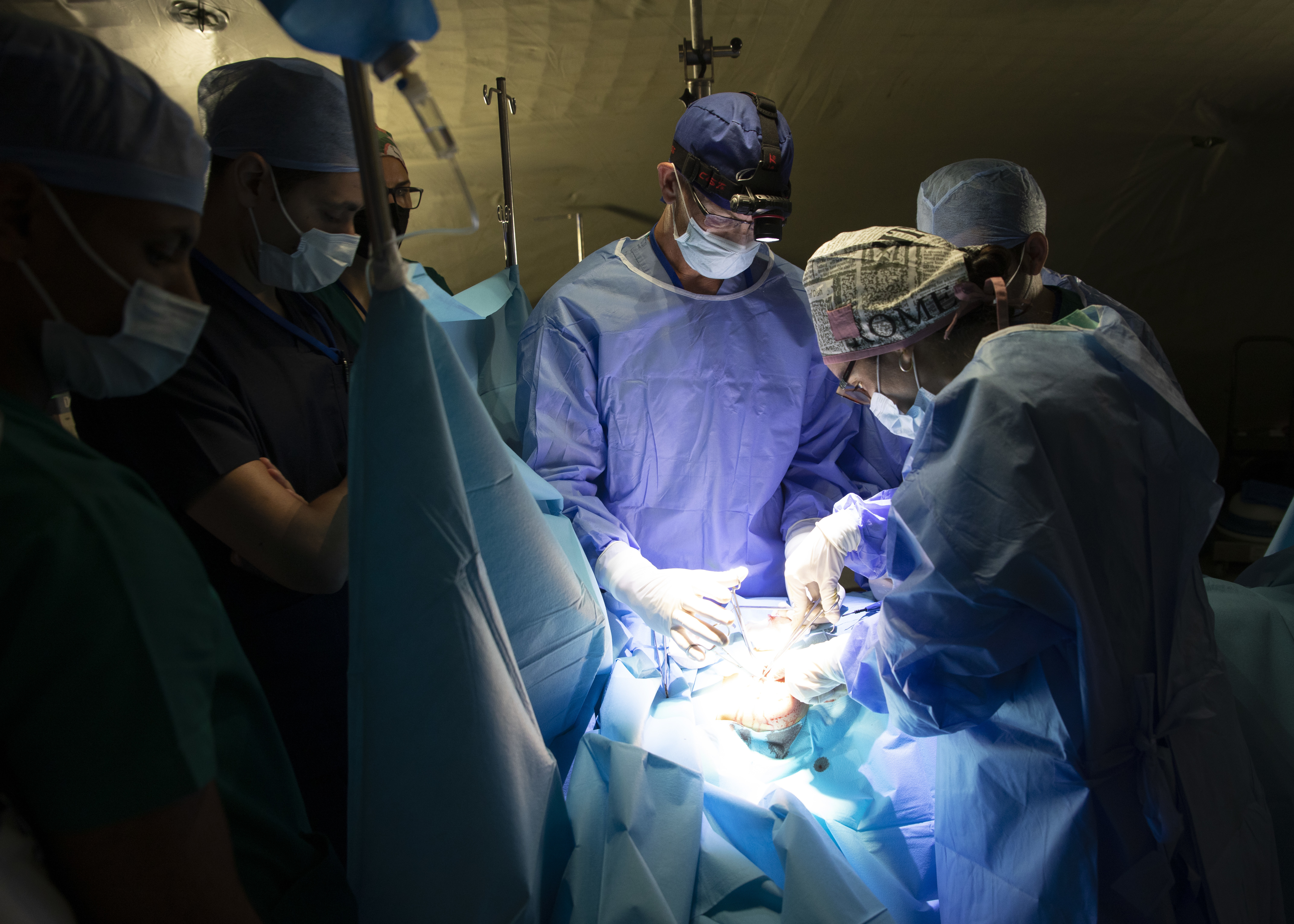 U.S. Air Force and Royal Moroccan Armed Forces medical providers perform a lumpectomy at the Military Medical Surgical Field Hospital in Tafraoute, Morocco on June 16, 2021 during African Lion 2021. African Lion 2021 is U.S. Africa Command's largest, premier, joint, annual exercise hosted by Morocco, Tunisia, and Senegal, 7-18 June. More than 7,000 participants from nine nations and NATO train together with a focus on enhancing readiness for U.S. and partner nation forces. African Lion 21 is multi-domain, multi-component, and multinational exercise, which employs a full array of mission capabilities with the goal to strengthen interoperability among participants. (U.S. Air National Guard photo by Tech. Sgt. Annie Edwards)