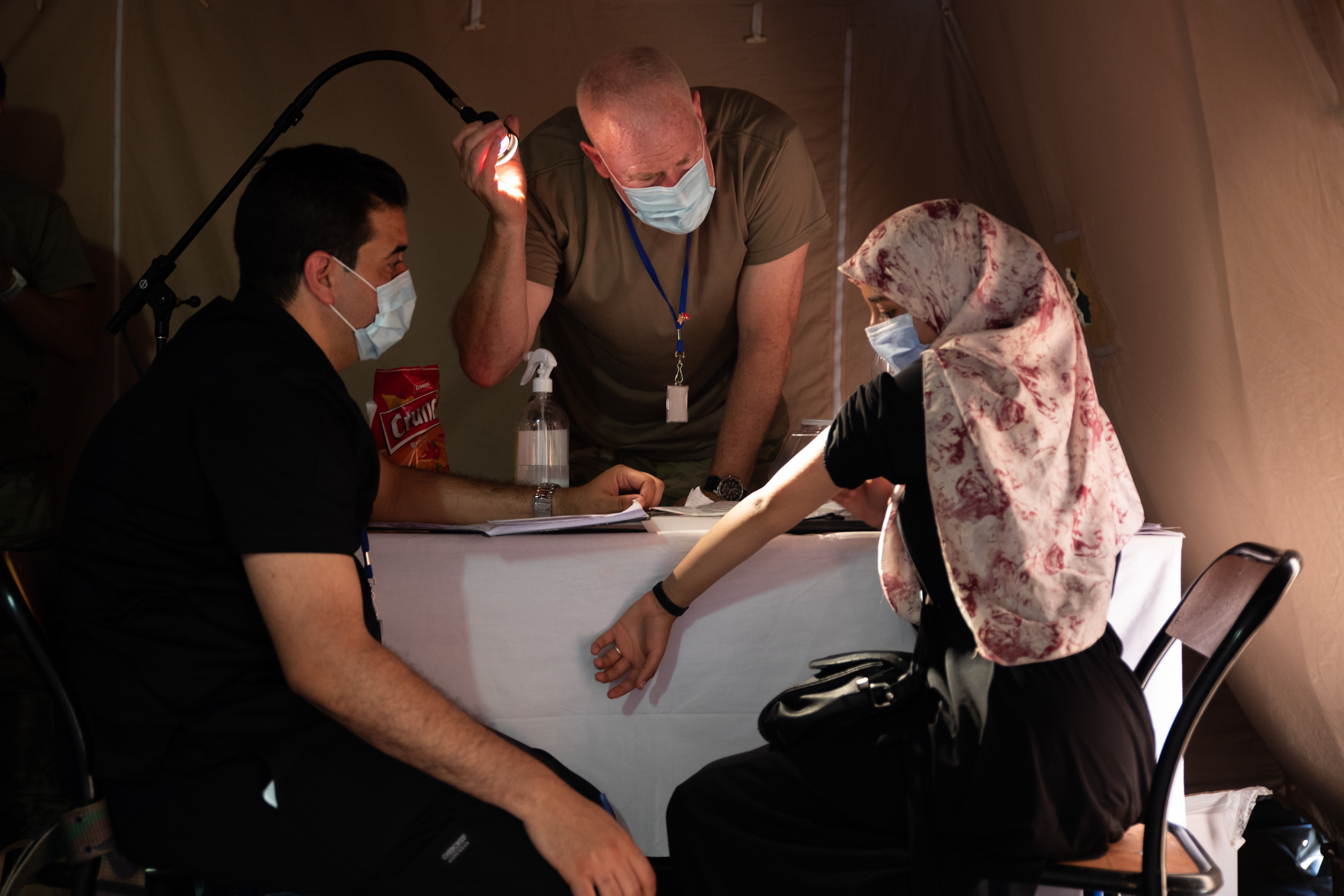 U.S. Air Force Lt. Col. David Brown, a medical provider assigned to the 151st Medical Group Det. 1, Utah Air National Guard examines a patient during exercise African Lion 2021 June 14, 2021, at the Military Medical Surgical Field Hospital in Tafraoute, Morocco. African Lion 2021 is U.S. Africa Command's largest, premier, joint, annual exercise hosted by Morocco, Tunisia, and Senegal, 7-18 June. More than 7,000 participants from nine nations and NATO train together with a focus on enhancing readiness for U.S. and partner nation forces. African Lion 21 is multi-domain, multi-component, and multinational exercise, which employs a full array of mission capabilities with the goal to strengthen interoperability among participants. (U.S. Air National Guard photo by Tech. Sgt. Colton Elliott)