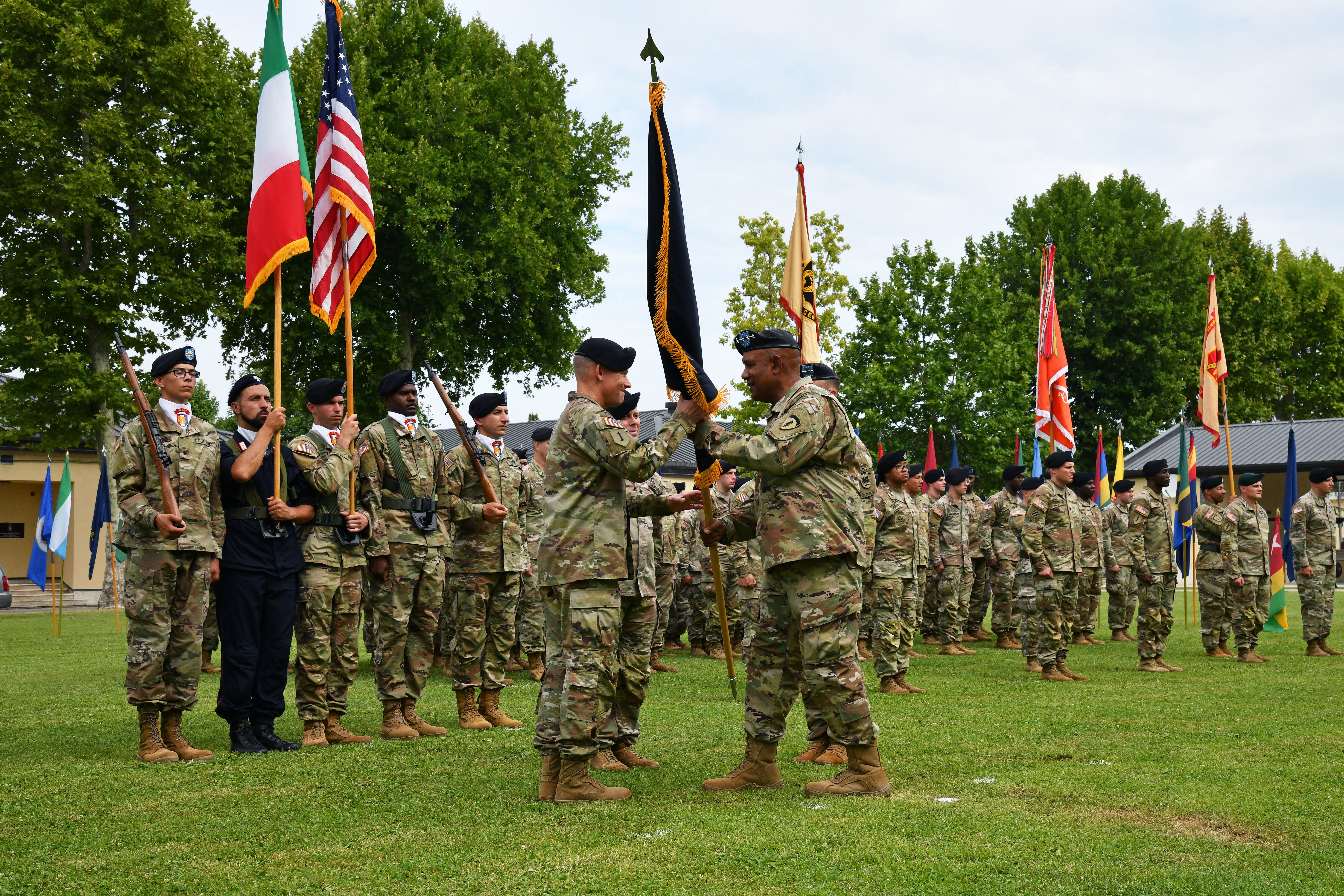 Maj. Gen. Andrew Rohling, commanding general of U.S. Army Southern European Task Force, Africa passes the colors to Lt. Col. Corbett Baxter, incoming commander of Headquarters and Headquarters Battalion during the Change of Command Ceremony May 31, 2022 in Vicenza, Italy. The Change of Command ceremony is a military tradition that represents a transfer of authority and responsibility for a unit or command.