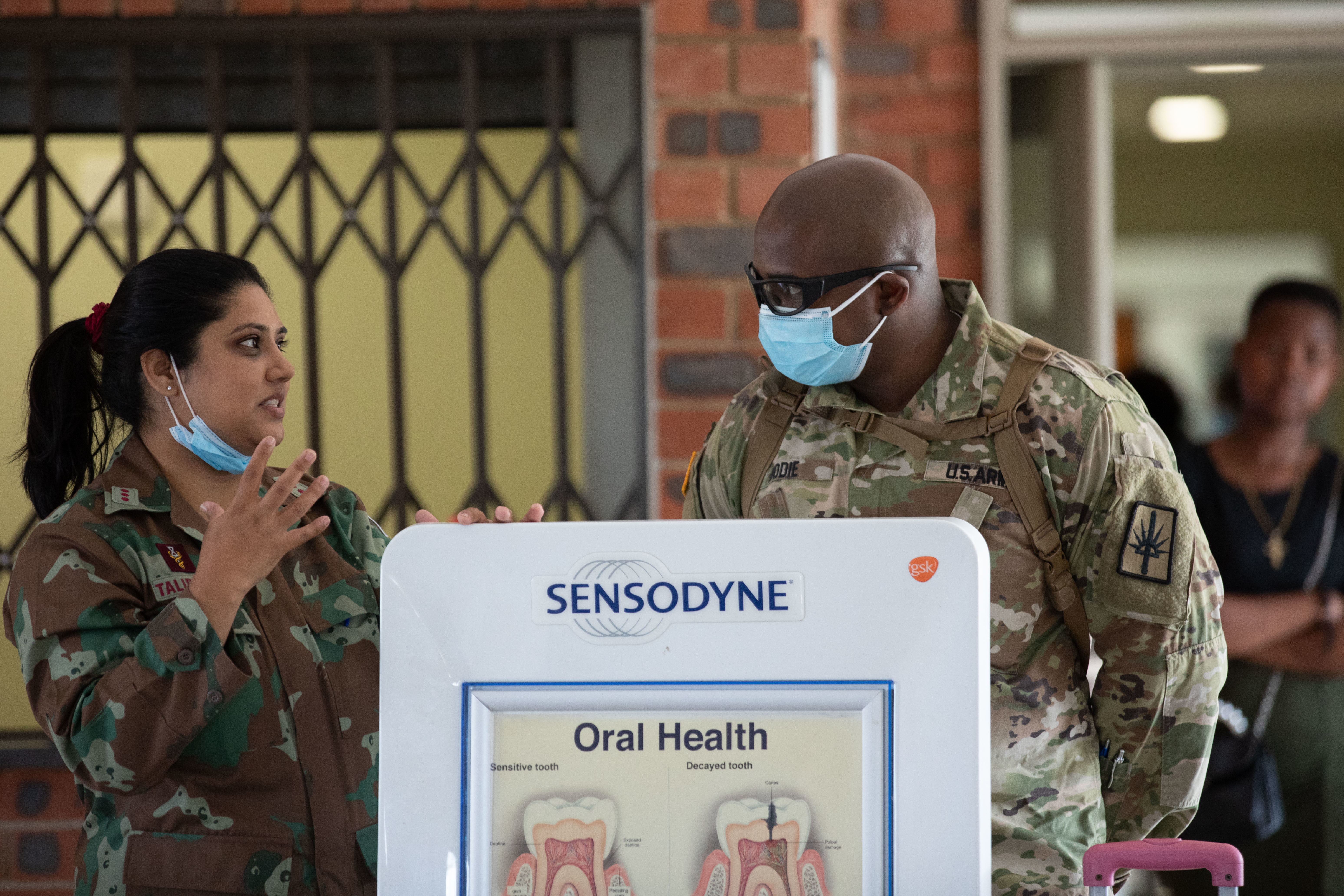Maj. Dwayne Bodie, a dentist with the New York Army National Guard, teams up with a medical professional from the South African National Defense Force to teach dental students at the Buchanana Clinic in Ntambanana, South Africa during the start of Exercise Shared Accord 22 on July 11, 2022. Shared Accord 22 featured a medical readiness exercise, planned and executed by the United States Army Southern European Task Force, Africa and the New York Army National Guard. The medical readiness exercise allowed military medical personnel from the U.S. Army and South African partners to exchange medical practices, procedures and techniques that build and strengthen treatment capabilities, resulting in lasting relationships between medical professionals. (U.S. Army photo by Pfc. Mariajose Licea)