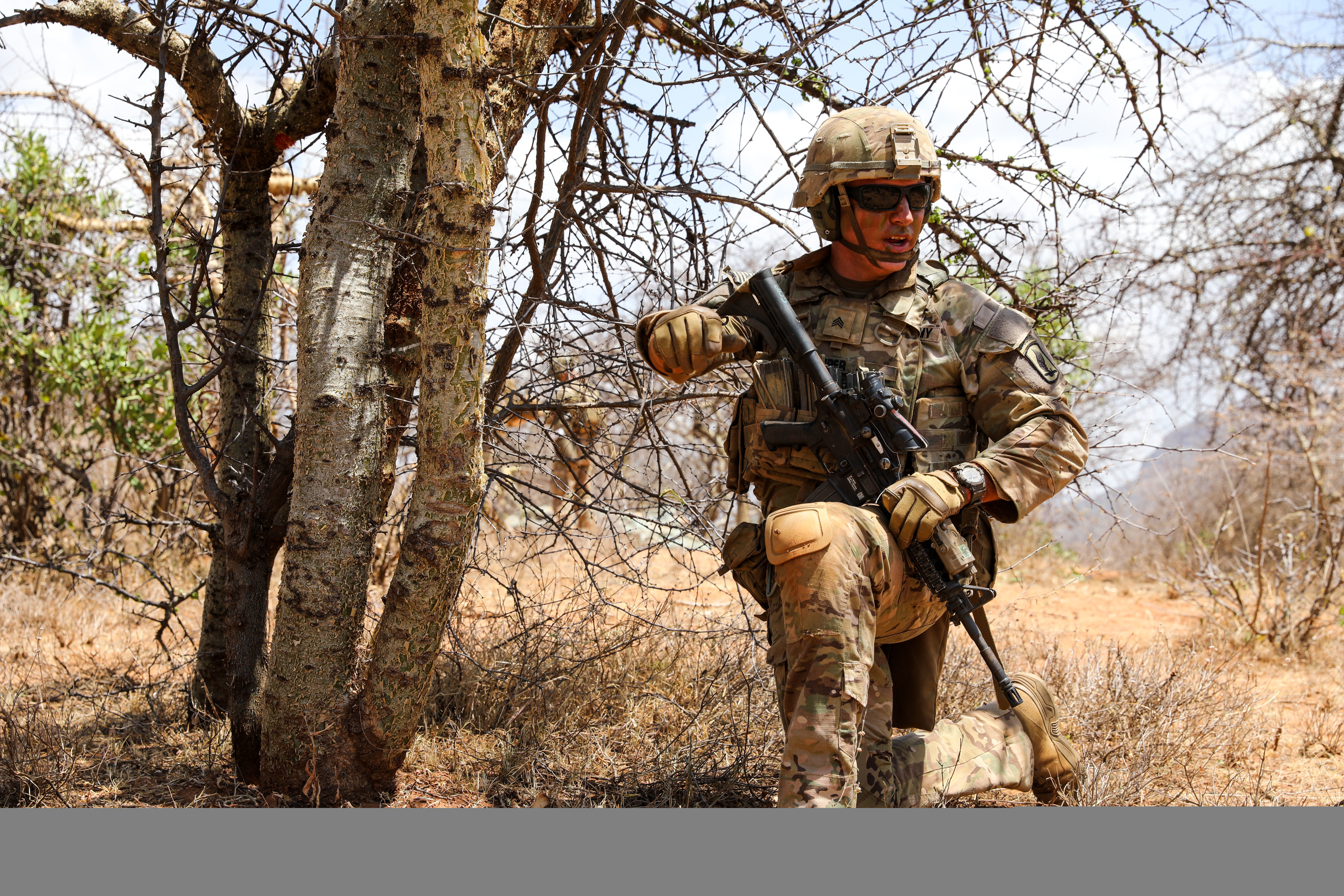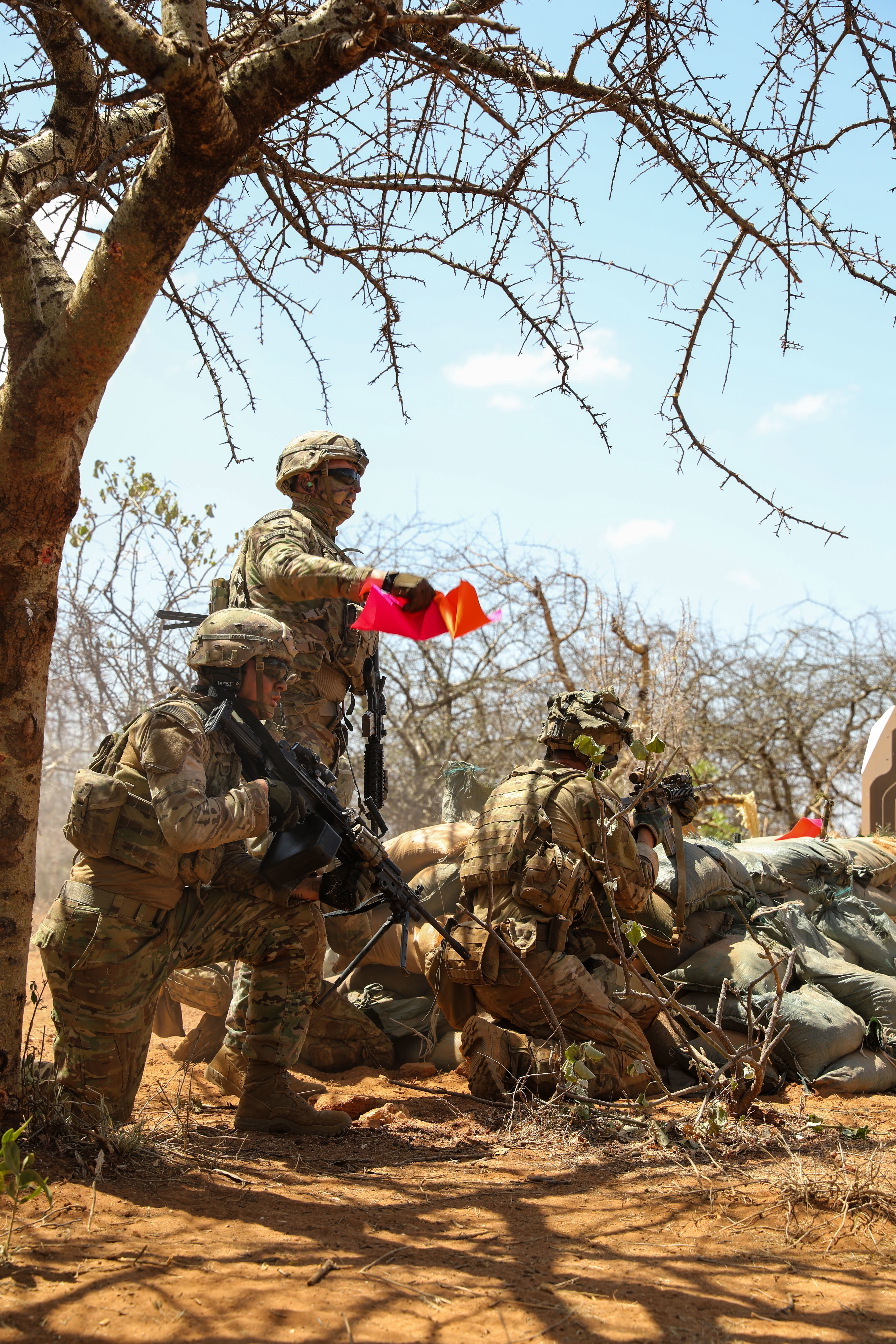 U.S. Army Soldiers with 1st Battalion, 503rd Infantry Regiment, 173rd Airborne Brigade, conduct a live fire training event during Justified Accord, March 9, 2022. Over 800 personnel are currently participating in the exercise representing the U.S., Kenya Defence Forces, allied nations and partners. (U.S. Army photo by Sgt. N.W. Huertas)