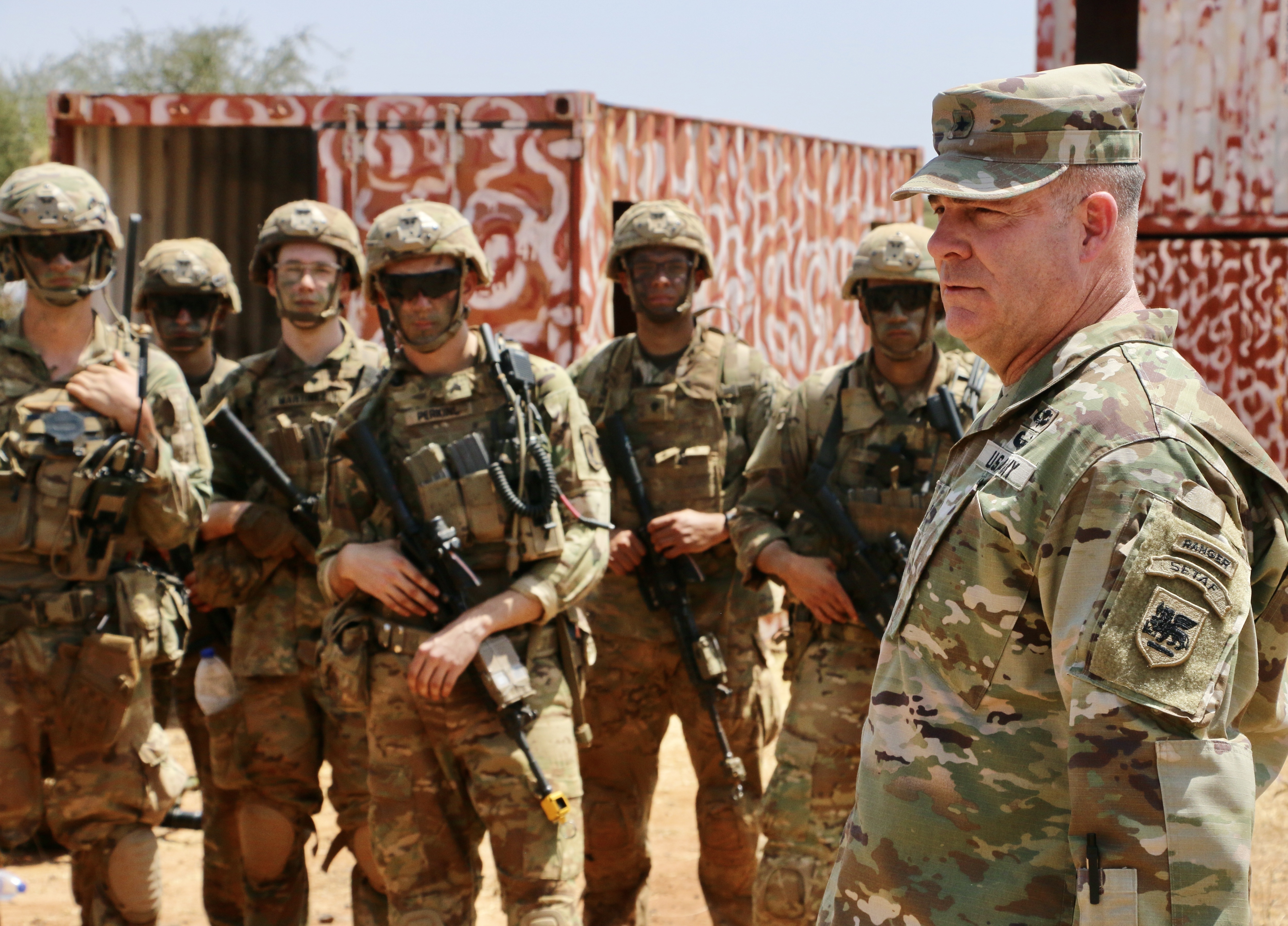 U.S. Army Brig. Gen. Ronald A. Cupples, U.S. Army Southern European Task Force, Africa, deputy commanding general, speaks to U.S. Army Soldiers from 1st Battalion, 503rd Infantry Regiment, 173rd Airborne Brigade, during Justified Accord, March 14, 2022. Exercise Justified Accord allows the US and our African partners to support enduring peace and stability in the region. Over 800 personnel are participating in the exercise which includes a multinational field training exercise and a command post exercise. Justified Accord is an annual and multinational military exercise focusing on African partner capability and interoperability in support of United Nations and Africa Union peace support operations. The exercise, which started on Feb. 28, seeks to improve multinational interoperability and to incorporate regional civilian, police, and military entities into training. (U.S. Army photo by Capt. Abigail Hammock)