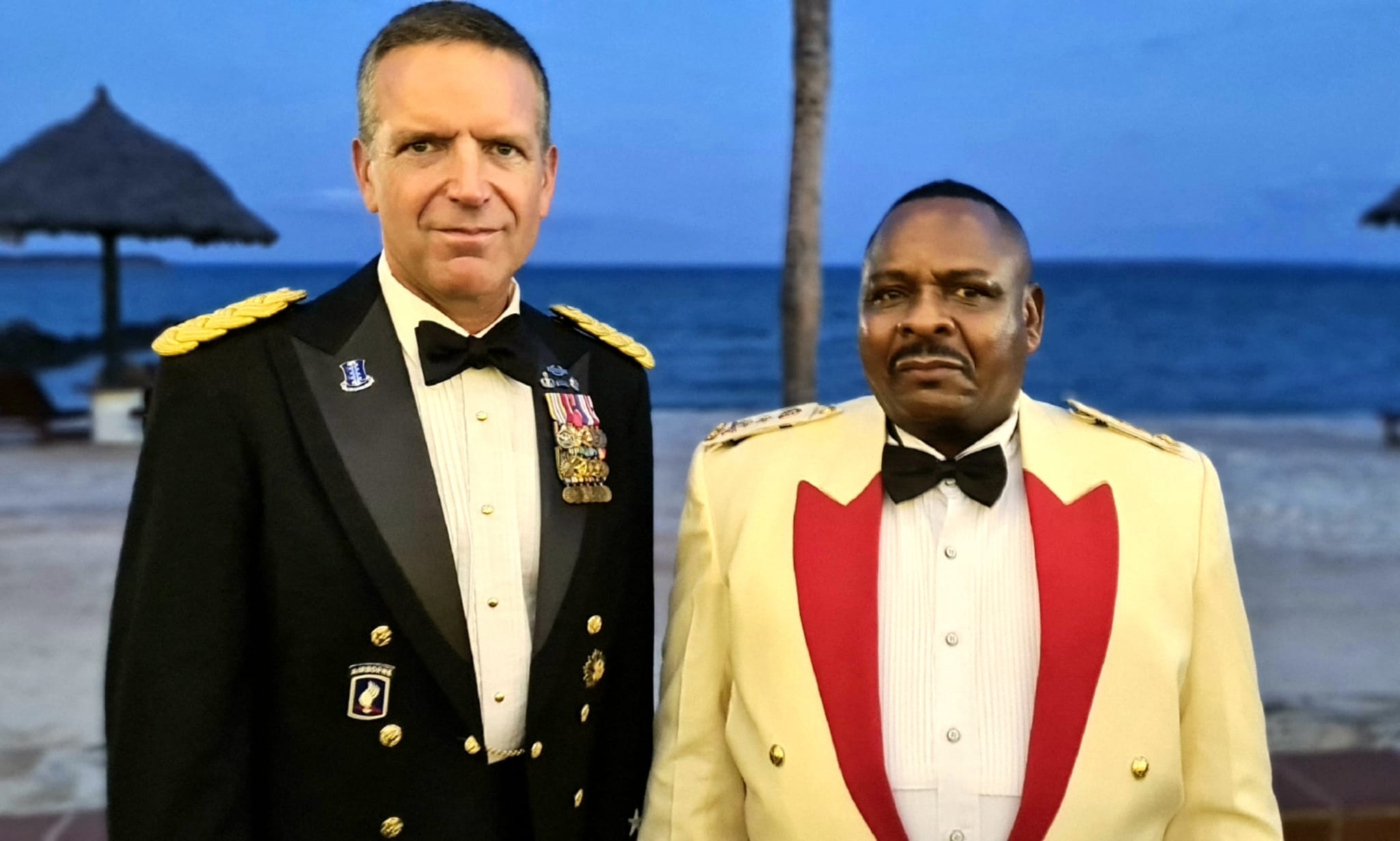 U.S. Army Maj. Gen. Andrew Rohling, commander U.S. Army Southern European Task Force, Africa (left) stands with Maj. Gen. Anthony Sibuti, Tanzania People’s Defence Forces Land force commander (right) at the U.S. Marine Corps Ball in Dar es Salaam Nov. 6. The generals discussed upcoming training opportunities and Sibuti’s recent visit to Washington D.C. at the Association of the U.S. Army’s Annual Meeting. (U.S. Army photo by Col. Ryan S. Dillon)