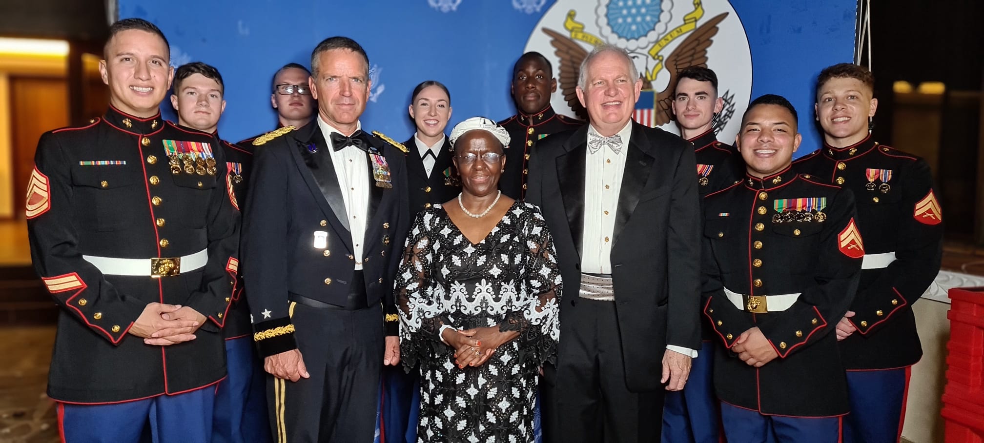 Tanzania Minister of Foreign Affairs Honorable Minister Liberata Mulamula (center) stands with U.S. Ambassador to Tanzania the Honorable Mr. Donald Wright (right), U.S. Army Southern European Task Force, Africa Commander Maj. Gen. Andrew Rohling (left) and U.S. Marines at the U.S. Marine Corps Ball in Dar es Salaam Nov. 6. (U.S. Army photo by Col. Ryan S. Dillon)