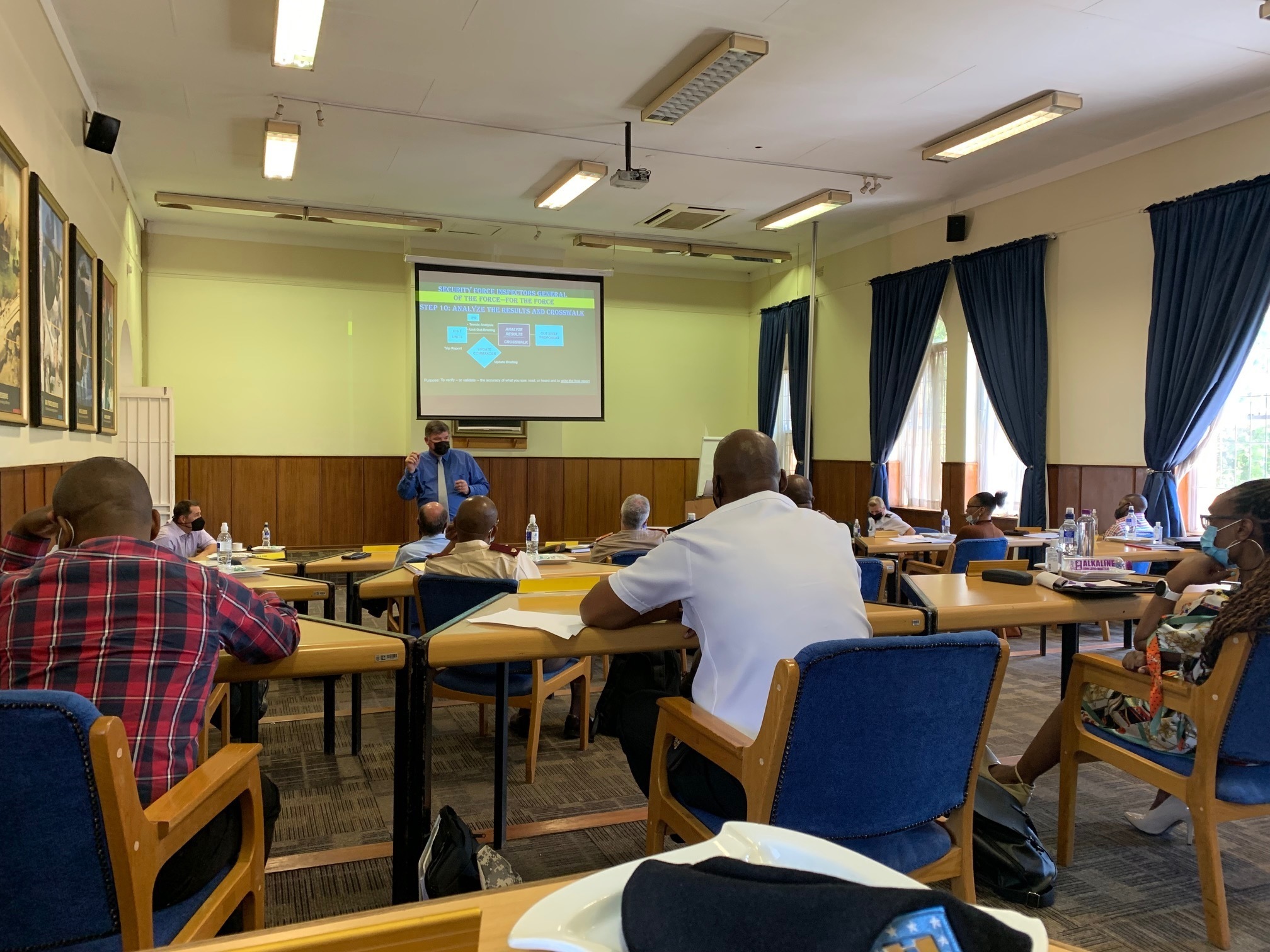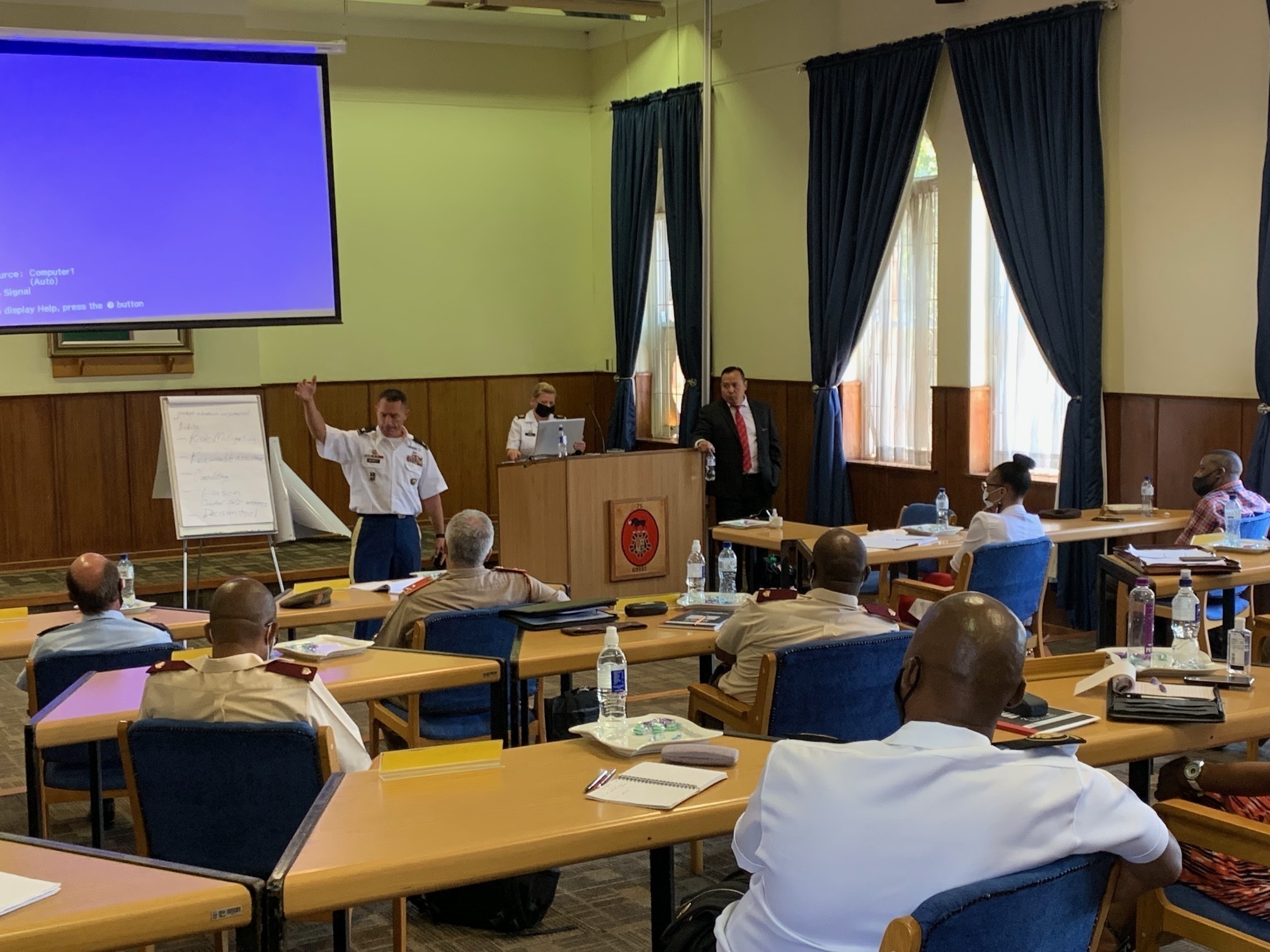Col. Doug Merritt, the U.S. Army Southern European Task Force, Africa command inspector general, discusses the IG inspections process and functions with South African National Defense Force counterparts Oct. 15, 2021. Merrit and other SETAF-AF IG staff joined with South African counterparts to discuss roles, responsibilities, commonalities and differences pertaining to the office of the inspector general. Representatives from the New York National Guard, State Partnership Program partner to South Africa, also attended the weeklong set of meetings. (U.S. Army photo)
