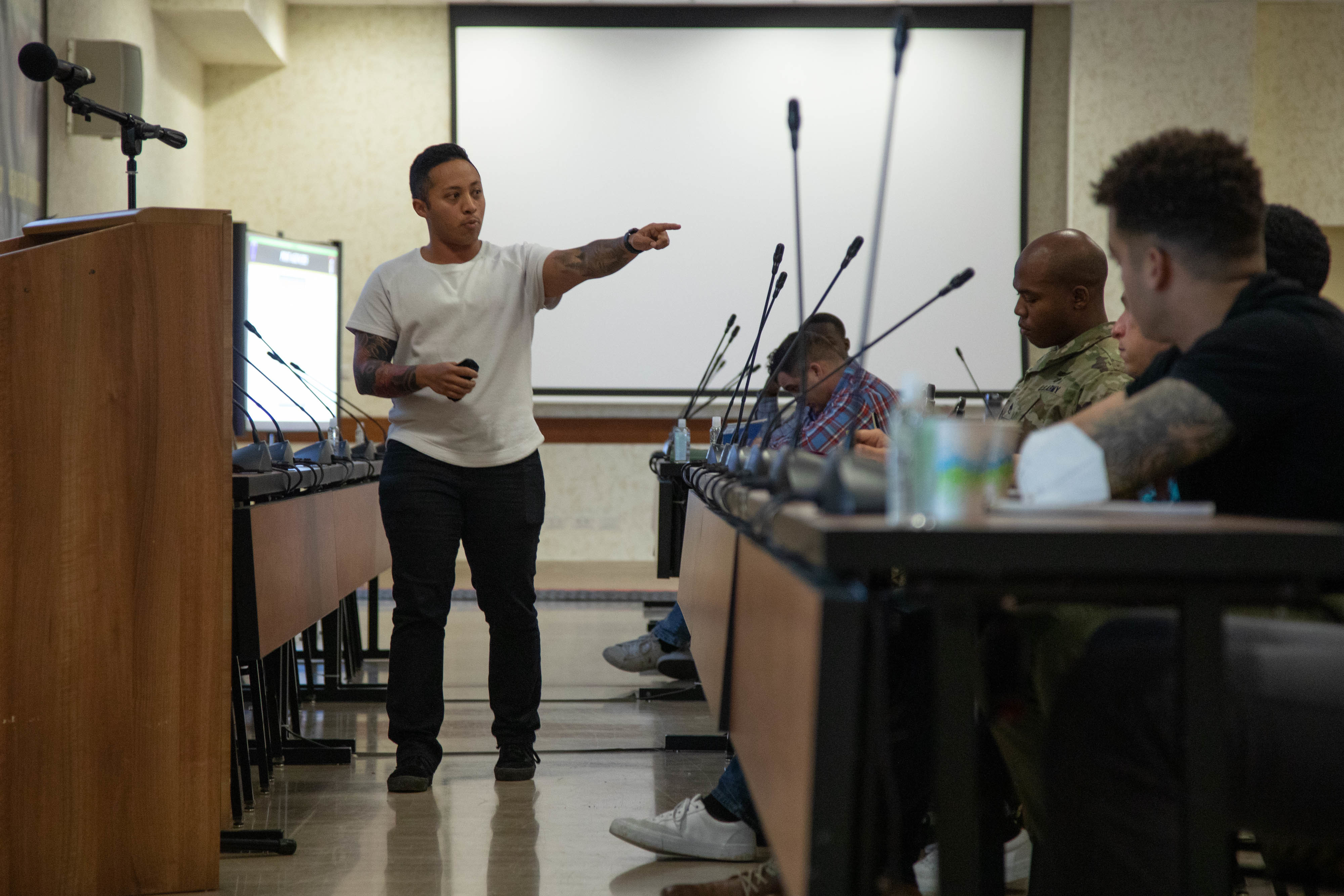 U.S. Army Sgt. Jesse Padilla, U.S. Army Southern European Task Force, Africa B.O.S.S. president, briefs Soldiers at the SETAF-AF Squad Leader Summit at Caserma Del Din, Vicenza, Italy, Nov. 16, 2021. The summit is a leader development program from 16-19 November for junior non-commissioned officers to refine their leadership skills and improve squad readiness. Participants were briefed by on-post agencies and they were able to interact gain knowledge of their community resources. (U.S. Army photo by Sgt. Meleesa Gutierrez)
